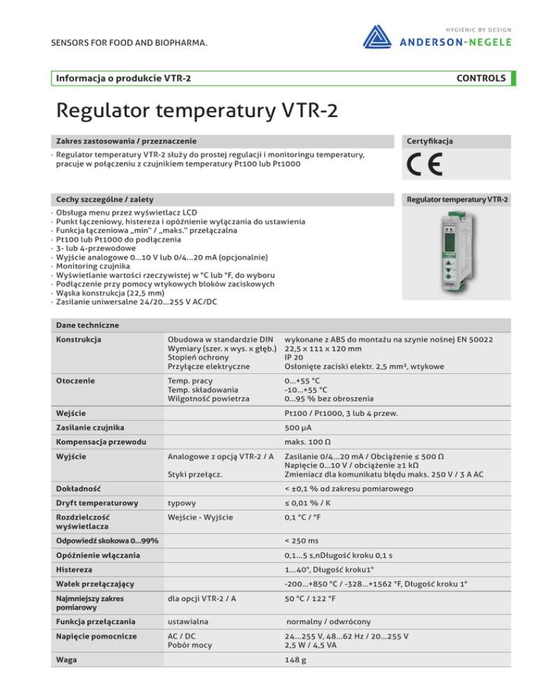 SENSORS FOR FOOD AND BIOPHARMA. Informacja o produkcie VTR-2 CONTROLS Regulator temperatury VTR-2 Zakres zastosowania / przeznaczenie Certyfikacja · RegulatortemperaturyVTR-2służydoprostejregulacjiimonitoringutemperatury, pracujewpołączeniuzczujnikiemtemperaturyPt100lubPt1000 Cechy szczególne / zalety · · · · · · · · · · · Regulator temperatury VTR-2 ObsługamenuprzezwyświetlaczLCD Punktłączeniowy,histerezaiopóźnieniewyłączaniadoustawienia Funkcjałączeniowa„min“/„maks.“przełączalna Pt100lubPt1000dopodłączenia 3-lub4-przewodowe Wyjścieanalogowe0...10Vlub0/4...20mA(opcjonalnie) Monitoringczujnika Wyświetlaniewartościrzeczywistejw°Club°F,dowyboru Podłączenieprzypomocywtykowychblokówzaciskowych Wąskakonstrukcja(22,5mm) Zasilanieuniwersalne24/20...255VAC/DC Dane techniczne Konstrukcja ObudowawstandardzieDIN Wymiary(szer.xwys.xgłęb.) Stopieńochrony Przyłączeelektryczne wykonanezABSdomontażunaszynienośnejEN50022 22,5x111x120mm IP20 Osłoniętezaciskielektr.2,5mm²,wtykowe Otoczenie Temp.pracy Temp.składowania Wilgotnośćpowietrza 0...+55°C -10...+55°C 0...95%bezobroszenia Wejście Pt100/Pt1000,3lub4przew. Zasilanie czujnika 500µA Kompensacja przewodu maks.100Ω Wyjście AnalogowezopcjąVTR-2/A Stykiprzełącz. Dokładność Zasilanie0/4...20mA/Obciążenie≤500Ω Napięcie0...10V/obciążenie≥1kΩ Zmieniaczdlakomunikatubłędumaks.250V/3AAC <±0,1%odzakresupomiarowego Dryft temperaturowy typowy ≤0,01%/K Rozdzielczość wyświetlacza Wejście-Wyjście 0,1°C/°F Odpowiedź skokowa 0...99% <250ms Opóźnienie włączania 0,1...5s,nDługośćkroku0,1s Histereza 1...40°,Długośćkroku1° Wałek przełączający -200...+850°C/-328...+1562°F,Długośćkroku1° Najmniejszy zakres pomiarowy dlaopcjiVTR-2/A 50°C/122°F Funkcja przełączania ustawialna normalny/odwrócony Napięcie pomocnicze AC/DC Pobórmocy 24...255V,48...62Hz/20...255V 2,5W/4,5VA Waga 148g Przyłącze elektryczne | Parametry CONTROLS Widok z boku i z przodu Schemat blokowy 20...255 V DC 24...255 V AC Test funkcjonalny 1. Podłączyć czujnik temperatury lub symulator do wejścia (KL 1 do 4). Zwrócić przy tym uwagę na podłączenie 3- lub 4-przewodowe (zgodnie z konfiguracją oprogramowania). 2. Podłączyć napięcie pomocnicze (KL 9/10). 3. Przy pomocy menu ustawić parametry urządzenia (np. ustawić wartość zadaną SP na 100°C) jak opisano wyżej. 4. Sprawdzić działanie wyjść analogowych poprzez lekkie podwyższanie wzgl. obniżanie sygnału wejściowego w ustawionych granicach. 5. Sprawdzić przy pomocy zmiany sygnału wejścia niezbędną histerezę i opóźnienie przełączania. 6. Odłączyć czujnik i sprawdzić jego funkcję monitoringu. (Zapala się czerwona dioda LED, a obydwa przekaźniki odłączają się po ok. 3-4 sekundach.) 7. Podłączyć ponownie czujnik. Nacisnąć krótko dowolny przycisk. Po ok. 3 sekundach znika komunikat błędu. Informacja Przy temperaturach powyżej 50 °C znacznie pogarsza się kontrast wyświetlacza, aż do całkowitego braku czytelności. Nie pogarsza się przez to funkcjonalność urządzenia. Dla podanego zakresu temperatur roboczych nie występuje uszkodzenie wyświetlacza. Przy obniżeniu temperatury do 50 °C powraca czytelność wyświetlacza. Parametry Kod Funkcja Nastawa Parametry fabryczne Value Punkt przełączenia, Wartość graniczna -200...+850 °C -328...+1562 °F 100 °C Hyst Delay Logic Histereza Opóźnienie przełączania bezpośrednie / odwrócone przełączanie 1...40 ° 0,1...5 s bezpośrednie / odwrócone 2° 0,1 s Direct Input unit Input RTD type Input measure type jednostka temp. rodz. czujnika Technologia przyłączy °C / °F Pt100 / Pt1000 3-przew. / 4-przew. °C Pt100 4-przew. Input range min Input range max Dolny zakres pomiarowy Górny zakres pomiarowy Output Rodzaj wyjścia Save & Exit Zapisz ustawione parametry Cancel Zakończ bez zapisywania Reset Przywołanie parametrów fabrycznych -200...+850 °C -328...+1562 °F -200...+850 °C -328...+1562 °F 0...10 V / 0/4...20 mA 0 °C 200 °C 0...10 V 2 3 Przyłącze elektryczne | Uruchomienie CONTROLS Ustawianie parametru Informacja 1. Naciskać przez 5 sekund przycisk „set”. Pojawia się tekst „press set 5 s for setup”. Urządzenie przestawia się następnie na tryb „SET”. 2. Wybrać żądane parametry przyciskami „up” i „down”. 3. Wcisnąć przycisk „set”. Urządzenie przechodzi w tryb ustawiania na wybrany parametr. 4. Wybrać żądaną wartość przyciskami „up” i „down”. 5. Jeśli wprowadzono żądaną wartość, należy potwierdzić ją przyciskiem „set”. Urządzenie przechodzi do menu głównego. 6. Powtórzyć kroki od punktu 2 do 5 dla wszystkich parametrów, które należy zmienić (patrz schemat menu). 7. Wybrać menu „save and Exit” i potwierdzić przyciskiem „set”. Ustawione parametry zostaną zapamiętane. Urządzenie powraca automatycznie do trybu pracy. Gdy moduł znajduje się w trybie SET, mierzone wartości nie są rejestrowane, a wyjścia przełączające nie są zmieniane. Jeśli w ciągu ok. 30 sekund nie zostanie wciśnięty żaden przycisk, urządzenie wraca automatycznie z powrotem do trybu pracy, a zmieniane do tego momentu parametry zostaną odrzucone. Podobnie jest, gdy opuszcza się tryb SET przez naciśnięcie menu „cancel”. Urządzenie pracuje wówczas z ostatnio zapamiętanymi parametrami. Jeśli tryb SET opuszcza się naciskając menu „Reset”, ładowane są parametry fabryczne. Menüablaufplan SET MODE: Jeśli przez 30 sekund nie przyciska się żadnego przycisku, urządzenie przełącza się automatycznie do trybu pracy. Parametry nie ulegają zmianie. Pozycje menu od 8 do 10: Opcjonalnie VTR-2 / A Save and Exit: Zapisuje wprowadzone parametry na stałe i przełącza z powrotem do trybu pracy. Cancel: Powrót do trybu pracy bez zapisywania parametrów. Reset: Parametry fabryczne zostały załadowane, powrót do trybu pracy. Informacja o produkcie VTR-