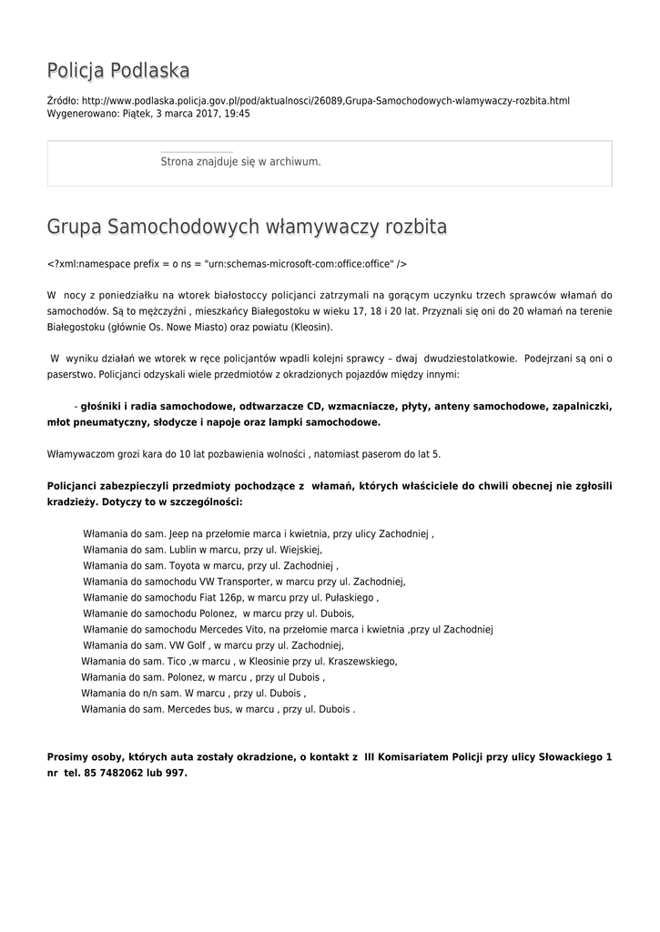 Policja Podlaska Źródło: http://www.podlaska.policja.gov.pl/pod/aktualnosci/26089,Grupa-Samochodowych-wlamywaczy-rozbita.html Wygenerowano: Piątek, 3 marca 2017, 19:45 Strona znajduje się w archiwum. Grupa Samochodowych włamywaczy rozbita <?xml:namespace prefix = o ns = "urn:schemas-microsoft-com:office:office" /> W nocy z poniedziałku na wtorek białostoccy policjanci zatrzymali na gorącym uczynku trzech sprawców włamań do samochodów. Są to mężczyźni , mieszkańcy Białegostoku w wieku 17, 18 i 20 lat. Przyznali się oni do 20 włamań na terenie Białegostoku (głównie Os. Nowe Miasto) oraz powiatu (Kleosin). W wyniku działań we wtorek w ręce policjantów wpadli kolejni sprawcy – dwaj dwudziestolatkowie. Podejrzani są oni o paserstwo. Policjanci odzyskali wiele przedmiotów z okradzionych pojazdów między innymi: - głośniki i radia samochodowe, odtwarzacze CD, wzmacniacze, płyty, anteny samochodowe, zapalniczki, młot pneumatyczny, słodycze i napoje oraz lampki samochodowe. Włamywaczom grozi kara do 10 lat pozbawienia wolności , natomiast paserom do lat 5. Policjanci zabezpieczyli przedmioty pochodzące z włamań, których właściciele do chwili obecnej nie zgłosili kradzieży. Dotyczy to w szczególności: Włamania do sam. Jeep na przełomie marca i kwietnia, przy ulicy Zachodniej , Włamania do sam. Lublin w marcu, przy ul. Wiejskiej, Włamania do sam. Toyota w marcu, przy ul. Zachodniej , Włamania do samochodu VW Transporter, w marcu przy ul. Zachodniej, Włamanie do samochodu Fiat 126p, w marcu przy ul. Pułaskiego , Włamanie do samochodu Polonez, w marcu przy ul. Dubois, Włamanie do samochodu Mercedes Vito, na przełomie marca i kwietnia ,przy ul Zachodniej Włamania do sam. VW Golf , w marcu przy ul. Zachodniej, Włamania do sam. Tico ,w marcu , w Kleosinie przy ul. Kraszewskiego, Włamania do sam. Polonez, w marcu , przy ul Dubois , Włamania do n/n sam. W marcu , przy ul. Dubois , Włamania do sam. Mercedes bus, w marcu , przy ul. Dubois . Prosimy osoby, których auta zostały okradzione, o kontakt z III Komisariatem Policji przy ulicy Słowackiego 1 nr tel. 85 7482062 lub 997. Ocena: 0/5 (0) Tweetnij
