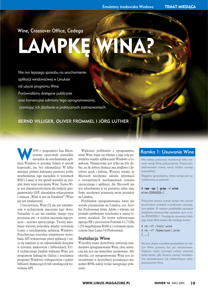 Emulatory środowiska Windows TEMAT MIESIĄCA Wine, Crossover Office, Cedega LAMPKĘ WINA? Nie ma lepszego sposobu na uruchomienie aplikacji windowsowej w Linuksie niż użycie programu Wine. Porównaliśmy dostępne publicznie oraz komercyjne odmiany tego oprogramowania, oceniając ich działanie w praktycznych zastosowaniach. BERND VILLIGER, OLIVER FROMMEL I JÖRG LUTHER W 1993 r. programiści Sun Microsystems opracowali niewielkie narzędzie do uruchamiania aplikacji Windows w systemie Solaris w sposób bezpośredni, tzn. bez rekompilacji. W kilka miesięcy później dokonano pierwszej próby uruchomienia tego narzędzia w systemach BSD i Linux; w ten sposób narodził się projekt, który teraz nosi nazwę Wine. Nazwa Wine jest charakterystycznym dla tradycji oprogramowania GNU akronimem rekursywnym i oznacza „Wine is not an Emulator” (Wine nie jest emulatorem). I rzeczywiście, Wine [1] nie jest emulatorem w technicznym znaczeniu tego słowa. Narzędzie to ani nie emuluje innego typu procesora, ani – w ścisłym znaczeniu tego pojęcia – systemu operacyjnego. Tworzy natomiast warstwę pośrednią między systemem Linux a uruchamianą aplikacją Windows. Przechwytuje wszystkie windowsowe wywołania API wykonywane przez aplikację i stara się zamienić je na odpowiedniki dostępne w systemie uniksowym i bibliotekach X11. Z technicznego punktu widzenia Wine jest programem ładującym (ładuje i uruchamia programy Windows) wzbogaconym o pakiet bibliotek tłumaczących lub emulujących wywołania API. Większość problemów z oprogramowaniem Wine wiąże się właśnie z jego rolą pośrednika między aplikacjami Windows a Linuksem. Tłumaczenie jest tylko na tyle dobre, na ile dobrze tłumacz zna źródłowe i docelowe język i kulturę. Wszyscy wiemy, że Microsoft niechętnie udziela informacji o wewnętrznych mechanizmach systemu operacyjnego i aplikacji. Ale Microsoft nie jest odosobniony w tej postawie; także inne firmy niechętnie przenoszą swoje produkty na Linuksa. Przykładem oprogramowania, które nie zostało przeniesione na Linuksa, jest Acrobat Professional firmy Adobe i właśnie ten produkt spróbujemy uruchomić w naszej testowej instalacji. Do testów wykorzystano laptopa HP z procesorem Pentium 4 1,7 GHz i 256 megabajtami RAM-u i systemem operacyjnym Suse Linux 9.0 Professional. Ramka 1: Usuwanie Wine Nie należy próbować instalować kilku różnych wersji Wine jednocześnie. Przed zainstalowaniem nowej wersji trzeba usunąć poprzednią. Najpierw sprawdzamy, która wersja jest zainstalowana w systemie: # rpm -qa | grep -i wine wine-20040505-1 Polecenie zwraca numer wersji i ten numer powinniśmy umieścić w poleceniu usuwającym pakiet. W naszym przykładzie usunięcie programu oznacza więc wpisanie: rpm -e wine-20040505-1. Następnie usuwamy katalogi, które Wine tworzy dla każdego konta: # rm -rf /root/.wine # rm -rf /home/user/.wine [...] Instalacja Wine Wszystkie znane dystrybucje zawierają standardowo oprogramowanie Wine, choć zazwyczaj nie jest ono domyślnie instalowane. Aby określić, czy oprogramowanie Wine jest zainstalowane w dystrybucji posiadającej menedżer RPM, należy wydać następujące polecenie: WWW.LINUX-MAGAZINE.PL Na tym etapie wszystkie pozostałości po starym Wine powinny być już wykasowane. Opisane wyżej czynności należy wykonać także wtedy, gdy chcemy usunąć niewłaściwie zainstalowane lub niedziałające oprogramowanie Wine. NUMER 16 MAJ 2005 19 TEMAT MIESIĄCA Emulatory środowiska Windows rpm -qa | grep -i wine Jeśli pakiet Wine jest zainstalowany, powinniśmy zobaczyć komunikat w rodzaju wine-20040505-1 (Suse 9.0) lub wine-200408137 (Suse 9.2). Jak widać, w przypadku oprogramowania Wine numerem wersji jest po prostu data wydania. W razie zlokalizowania w systemie starszej wersji, warto uaktualnić ją do ostatnie- go wydania (2005). Nie jest to trudne, a ponadto nowa wersja najczęściej dostarczana jest w gotowej do używania konfiguracji. Jednak żeby uniknąć problemów, musimy pamiętać o odinstalowaniu poprzedniej wersji Wine (Ramka 1, „Usuwanie Wine”). Instalacja również nie powinna przedstawiać trudności. Najpierw pobieramy bieżący pakiet (ok. 12 MB) z serwisu WineHQ [2]. Następnie jako root wydajemy następujące polecenia (przykład dla Suse 9.0): #rpm -ivh wine-20050111-U SuSELinux90.i586.rpm Preparing... U ######################## [100%] 1:wine... ########################U [100%] Dodatkowym efektem powyższego polecenia jest także skonfigurowanie oprogramowania Wine. Aby przejrzeć lub zmodyfikować ustawienia, wystarczy uruchomić narzędzie winecfg, które umożliwia m.in. przejrzenie i zmodyfikowanie liter przypisanych napędom. Instalujemy aplikacje Windows Możemy przejść do zainstalowania pierwszej aplikacji Windows. Na potrzeby testu wybraliśmy popularną aplikację, która nie jest oficjalnie obsługiwana przez oprogramowanie Wine: Adobe Acrobat 5. Jako źródło oprogramowania stosujemy dysk CD. W testowym systemie napęd CD-ROM ma literę „Z:”, więc proces instalacji uruchamiamy poleceniem: wine 'Z:\media\cdrom\Acrobat 5\U Setup.exe' Rysunek 1: Osobliwy widok: instalator oprogramowania Windows pod Linuksem. Pamiętamy o windowsowym sposobie zapisu ścieżki (nazwa napędu i odwrotne ukośniki). Ścieżka musi być umieszczona w parze apostrofów lub cudzysłowie, w przeciwnym razie powłoka niewłaściwie zinterpretuje występujące w ścieżce odstępy. Instalacja programu Adobe Acrobat (Rysunek 1) zajęła nam ok. 15 minut, a przecież to tylko jedna aplikacja. Ale warto było czekać. Po zainstalowaniu programu wystarczyło wydać polecenie wine 'C:\Program Files\Adobe\U Acrobat.exe' Rysunek 2: Adobe Acrobat, choć nieobsługiwany oficjalnie przez Wine, współpracuje z Linuksem. 20 NUMER 16 MAJ 2005 WWW.LINUX-MAGAZINE.PL Jak widać na Rysunku 2, aplikacja Adobe Acrobat zadziałała. Trzeba przyznać, że nie z wszystkimi aplikacjami poszło tak dobrze. Pró