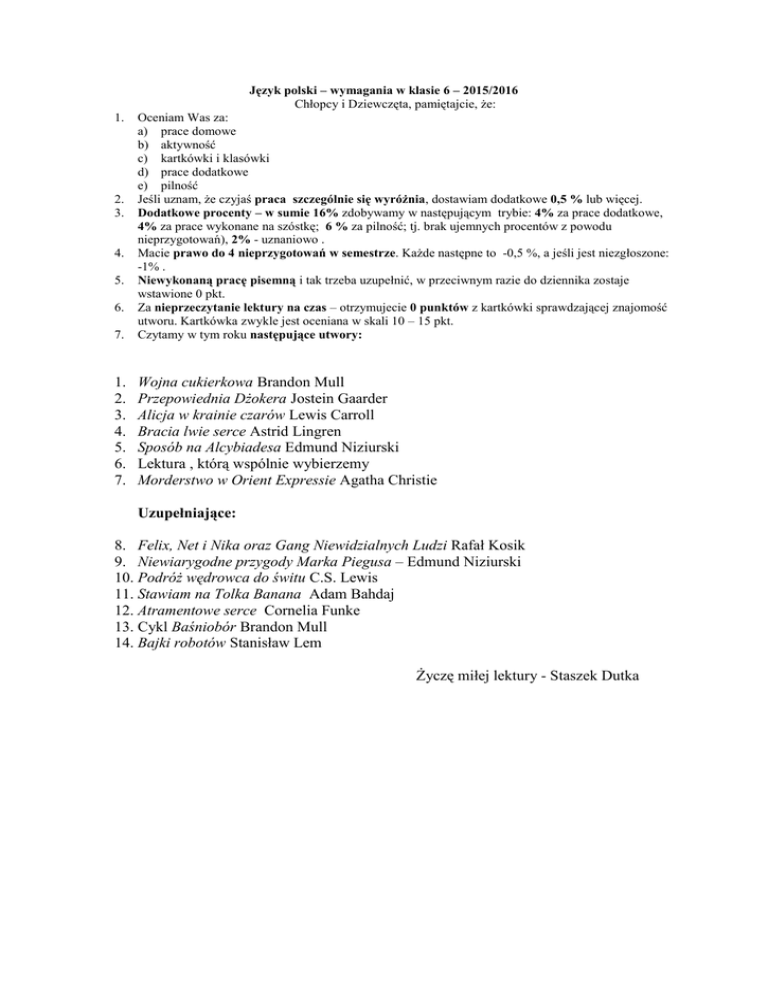 Język polski – wymagania w klasie 6 – 2015/2016 Chłopcy i Dziewczęta, pamiętajcie, że: 1. 7. Oceniam Was za: a) prace domowe b) aktywność c) kartkówki i klasówki d) prace dodatkowe e) pilność Jeśli uznam, że czyjaś praca szczególnie się wyróżnia, dostawiam dodatkowe 0,5 % lub więcej. Dodatkowe procenty – w sumie 16% zdobywamy w następującym trybie: 4% za prace dodatkowe, 4% za prace wykonane na szóstkę; 6 % za pilność; tj. brak ujemnych procentów z powodu nieprzygotowań), 2% - uznaniowo . Macie prawo do 4 nieprzygotowań w semestrze. Każde następne to -0,5 %, a jeśli jest niezgłoszone: -1% . Niewykonaną pracę pisemną i tak trzeba uzupełnić, w przeciwnym razie do dziennika zostaje wstawione 0 pkt. Za nieprzeczytanie lektury na czas – otrzymujecie 0 punktów z kartkówki sprawdzającej znajomość utworu. Kartkówka zwykle jest oceniana w skali 10 – 15 pkt. Czytamy w tym roku następujące utwory: 1. 2. 3. 4. 5. 6. 7. Wojna cukierkowa Brandon Mull Przepowiednia Dżokera Jostein Gaarder Alicja w krainie czarów Lewis Carroll Bracia lwie serce Astrid Lingren Sposób na Alcybiadesa Edmund Niziurski Lektura , którą wspólnie wybierzemy Morderstwo w Orient Expressie Agatha Christie 2. 3. 4. 5. 6. Uzupełniające: 8. Felix, Net i Nika oraz Gang Niewidzialnych Ludzi Rafał Kosik 9. Niewiarygodne przygody Marka Piegusa – Edmund Niziurski 10. Podróż wędrowca do świtu C.S. Lewis 11. Stawiam na Tolka Banana Adam Bahdaj 12. Atramentowe serce Cornelia Funke 13. Cykl Baśniobór Brandon Mull 14. Bajki robotów Stanisław Lem Życzę miłej lektury - Staszek Dutka