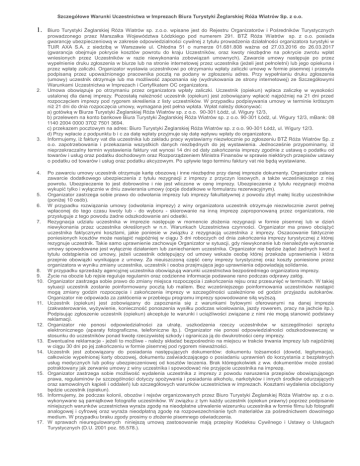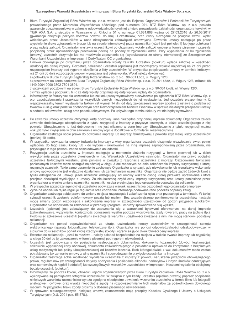 Szczegółowe Warunki Uczestnictwa w Imprezach Biura Turystyki Żeglarskiej Róża Wiatrów Sp. z o.o. 1. 2. 3. 4. 5. 6. 7. 8. 9. 10. 11. 12. 13. 14. 15. 16. 17. Biuro Turystyki Żeglarskiej Róża Wiatrów sp. z.o.o. wpisane jest do Rejestru Organizatorów i Pośredników Turystycznych prowadzonego przez Marszałka Województwa Łódzkiego pod numerem 291. BTŻ Róża Wiatrów sp. z o.o. posiada gwarancję ubezpieczeniową w zakresie odpowiedzialności cywilnej z tytułu prowadzenia działalności organizatora turystyki w TUiR AXA S.A. z siedzibą w Warszawie ul. Chłodna 51 o numerze 01.681.808 ważna od 27.03.2016 do 26.03.2017 (gwarancja obejmuje pokrycie kosztów powrotu do kraju Uczestników, oraz kwoty niezbędne na pokrycie zwrotu wpłat wniesionych przez Uczestników w razie niewykonania zobowiązań umownych). Zawarcie umowy następuje po przez wypełnienie druku zgłoszenia w biurze lub na stronie internetowej przez uczestnika (jeżeli jest pełnoletni) lub jego opiekuna i przez wpłatę zaliczki. Organizator wystawia uczestnikowi po otrzymaniu wpłaty zaliczki umowę w formie pisemnej i przesyła podpisaną przez upoważnionego pracownika pocztą na podany w zgłoszeniu adres. Przy wypełnianiu druku zgłoszenia (umowy) uczestnik otrzymuje lub ma możliwość zapoznania się (wydrukowania ze strony internetowej) ze Szczegółowymi Warunkami Uczestnictwa w Imprezach i Certyfikatem OC organizatora. Umowa obowiązuje po otrzymaniu przez organizatora wpłaty zaliczki. Uczestnik (opiekun) wpłaca zaliczkę w wysokości ustalonej dla danej imprezy. Pozostałą należność uczestnik (opiekun) jest zobowiązany wpłacić najpóźniej na 21 dni przed rozpoczęciem imprezy pod rygorem skreślenia z listy uczestników. W przypadku podpisywania umowy w terminie krótszym niż 21 dni do dnia rozpoczęcia umowy, wymagana jest pełna wpłata. Wpłat należy dokonywać: a) gotówką w Biurze Turystyki Żeglarskiej Róża Wiatrów sp. z o.o. 90-301 Łódź, ul. Wigury 12/3, b) przelewem na konto bankowe Biura Turystyki Żeglarskiej Róża Wiatrów sp. z o.o. 90-301 Łódź, ul. Wigury 12/3, mBank: 08 1140 2004 0000 3702 7501 3694. c) przekazem pocztowym na adres: Biuro Turystyki Żeglarskiej Róża Wiatrów sp. z o.o. 90-301 Łódź, ul. Wigury 12/3. d) Przy wpłacie z podpunktu b i c za datę wpłaty przyjmuje się datę wpływu wpłaty do organizatora. Informujemy, iż faktury vat dla uczestnika lub zakładu pracy wystawiamy niezwłocznie po zgłoszeniu BTŻ Róża Wiatrów Sp. z o.o. zapotrzebowania i przekazania wszystkich danych niezbędnych do jej wystawienia. Jednocześnie przypominamy, iż nieprzekraczalny termin wystawienia faktury vat wynosi 14 dni od daty zakończenia imprezy zgodnie z ustawą o podatku od towarów i usług oraz podatku dochodowym oraz Rozporządzeniem Ministra Finansów w sprawie niektórych przepisów ustawy o podatku od towarów i usług oraz podatku akcyzowym. Po upływie tego terminu faktury vat nie będą wystawiane. Po zawarciu umowy uczestnik otrzymuje kartę obozową i inne niezbędne przy danej imprezie dokumenty. Organizator zaleca zawarcie dodatkowego ubezpieczenia z tytułu rezygnacji z imprezy z przyczyn losowych, a także wcześniejszego z niej powrotu. Ubezpieczenie to jest dobrowolne i nie jest wliczone w cenę imprezy. Ubezpieczenie z tytułu rezygnacji można wykupić tylko i wyłącznie w dniu zawierania umowy (opcje dodatkowe w formularzu rezerwacyjnym). Organizator zastrzega sobie prawo do odwołania imprezy lub imprezy fakultatywnej z powodu zbyt małej liczby uczestników (poniżej 10 osób). W przypadku rozwiązania umowy (odwołania imprezy) z winy organizatora uczestnik otrzymuje niezwłocznie zwrot pełnej wpłaconej do tego czasu kwoty lub - do wyboru - skierowanie na inną imprezę zaproponowaną przez organizatora, nie przysługuje z tego powodu żadne odszkodowanie ani odsetki. Rezygnacja udziału uczestnika w imprezie następuje w momencie złożenia rezygnacji w formie pisemnej lub w dzień niewykonania przez uczestnika określonych w n.n. Warunkach Uczestnictwa czynności. Organizator ma prawo obciążyć uczestnika faktycznymi kosztami, jakie poniesie w związku z rezygnacją uczestnika z imprezy. Oszacowanie faktycznie poniesionych kosztów może nastąpić najpóźniej w ciągu 3 dni roboczych od dnia zakończenia imprezy turystycznej z której rezygnuje uczestnik. Takie samo uprawnienie zachowuje Organizator w sytuacji, gdy niewykonanie lub nienależyte wykonanie umowy spowodowane jest wyłącznie działaniem lub zaniechaniem uczestnika. Organizator nie będzie żądać żadnych kwot z tytułu odstąpienia od umowy, jeżeli uczestnik odstępujący od umowy wskaże osobę której przekaże uprawnienia i która przejmie obowiązki wynikające z umowy. Za nieuiszczoną część ceny imprezy turystycznej oraz koszty poniesione przez organizatora w wyniku zmiany uczestnika, uczestnik i osoba przejmująca jego uprawnienia odpowiadają solidarnie. W przypadku sprzedaży agencyjnej uczestnika obowiązują warunki uczestnictwa bezpośredniego organizatora imprezy. Życie na obozie lub rejsie reguluje regulamin oraz codzienne informacje podawane rano podczas odprawy załóg. Organizator zastrzega sobie prawo do zmiany miejsca rozpoczęcia i zakończenia rejsu oraz przesunięć w terminach. W takiej sytuacji uczestnik zostanie poinformowany pocztą lub mailem. Bez wcześniejszego poinformowania uczestników nastąpić mogą zmiany godzin rozpoczęcia i zakończenia imprezy w szczególności uzależnione od godzin przyjazdu autokarów. Organizator nie odpowiada za zakłócenia w przebiegu programu imprezy spowodowane siłą wyższą. Uczestnik (opiekun) jest zobowiązany do zapoznania się z warunkami bytowymi oferowanymi na danej imprezie (zakwaterowanie, wyżywienie, konieczność ponoszenia wysiłku podczas wiosłowania, jazdy rowerem, pracy na jachcie itp.). Podpisując zgłoszenie uczestnik (opiekun) akceptuje te warunki i uciążli