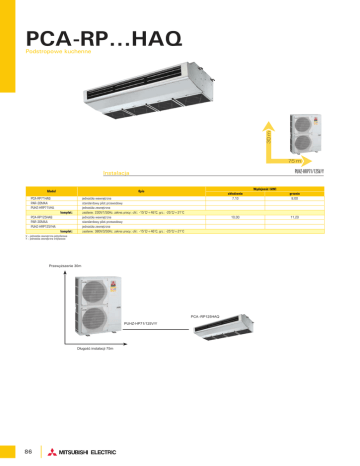 PcA-RP...haq 30 m Podstropowe kuchenne 75 m puhz-hrp71/125v/y Instalacja Model Wydajność [kW] Opis PCA-RP71HAQ PAR-30MAA PUHZ-HRP71VHA jednostka wewnętrzna standardowy pilot przewodowy jednostka zewnętrzna zasilanie: 230V/1/50Hz; zakres pracy: chł.: -15°C/+46°C, grz.: -25°C/+21°C jednostka wewnętrzna standardowy pilot przewodowy jednostka zewnętrzna zasilanie: 380V/3/50Hz; zakres pracy: chł.: -15°C/+46°C, grz.: -25°C/+21°C komplet: PCA-RP125HAQ PAR-30MAA PUHZ-HRP125YHA komplet: V – jednostka zewnętrzna jednofazowa Y – jednostka zewnętrzna trójfazowa Przewyższenie 30m PCA -RP125HAQ puhz-Hp71/125V/Y Długość instalacji 75m 86 chłodzenie 7,10 grzanie 8,00 10,00 11,20 PcA-RP...haq 30 m 30 m Podstropowe kuchenne 50 m puhz-rp671 Instalacja Model Opis PCA-RP71HAQ PAR-21MAA PUHZ-RP71VHA komplet: PCA-RP125HAQ PAR-21MAA PUHZ-RP125VKA komplet: 75 m jednostka wewnętrzna standardowy pilot przewodowy jednostka zewnętrzna zasilanie: 230V/1/50Hz; zakres pracy: chł.: -15°C/+46°C, grz.: -20°C/+21°C jednostka wewnętrzna standardowy pilot przewodowy jednostka zewnętrzna zasilanie: 230V/1/50Hz; zakres pracy: chł.: -15°C/+46°C, grz.: -20°C/+21°C puhz-rp125 Wydajność [kW] chłodzenie 7,10 grzanie 7,60 12,50 13,80 V – jednostka zewnętrzna jednofazowa Y – jednostka zewnętrzna trójfazowa PCA -RP...HAQ PUHZ-RP... PAR-30MAA-J 87 PcA-RP...haq 50 m PCA-RP71HAQ x2 PAR21 MAA lub PAR30 MAA PUHZ-RP140 komplet: PCA-RP71HAQ x2 PAR21 MAA lub PAR30 MAA PUHZ-P140 komplet: PCA-RP125HAQ x2 PAR21 MAA lub PAR30 MAA PUHZ-RP250 komplet: PCA-RP125HAQ x2 PAR21 MAA lub PAR30 MAA PUHZ-P250 komplet: PCA-RP71HAQ x3 PAR21 MAA lub PAR30 MAA PUHZ-RP250 komplet: PCA-RP71HAQ x3 PAR21 MAA lub PAR30 MAA PUHZ-P250 komplet: V – jednostka zewnętrzna jednofazowa Y – jednostka zewnętrzna trójfazowa 88 75 m puhz-p125 Instalacja Model 30 m 30 m 30 m Podstropowe kuchenne Opis jednostka wewnętrzna standardowy pilot przewodowy jednostka zewnętrzna zasilanie: 230V/400V/1/3/50Hz; zakres pracy: chł.: -15°C/+43°C, grz.: -15°C/+21°C jednostka wewnętrzna standardowy pilot przewodowy jednostka zewnętrzna zasilanie: 230V/400V/1/3/50Hz; zakres pracy: chł.: -15°C/+46°C, grz.: -15°C/+21°C jednostka wewnętrzna standardowy pilot przewodowy jednostka zewnętrzna zasilanie: 400V/3/50Hz; zakres pracy: chł.: -15°C/+43°C, grz.: -15°C/+21°C jednostka wewnętrzna standardowy pilot przewodowy jednostka zewnętrzna zasilanie: 400V/3/50Hz; zakres pracy: chł.: -15°C/+46°C, grz.: -11°C/+21°C jednostka wewnętrzna standardowy pilot przewodowy jednostka zewnętrzna zasilanie: 400V/3/50Hz; zakres pracy: chł.: -15°C/+43°C, grz.: -15°C/+21°C jednostka wewnętrzna standardowy pilot przewodowy jednostka zewnętrzna zasilanie: 400V/3/50Hz; zakres pracy: chł.: -15°C/+46°C, grz.: -11°C/+21°C 70 m puhz-rp140 puhz-p250 Wydajność [kW] chłodzenie 14,00 grzanie 16,00 Rozgałęźnik MSDD-50SR-E 14,00 16,00 MSDD-50SR-E 22,00 27,00 MSDD-50WR-E 22,00 27,00 MSDD-50WR-E 22,00 27,00 MSDT-111RE 22,00 27,00 MSDT-111RE
