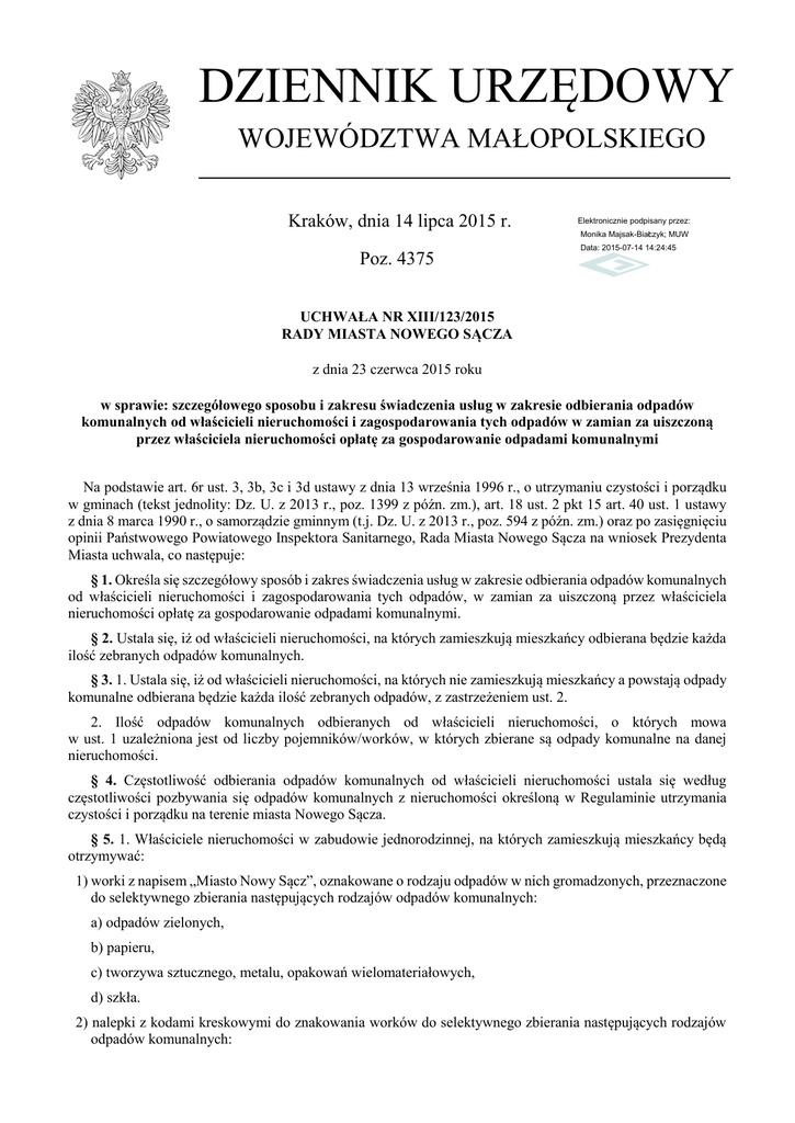 DZIENNIK URZĘDOWY WOJEWÓDZTWA MAŁOPOLSKIEGO Kraków, dnia 14 lipca 2015 r. Elektronicznie podpisany przez: Monika Majsak-Białczyk; MUW Poz. 4375 Data: 2015-07-14 14:24:45 UCHWAŁA NR XIII/123/2015 RADY MIASTA NOWEGO SĄCZA z dnia 23 czerwca 2015 roku w sprawie: szczegółowego sposobu i zakresu świadczenia usług w zakresie odbierania odpadów komunalnych od właścicieli nieruchomości i zagospodarowania tych odpadów w zamian za uiszczoną przez właściciela nieruchomości opłatę za gospodarowanie odpadami komunalnymi Na podstawie art. 6r ust. 3, 3b, 3c i 3d ustawy z dnia 13 września 1996 r., o utrzymaniu czystości i porządku w gminach (tekst jednolity: Dz. U. z 2013 r., poz. 1399 z późn. zm.), art. 18 ust. 2 pkt 15 art. 40 ust. 1 ustawy z dnia 8 marca 1990 r., o samorządzie gminnym (t.j. Dz. U. z 2013 r., poz. 594 z późn. zm.) oraz po zasięgnięciu opinii Państwowego Powiatowego Inspektora Sanitarnego, Rada Miasta Nowego Sącza na wniosek Prezydenta Miasta uchwala, co następuje: § 1. Określa się szczegółowy sposób i zakres świadczenia usług w zakresie odbierania odpadów komunalnych od właścicieli nieruchomości i zagospodarowania tych odpadów, w zamian za uiszczoną przez właściciela nieruchomości opłatę za gospodarowanie odpadami komunalnymi. § 2. Ustala się, iż od właścicieli nieruchomości, na których zamieszkują mieszkańcy odbierana będzie każda ilość zebranych odpadów komunalnych. § 3. 1. Ustala się, iż od właścicieli nieruchomości, na których nie zamieszkują mieszkańcy a powstają odpady komunalne odbierana będzie każda ilość zebranych odpadów, z zastrzeżeniem ust. 2. 2. Ilość odpadów komunalnych odbieranych od właścicieli nieruchomości, o których mowa w ust. 1 uzależniona jest od liczby pojemników/worków, w których zbierane są odpady komunalne na danej nieruchomości. § 4. Częstotliwość odbierania odpadów komunalnych od właścicieli nieruchomości ustala się według częstotliwości pozbywania się odpadów komunalnych z nieruchomości określoną w Regulaminie utrzymania czystości i porządku na terenie miasta Nowego Sącza. § 5. 1. Właściciele nieruchomości w zabudowie jednorodzinnej, na których zamieszkują mieszkańcy będą otrzymywać: 1) worki z napisem „Miasto Nowy Sącz”, oznakowane o rodzaju odpadów w nich gromadzonych, przeznaczone do selektywnego zbierania następujących rodzajów odpadów komunalnych: a) odpadów zielonych, b) papieru, c) tworzywa sztucznego, metalu, opakowań wielomateriałowych, d) szkła. 2) nalepki z kodami kreskowymi do znakowania worków do selektywnego zbierania następujących rodzajów odpadów komunalnych: Dziennik Urzędowy Województwa Małopolskiego –2– Poz. 4375 a) papieru, b) tworzywa sztucznego, metalu, opakowań wielomateriałowych, c) szkła. 2. Na zgłoszenie właścicieli nieruchomości na których zamieszkują mieszkańcy i którzy prowadzą selektywne zbieranie odpadów, będą dostarczane nieodpłatnie pojemniki do zbierania odpadów budowlanych i rozbiórkowych stanowiących odpady komunalne. § 6. 1. Na terenie miasta Nowego Sącza funkcjonują dwa stacjonarne punkty selektywnego zbierania odpadów komunalnych, zlokalizowane przy ulicy Tarnowskiej 120 i przy ulicy Jana Pawła II 37. 2. Szczegółowe informacje dotyczące godzin otwarcia i zasad funkcjonowania punktów selektywnego zbierania odpadów komunalnych udostępnione są na stronie internetowej Miasta Nowego Sącza: www.nowysacz.pl oraz stronie internetowej przedsiębiorcy świadczącego usługę odbierania i zagospodarowania odpadów komunalnych wyłonionego w drodze przetargu nieograniczonego. 3. W punktach selektywnego zbierania odpadów komunalnych, nieodpłatnie przyjmowane są odpady komunalne od właścicieli nieruchomości, na których zamieszkują mieszkańcy, zebrane w sposób selektywny i dostarczane we własnym zakresie przez właścicieli nieruchomości: 1) przeterminowane leki i chemikalia, 2) zużyte baterie i akumulatory, 3) zużyty sprzęt elektryczny i elektroniczny, 4) meble i inne odpady wielkogabarytowe, 5) zużyte opony, 6) odpady zielone, 7) odpady budowlane i rozbiórkowe stanowiące odpady komunalne, 8) papier, 9) metal, tworzywa sztuczne i opakowania wielomateriałowe, 10) szkło. § 7. 1. W przypadku niewłaściwego świadczenia usług przez przedsiębiorcę odbierającego odpady komunalne od właścicieli nieruchomości lub przez prowadzącego punkt selektywnego zbierania odpadów przewiduje się procedurę składania interwencji w tym zakresie. 2. Interwencje mogą być wnoszone osobiście, telefonicznie lub pisemnie do Urzędu Miasta Nowego Sącza, Wydział Gospodarki Komunalnej - Referat Komunalny, z siedzibą: ul. Rynek 3, tel. (18) 415 65 70, (18) 415 65 75, a także za pomocą poczty elektronicznej na adres e-mail: [email protected], bezpośrednio po zdarzeniu będącym przedmiotem interwencji. § 8. Traci moc Uchwała Nr XXXIX/402/2012 Rady Miasta Nowego Sącza z dnia 17 grudnia 2012 r., w sprawie: szczegółowego sposobu i zakresu świadczenia usług w zakresie odbierania odpadów komunalnych od właścicieli nieruchomości i zagospodarowania tych odpadów w zamian za uiszczoną przez właściciela nieruchomości opłatę za gospodarowanie odpadami komunalnymi (Dziennik Urzędowy Województwa Małopolskiego z 2012 r., poz. 7758, Dziennik Urzędowy Województwa Małopolskiego z 2013 r., poz. 2350). § 9. Wykonanie uchwały powierza się Prezydentowi Miasta Nowego Sącza. § 10. Uchwała wchodzi w życie po upływie 14 dni od dnia ogłoszenia w Dzienniku Urzędowym Województwa Małopolskiego. Wiceprzewodniczący Rady Miasta Michał Kądziołka