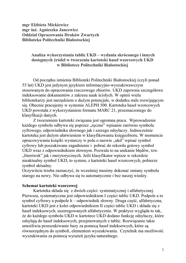 mgr Elżbieta Mickiewicz mgr inż. Agnieszka Jancewicz Oddział Opracowania Druków Zwartych Biblioteka Politechniki Białostockiej Analiza wykorzystania tablic UKD – wydania skróconego i innych dostępnych źródeł w tworzeniu kartoteki haseł wzorcowych UKD w Bibliotece Politechniki Białostockiej Od początku istnienia Biblioteki Politechniki Białostockiej (czyli ponad 55 lat) UKD jest jedynym językiem informacyjno-wyszukiwawczym stosowanym do opracowania rzeczowego zbiorów. UKD zapewnia szczegółowe indeksowanie dokumentów z zakresu nauk ścisłych. W opinii wielu bibliotekarzy jest narzędziem o dużym potencjale, w dodatku stale rozwijającym się. Obecnie pracujemy w systemie ALEPH 500. Kartoteka haseł wzorcowych UKD powstała z wykorzystaniem formatu MARC 21, przeznaczonego do klasyfikacji danych. Z tworzeniem kartoteki związana jest ogromna praca. Wprowadzenie każdego symbolu odbywa się poprzez „ręczne” wpisanie zarówno symbolu cyfrowego, odpowiednika słownego jak i szeregu odsyłaczy. Jednocześnie kartoteka jest dużym ułatwieniem w klasyfikowaniu księgozbioru. W momencie opracowywania książki wystarczy w polu o nazwie „ukd” wpisać symbol cyfrowy lub poszukiwane zagadnienie i pobrać do rekordu gotowy symbol UKD wraz z odpowiednikiem słownym. Pozwala to na unikanie błędów, tzw. „literówek” jak i merytorycznych. Jeśli klasyfikator wpisze w rekordzie nieaktualny symbol UKD, to system, z kartoteki haseł wzorcowych, pobierze symbol aktualny. Oczywiście trzeba zaznaczyć, że wcześniej musimy dokonać zmiany symbolu starego na nowy. Nie odbywa się to automatycznie i bez naszej wiedzy. Schemat kartoteki wzorcowej Kartoteka składa się z dwóch części: systematycznej i alfabetycznej. Pierwsza, systematyczna jest odpowiednikiem I części tablic UKD. Podpole a to symbol cyfrowy a podpole h – odpowiednik słowny. Druga część, alfabetyczna, kartoteki UKD jest z kolei odpowiednikiem II części tablic UKD i składa się z haseł indeksowych, uszeregowanych alfabetycznie. W praktyce wygląda to tak, że do każdego symbolu UKD w kartotece UKD dodano funkcję odsyłaczy, które odsyłają do haseł indeksowych, przejmowanych z tablic. Rozwiązanie takie umożliwia przeszukiwanie bazy za pomocą haseł indeksowych, które są równorzędnym do symboli, elementem wyszukiwania. Czytelnik ma możliwość wyszukiwania za pomocą wyrażeń języka naturalnego. 1 Formularz wzorcowy w KHW UKD W polu 453 zamieszczane są hasła indeksowe, powstałe z odpowiednika słownego symbolu. Jest to pole powtarzalne i można utworzyć dowolną ilość haseł do konkretnego odpowiednika słownego. Natomiast pole 553 służy do umieszczania terminów związanych z danym symbolem UKD. Pole 553 wypełniamy od niedawna, ponieważ w starej wersji systemu mogła być tylko jedna relacja odsyłaczy. Powstała z pola 453 kartoteka to nic innego jak indeks przedmiotowy, zamieszczany w każdych tablicach UKD. Hasło indeksowe jest przejmowane bezpośrednio z tablic lub przekształcane tak, aby jego postać była zgodna z zasadami budowy języka haseł przedmiotowych. Kartoteka haseł wzorcowych UKD zawiera symbole proste, rozwinięte, jak również symbole złożone. Od niedawna wprowadzamy do kartoteki także symbole z tablic pomocniczych (poddziały formy np.). W chwili obecnej kartoteka liczy ok. 9 tys. haseł, symboli UKD wraz z odpowiednikami słownymi. Natomiast odsyłaczy od tych haseł jest ponad 22 tys. Najmniej jest odsyłaczy związanych (ok.200), ponieważ zaczęłyśmy je wprowadzać niedawno. Tablice skrócone zawierają 6837 symboli, w tym 1436 symboli poddziałów wspólnych. Trudno porównywać zawartość tablic i zawartość kartoteki haseł wzorcowych UKD w BPB, ponieważ nasza baza UKD cały czas jest w trakcie tworzenia. Nie mamy na razie możliwości tworzenia jej na zapas, więc nowe hasła, nowe symbole pojawiają się w momencie zaistnienia dokumentów na określony temat. Nie możemy stwierdzić czy jakiś dział jest kompletny, czy będzie do niego jeszcze jakaś rozbudowa. Do tworzenia KHW UKD używamy polskich wydań tablic UKD, jak również źródeł dostępnych drogą internetową. Sporym problemem dla nas jest to, że indeksy przedmiotowe, znajdujące się w tablicach UKD, odnoszą się tylko do tablic, przy których są umieszczone. Metodyka tworzenia indeksu nie jest ściśle ustalona, dlatego wydania tablic różnią się sposobem tworzenia zapisów indeksowych. A nasze hasła indeksowe tworzone są do symboli UKD zaczerpniętych z różnych wydań Tablic UKD, o bardzo różnym stopniu szczegółowości, w zależności od potrzeb i reprezentacji literatury z różnych dziedzin. W wydaniach skróconych indeks ma inną budowę, a w pełnych wydaniach tablic UKD, inną. Nie tworzymy nic nowego, tylko przejmujemy indeks przedmiotowy w takiej postaci, jaka jest zawarta w tablicach. Przyjęliśmy zasadę indeksowania w możliwie szczegółowy sposób. Korzystając z którychkolwiek z wymienionych tablic, staramy się wybierać te, które zawierają najbardziej szczegółową rozbudowę oraz te, które są najbardziej aktualne. Sporym udogodnieniem dla nas jest wersja elektroniczna tablic UKD w Maku (są do kupienia w BN i szkoda, że nie są integralną częścią tablic), skąd można kopiować pojedyncze hasła indeksowe do kartoteki UKD w naszej bazie. 2 Dla nas jest to jednak kropla w morzu potrzeb, bo jak wspomniałam, korzystamy z różnych wydań tablic. Praktycznie codzienne stało się korzystanie z „E&C to the UDC” (Extensions and Corrections to the UDC) i ze zmian tam zamieszczanych. Dużą pomocą jest zaglądanie do MDT, czeskiego pliku MRF, zamieszczonego na stronie Czeskiej Biblioteki Narodowej. Konsultujemy też naszą klasyfikację z tą, która istnieje w katalogu Biblioteki Technicznej w Hajfie w Izraelu. Biblioteki te stosują do opracowania rzeczowego księgozbioru UKD, a co najważniejsze dla nas – utrzymują k