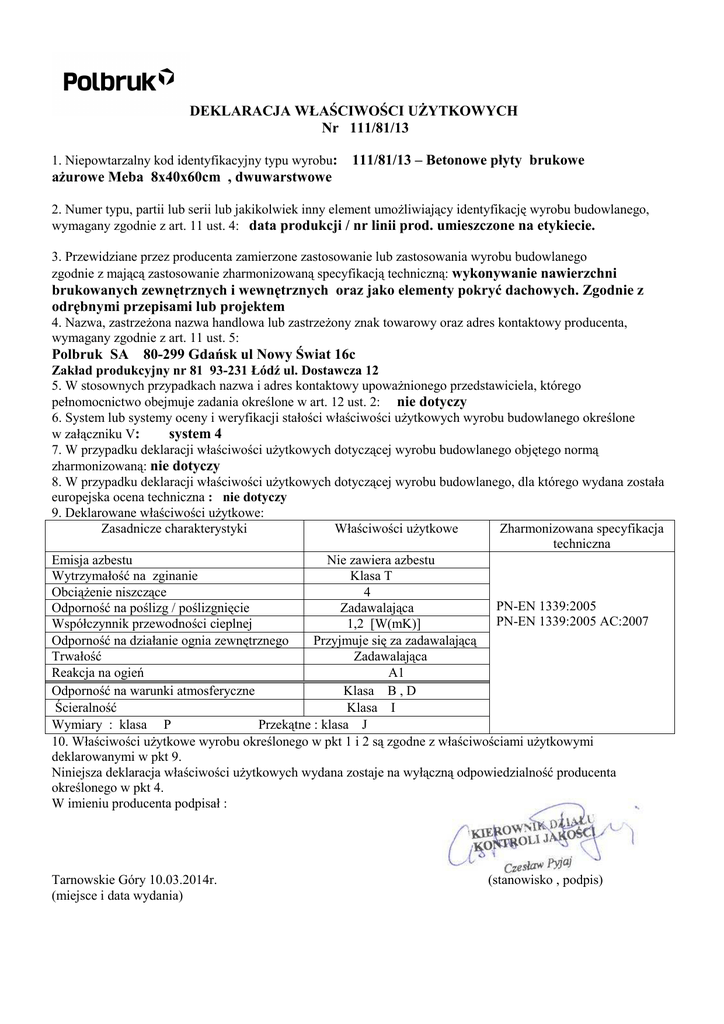 DEKLARACJA WŁAŚCIWOŚCI UŻYTKOWYCH Nr 111/81/13 1. Niepowtarzalny kod identyfikacyjny typu wyrobu: 111/81/13 – Betonowe płyty brukowe ażurowe Meba 8x40x60cm , dwuwarstwowe 2. Numer typu, partii lub serii lub jakikolwiek inny element umożliwiający identyfikację wyrobu budowlanego, wymagany zgodnie z art. 11 ust. 4: data produkcji / nr linii prod. umieszczone na etykiecie. 3. Przewidziane przez producenta zamierzone zastosowanie lub zastosowania wyrobu budowlanego zgodnie z mającą zastosowanie zharmonizowaną specyfikacją techniczną: wykonywanie nawierzchni brukowanych zewnętrznych i wewnętrznych oraz jako elementy pokryć dachowych. Zgodnie z odrębnymi przepisami lub projektem 4. Nazwa, zastrzeżona nazwa handlowa lub zastrzeżony znak towarowy oraz adres kontaktowy producenta, wymagany zgodnie z art. 11 ust. 5: Polbruk SA 80-299 Gdańsk ul Nowy Świat 16c Zakład produkcyjny nr 81 93-231 Łódź ul. Dostawcza 12 5. W stosownych przypadkach nazwa i adres kontaktowy upoważnionego przedstawiciela, którego pełnomocnictwo obejmuje zadania określone w art. 12 ust. 2: nie dotyczy 6. System lub systemy oceny i weryfikacji stałości właściwości użytkowych wyrobu budowlanego określone w załączniku V: system 4 7. W przypadku deklaracji właściwości użytkowych dotyczącej wyrobu budowlanego objętego normą zharmonizowaną: nie dotyczy 8. W przypadku deklaracji właściwości użytkowych dotyczącej wyrobu budowlanego, dla którego wydana została europejska ocena techniczna : nie dotyczy 9. Deklarowane właściwości użytkowe: Zasadnicze charakterystyki Właściwości użytkowe Zharmonizowana specyfikacja techniczna Emisja azbestu Nie zawiera azbestu Wytrzymałość na zginanie Klasa T Obciążenie niszczące 4 PN-EN 1339:2005 Odporność na poślizg / poślizgnięcie Zadawalająca PN-EN 1339:2005 AC:2007 Współczynnik przewodności cieplnej 1,2 [W(mK)] Odporność na działanie ognia zewnętrznego Przyjmuje się za zadawalającą Trwałość Zadawalająca Reakcja na ogień A1 Odporność na warunki atmosferyczne Klasa B , D Ścieralność Klasa I Wymiary : klasa P Przekątne : klasa J 10. Właściwości użytkowe wyrobu określonego w pkt 1 i 2 są zgodne z właściwościami użytkowymi deklarowanymi w pkt 9. Niniejsza deklaracja właściwości użytkowych wydana zostaje na wyłączną odpowiedzialność producenta określonego w pkt 4. W imieniu producenta podpisał : Tarnowskie Góry 10.03.2014r. (miejsce i data wydania) (stanowisko , podpis)
