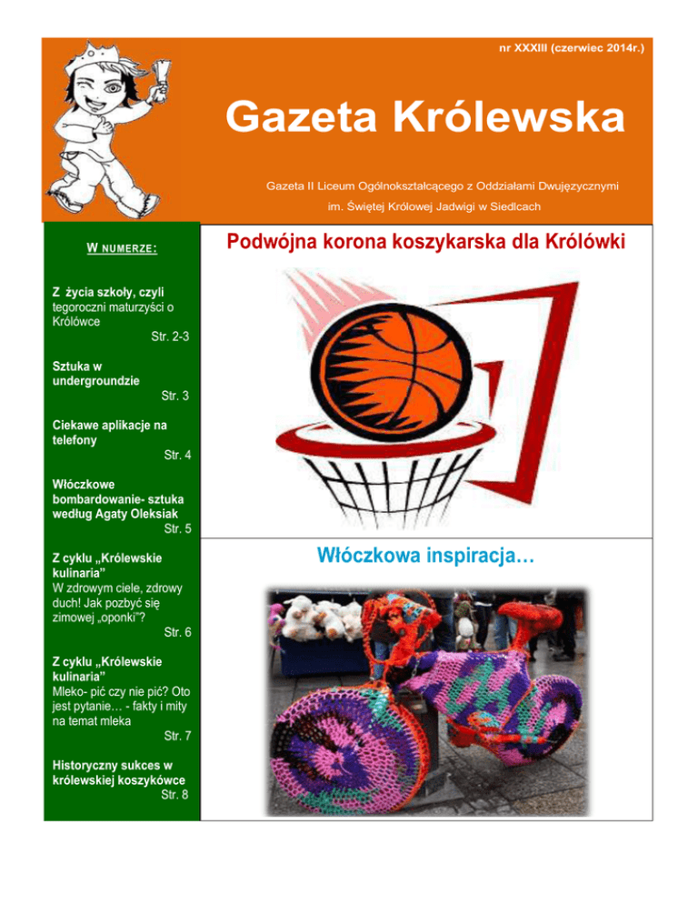 nr XXXIII (czerwiec 2014r.) Gazeta Królewska Gazeta II Liceum Ogólnokształcącego z Oddziałami Dwujęzycznymi im. Świętej Królowej Jadwigi w Siedlcach W Podwójna korona koszykarska dla Królówki NUMERZE : Z życia szkoły, czyli tegoroczni maturzyści o Królówce Str. 2-3 Sztuka w undergroundzie Str. 3 Ciekawe aplikacje na telefony Str. 4 Włóczkowe bombardowanie- sztuka według Agaty Oleksiak Str. 5 Z cyklu „Królewskie kulinaria” W zdrowym ciele, zdrowy duch! Jak pozbyć się zimowej „oponki”? Str. 6 Z cyklu „Królewskie kulinaria” Mleko- pić czy nie pić? Oto jest pytanie… - fakty i mity na temat mleka Str. 7 Historyczny sukces w królewskiej koszykówce Str. 8 Włóczkowa inspiracja… Z ŻYCIA SZKOŁY Gazeta Królewska nr XXXIII MICHAŁ REWUCKI – TEGOROCZNI MATURZYŚCI O KRÓLÓWCE Paweł Wiciński klasa 3A „Królówka ma opinię jednej z najlepszych szkół w Siedlcach, o ile nie najlepszej. Zapewne wielu z nas kierowało się tym, kiedy wybieraliśmy ją jakiś czas temu jako szkołę pierwszego wyboru. Dużym plusem jest rozmiar szkoły. Pozwala na odczucie rodzinnego klimatu, jeśli ktoś nie wierzy, może oczywiście zapytać nauczycieli, którzy po każdej lekcji wychodzą szczęśliwsi (a przynajmniej tak nam się wydaje). Jest miejscem gdzie wszyscy poznaliśmy świetnych ludzi, gdzie zawiązały się przyjaźnie, które będą się ciągnęły przez długie lata. Najbardziej zapadnie w pamięci tłok na korytarzach, słynne „Opowiadaj" Pana Kotarskiego, wielokrotne interpretacje PSO w wykonaniu Pani Zdunek, z perspektywy czasu te wszystkie wspomnienia, osoby staną się pięknym obrazem, który zachowamy w swojej pamięci na długie lata. Tak, ale myślę, że to kwestia nie tyle szkoły, co naszego dojrzewania w niej. Powoli każdy z nas dochodził do pewnych wniosków. Kilka osób uświadomiło sobie, że ten profil to nie jego bajka, że chce podążać w całkiem innym kierunku i to niewątpliwie jest zasługa szkoły. Szkoła pozostawiała nam wybór, mogliśmy zmienić profil, spróbować czegoś zupełnie nowego. Można zaryzykować stwierdzeniem, że szkoła, nie tyle pomogła nam w wyborze, co zdeterminowała nas do konkretnych decyzji. „Przecież nie pójdę po skończeniu Królówki na pośrednią uczelnię". Jeśli chodzi o nauczycieli to mamy wielu wspaniałych ludzi z powołaniem, dla których nauczanie to pasja, lecz są i tacy, którzy traktują lekcje w naszej klasie jak tortury. Nie mam do nich o to żalu, przynajmniej nie do wszystkich. Jesteśmy trudną klasą, ale przy bliższym poznaniu naprawdę sporo zyskujemy. Podsumowując, przeżyliśmy w Królówce 3 piękne lata, lata wzlotów i upadków, lata, które wielu z nas odmieniło. Z tej szkoły zapamiętamy na pewno naszą Wychowawczynię. Jej dobre rady, jej charakter, świetny tok nauczania, wspólne wycieczki, ale przede wszystkim to, jaką jest wspaniałą osobą i jak walczyła (i wciąż walczy) o każdego z nas, byśmy na przekór szkolnej opinii stawali się lepszymi ludźmi. My jako klasa, mimo wielu zawodów jakie jej sprawiliśmy możemy tylko liczyć, że nie będzie się na nas za długo gniewać.” Aleksandra Michalik klasa 3D „To, co najbardziej podoba mi się w tej szkole, to ludzie, którzy ją tworzą. Mam na myśli uczniów. W Królówce poznałam wiele ciepłych, zabawnych osób, nawiązałam nowe przyjaźnie, które mam nadzieję utrzymają się również po zakończeniu edukacji w tej szkole. Rozpatrując pod innymi względami no to cóż, szkoła jak każda inna, jednak uważam, że nowy samorząd uczniowski spisuje się na medal i w tym roku Królówka odżyła! Jak będę ją wspominać? Mimo wszystko na pewno dobrze. Nie żałuję, że idąc do liceum wybrałam właśnie tę szkołę. Podobno to najwspanialszy czas w życiu człowieka i ja z pewnością lata licealne będę wspominać jako jedne z najmilszych w moim życiu. Jakby nie patrzeć, na tym etapie nauczania wiele rzeczy jest nowych, dochodzą inne przedmioty, poznajemy nowych ludzi, nauczycieli, powoli musimy podejmować już decyzje dotyczące przyszłości. Tak jak powiedziałam wcześniej, bez wątpienia najmilszym wspomnieniem będzie dla mnie moja klasa i wychowawca Pan Aleksander Dolecki. Nigdy wcześniej nie miałam do czynienia z tak ciepłym nauczycielem, który tak bardzo się o nas troszczył i któremu tak bardzo na nas-uczniach zależało. Jeśli chodzi o grono pedagogiczne to niektórzy nauczyciele są naprawdę w porządku wobec uczniów, a przede wszystkim potrafią zaciekawić przedmiotem, który na pierwszy rzut oka nie wydaje się ciekawy. Co więcej, potrafią rozmawiać z młodzieżą i mimo wszystko jakoś ją rozumieć, a w moim odczuciu to naprawdę ważne.” Anna Tkaczuk klasa 3E „Jeżeli Królówka, to na pewno wszyscy ludzie, których poznałam w ciągu tych 3 lat. Są tacy, których podziwiam, ale także tacy, na których przykładzie uczę się jaka nie być, bo jak to w życiu bywa, na naszej drodze spotykamy różne osobowości. Za wszystko jestem jednak bardzo wdzięczna i cieszę się, że jestem tu, gdzie jestem. Królówka to również wymiana inspiracji, nie tylko w gronie znajomych, ale także pomiędzy uczniami a nauczycielami, a przede wszystkim piękna przygoda, która jednak jak wszystko musi dobiec końca.” Daria Janaszek klasa 3F „Przez trzy lata w tej szkole nauczyłam się, jak umiejętnie należy zarządzać czasem i jak jest on cenny. Zwłaszcza w klasie maturalnej poznałam jego wartość. Królówka pokazała mi także jak ważna jest umiejętność samodzielnej pracy i wyszukiwania niezbędnych informacji. W Królówce poznałam kilka fantastycznych osób, które na stałe zagościły w moim życiu. I przez wzgląd na ten fakt, w dalszym ciągu polecam tę szkołę, mając nadzieję, że każdy poznał lub pozna w niej prawdziwych przyjaciół.” Magdalena Piątek klasa 3G „Sądzę, że Królówka dała nam wszystkim bar