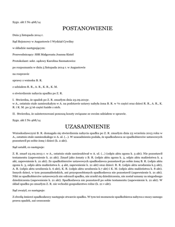Sygn. akt I Ns 468/14 POSTANOWIENIE Dnia 5 listopada 2014 r. Sąd Rejonowy w Augustowie I Wydział Cywilny w składzie następującym: Przewodniczący: SSR Małgorzata Joanna Kisiel Protokolant: sekr. sądowy Karolina Szematowicz po rozpoznaniu w dniu 5 listopada 2014 r. w Augustowie na rozprawie sprawy z wniosku B. R. z udziałem R. R., A. R., K. R., K. M. o stwierdzenie nabycia spadku po Z. R. I. Stwierdza, że spadek po Z. R. zmarłym dnia 23.09.2013r. w A., ostatnio stale zamieszkałym w A. na podstawie ustawy nabyła żona B. R. w ¼ części oraz dzieci R. R., A. R., K. R. i K. M. po 3/16 części każde z nich. II. Stwierdza, że zainteresowani ponoszą koszty związane ze swoim udziałem w sprawie. Sygn. akt I Ns 468/14 UZASADNIENIE Wnioskodawczyni B. R. domagała się stwierdzenia nabycia spadku po Z. R. zmarłym dnia 23 września 2013 roku w A., ostatnio stale zamieszkałego w A. ul. (...). W uzasadnieniu podała, że spadkodawca ze spadkobierców ustawowych pozostawił po sobie żonę i dzieci (k. 2 akt). Sąd ustalił, co następuje: Z. R. zmarł 23.09.2013 r. w A., ostatnio stale zamieszkiwał w A. ul. (...) (odpis aktu zgonu k. 3 akt). Nie pozostawił testamentu (zapewnienie k. 21 akt). Zmarł jako żonaty z B. R. (odpis aktu zgonu k. 3, odpis aktu małżeństwa k. 4 akt, zapewnienie k. 21 akt). Ze spadkobierców ustawowych spadkodawca pozostawił po sobie żonę B. R. (odpis aktu zgonu k. 3, odpis aktu małżeństwa k. 4 akt, zapewnienie k. 21 akt) oraz dzieci: R. R. (odpis aktu urodzenia k.5 akt), A. R. (odpis aktu urodzenia k. 6 akt), K. R. (odpis aktu urodzenia k.7 akt) i K. M. (odpis aktu małżeństwa k. 8 akt). Innych dzieci, w tym pozamałżeńskich, ani przysposobionych spadkodawca nie pozostawił (zapewnienie k. 21 akt). Nikt ze spadkobierców ustawowych nie odrzucił spadku, nie zrzekł się dziedziczenia, nie został uznany za niegodnego dziedziczenia (zapewnienie k. 21 akt). Spadkodawca nie pozostawił po sobie testamentu (zapewnienie k. 21 akt). W skład spadku po zmarłym Z. R. nie wchodzi gospodarstwo rolne (k. 21 v akt). Sąd zważył, co następuje: Z chwilą śmierci spadkodawcy następuje otwarcie spadku. W tym też momencie spadkobierca nabywa z mocy samego prawa spadek, zaś orzeczenie o stwierdzeniu nabycia spadku ma jedynie charakter deklaratoryjny. Jeżeli spadkodawca nie pozostawił testamentu, kwestie związane z powołaniem do spadku reguluje ustawa (kodeks cywilny). Natomiast jeżeli spadkodawca pozostawił testament, rolą Sądu rozpoznającego sprawę o stwierdzenie nabycia spadku jest ocena ważności testamentu. Zgodnie z treścią art. 926 § 1 i 2 k.c. powołanie do spadku wynika z ustawy albo z testamentu. Dziedziczenie ustawowe co do całości spadku następuje wtedy, gdy spadkodawca nie powołał spadkobiercy albo gdy żadna z osób, które powołał, nie chce lub nie może być spadkobiercą. Powyższy przepis wyraża generalną zasadę, iż powołanie do dziedziczenia z testamentu ma pierwszeństwo przed dziedziczeniem ustawowym. Zasada ta zabezpiecza pełną realizację swobody w dysponowaniu majątkiem na wypadek śmierci. Testamentowy tytuł powołania do spadku wyłącza - z zastrzeżeniem wyjątku określonego w art. 926 § 3 k.c. - powołanie z ustawy, także wówczas, gdy osoby powołane w testamencie należą do kręgu spadkobierców ustawowych. Pierwszeństwo dziedziczenia testamentowego podkreśla zarówno judykatura (orz. SN z 31.01.1997 r. II CKU 58/96; orz. SN z 06.02.1998 r. I CKU 206/97), jak i doktryna (Skowrońska Bocian Komentarz do kodeksu cywilnego Księga czwarta, spadki 2001, s. 37, pkt.6, M. Pazdan (w:) K. Pietrzykowski, Komentarz do Kodeksu Cywilnego , t. II, s. 907). Ze złożonego zapewnienia wynika, że spadkodawca Z. R. nie pozostawił testamentu. Nie ma więc w tym przypadku spadkobierców testamentowych, zaś dziedziczenie odbywa się zgodnie z przepisami kodeksu cywilnego o dziedziczeniu ustawowym. Przepis art. 931 § 1 kc stanowi, że w pierwszej kolejności powołane są z ustawy do spadku dzieci spadkodawcy oraz jego małżonek. Dziedziczą oni w częściach równych. Jednakże część przypadająca małżonkowi nie może być mniejsza niż ¼ całości spadku. Według przepisu art. 931 § 2 kc jeżeli dziecko spadkodawcy nie dożyło otwarcia spadku, udział spadkowy, który by mu przypadał, przypada jego dzieciom w częściach równych. Przepis ten stosuje się odpowiednio do dalszych zstępnych. Stwierdzenie nabycia spadku obejmuje cały spadek i w zasadzie w tym postępowaniu nie ustala się składników majątku spadkowego. Wyjątkiem jest, co do spadków objętych przed dniem 14.02.2001 r. (Wyrok Trybunału Konstytucyjnego z dnia 31.01.2001 r. (Dz. U. Nr 11, poz. 91 ), wchodzące w skład spadku gospodarstwo rolne obejmujące grunty rolne o powierzchni przekraczającej 1 ha (art. 1058 kc). Co do spadków objętych po tej dacie do dziedziczenia gospodarstwa rolnego mają zastosowanie przepisy ogólne powołane wyżej. Jak wynikało z wniosku (k. 2) oraz zeznań złożonych przez wnioskodawczynię B. R. (k. 21 v akt) w skład spadku nie wchodziło gospodarstwo rolne. Stąd też Sąd ustalił, na podstawie art. 1058 kc, że w skład spadku po Z. R. nie wchodzi gospodarstwo rolne w rozumieniu przepisów szczególnych o dziedziczeniu gospodarstw rolnych. Wobec powyższego Sąd stwierdził, że spadek po Z. R. nabyła żona B. R. w ¼ części oraz dzieci R. R., A. R., K. R. i K. M. (art. 931 § 1 kc) po 3/16 części każde z nich. Zgodnie z przepisem art. 1012 kc spadkobierca może bądź przyjąć spadek bez ograniczenia odpowiedzialności za długi (przyjęcie proste), bądź przyjąć spadek z ograniczeniem tej odpowiedzialności (przyjęcie z dobrodziejstwem inwentarza), bądź też spadek odrzucić. Według art. 1015 § 1 kc oświadczenie o przyjęciu lub o odrzuceniu spadku może być złożone w ciągu sześciu miesięcy od dnia, w którym spadkobierca dowiedział się o tytule swego powoł