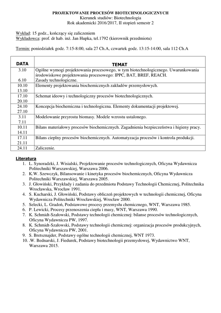 PROJEKTOWANIE PROCESÓW BIOTECHNOLOGICZNYCH Kierunek studiów: Biotechnologia Rok akademicki 2016/2017, II stopień semestr 2 Wykład: 15 godz., kończący się zaliczeniem Wykładowca: prof. dr hab. inż. Jan Hupka, tel.1792 (kierownik przedmiotu) Termin: poniedziałek godz. 7:15-8:00, sala 27 Ch.A, czwartek godz. 13:15-14:00, sala 112 Ch.A DATA 3.10 6.10 10.10 13.10 17.10 20.10 24.10 27.10 3.11 7.11 10.11 14.11 17.11 21.11 24.11 TEMAT Ogólne wymogi projektowania procesowego, w tym biotechnologicznego. Uwarunkowania środowiskowe projektowania procesowego: IPPC, BAT, BREF, REACH. Zasady technologiczne. Elementy projektowania biochemicznych zakładów przemysłowych. Schemat ideowy i technologiczny procesów biotechnologicznych. Koncepcja biochemiczna i technologiczna. Elementy dokumentacji projektowej. Modelowanie przyrostu biomasy. Modele wzrostu ustalonego. Bilans materiałowy procesów biochemicznych. Zagadnienia bezpieczeństwa i higieny pracy. Bilans cieplny procesów biochemicznych. Automatyzacja procesów i kontrola produkcji. Zaliczenie. Literatura 1. L. Synoradzki, J. Wisialski, Projektowanie procesów technologicznych, Oficyna Wydawnicza Politechniki Warszawskiej, Warszawa 2006. 2. K.W. Szewczyk, Bilansowanie i kinetyka procesów biochemicznych, Oficyna Wydawnicza Politechniki Warszawskiej, Warszawa 2005. 3. J. Głowiński, Przykłady i zadania do przedmiotu Podstawy Technologii Chemicznej, Politechnika Wrocławska, Wrocław 1991. 4. S. Kucharski, J. Głowiński, Podstawy obliczeń projektowych w technologii chemicznej, Oficyna Wydawnicza Politechniki Wrocławskiej, Wrocław 2000. 5. Selecki, L. Gradoń, Podstawowe procesy przemysłu chemicznego, WNT, Warszawa 1985. 6. P. Lewicki, Procesy przenoszenia ciepła i masy, WNT, Warszawa 1990. 7. K. Schmidt-Szałowski, Podstawy technologii chemicznej: bilanse procesów technologicznych, Oficyna Wydawnicza PW, 1997. 8. K. Schmidt-Szałowski, Podstawy technologii chemicznej: organizacja procesów produkcyjnych, Oficyna Wydawnicza PW, 2001. 9. S. Bretsznajder, Podstawy ogólne technologii chemicznej, WNT 1973. 10. .W. Bednarski, J. Fiedurek, Podstawy biotechnologii przemysłowej, Wydawnictwo WNT, Warszawa 2015.
