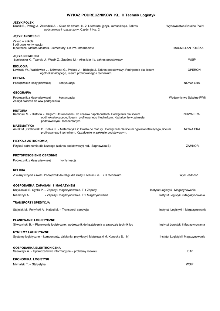 WYKAZ PODRĘCZNIKÓW KL. II Technik Logistyk JĘZYK POLSKI Drabik B., Pstrąg J., Zawadzki A. - Klucz do świata kl. 2. Literatura, język, komunikacja. Zakres podstawowy i rozszerzony. Część 1 i cz. 2 Wydawnictwa Szkolne PWN. JĘZYK ANGIELSKI Zakup w szkole I półrocze kontynuacja II półrocze Matura Masters. Elementary lub Pre-Intermediate MACMILLAN POLSKA. JĘZYK NIEMIECKI Łuniewska K., Tworek U., Wąsik Z., Zagórna M. - Alles klar 1b. zakres podstawowy WSiP BIOLOGIA Lewiński W., Walkiewicz J., Skirmuntt G., Prokop J. - Biologia 2. Zakres podstawowy. Podręcznik dla liceum ogólnokształcącego, liceum profilowanego i technikum. OPERON CHEMIA Podręcznik z klasy pierwszej kontynuacja NOWA ERA GEOGRAFIA Podręcznik z klasy pierwszej kontynuacja Zeszyt ćwiczeń do w/w podręcznika Wydawnictwo Szkolne PWN HISTORIA Kamiński M. - Historia 2. Część1 Od renesansu do czasów napoleońskich. Podręcznik dla liceum ogólnokształcącego, liceum profilowanego i technikum. Kształcenie w zakresie. podstawowym i rozszerzonym NOWA ERA. MATEMATYKA Antek M., Grabowski P. Belka K.. - Matematyka 2. Prosto do matury. Podręcznik dla liceum ogólnokształcącego, liceum profilowanego i technikum. Kształcenie w zakresie podstawowym. NOWA ERA.. FIZYKA Z ASTRONOMIĄ Fizyka i astronomia dla każdego (zakres podstawowy) red. Sagnowska B) ZAMKOR. PRZYSPOSOBIENIE OBRONNE Podręcznik z klasy pierwszej kontynuacja RELIGIA Z wiarą w życie i świat. Podręcznik do religii dla klasy II liceum i kl. II i III technikum GOSPODAEKA ZAPASAMI I MAGAZYNEM Krzyżaniak S. Cyplik P. – Zapasy i magazynowanie. T.1 Zapasy Niemczyk A. - Zapasy i magazynowanie. T.2 Magazynowanie Wyd. Jedność Instytut Logistyki i Magazynowania Instytut Logistyki i Magazynowania TRANSPORT I SPEDYCJA Stajniak M. Foltyński A., Hajdul M. – Transport i spedycja Instytut Logistyki i Magazynowania PLANOWANIE LOGISTYCZNE Śliwczyński B. – Planowanie logistyczne: podręcznik do kształcenia w zawodzie technik log Instytut Logistyki i Magazynowania SYSTEMY LOGISTYCZNE Systemy logistyczne – komponenty, działania, przykłady [ Matulewski M. Konecka S. i In] GOSPODARKA ELEKTRONICZNA Szewczyk A. - Społeczeństwo informacyjne – problemy rozwoju Instytut Logistyki i Magazynowania Difin EKONOMIKA LOGISTYKI Michalski T. – Statystyka WSiP