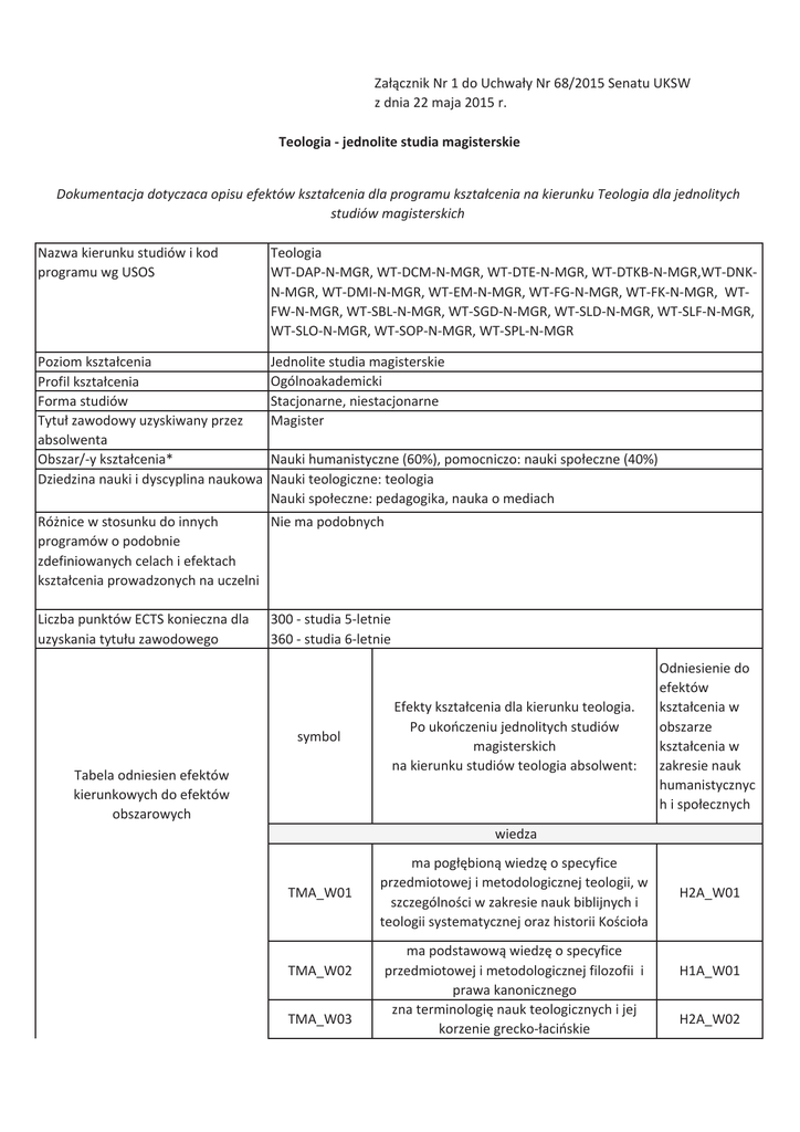 ZaųČcznikNr1doUchwaųyNr68/2015SenatuUKSW zdnia22maja2015r. TeologiaͲjednolitestudiamagisterskie DokumentacjadotyczacaopisuefektówksztaųceniadlaprogramuksztaųcenianakierunkuTeologiadlajednolitych studiówmagisterskich Nazwakierunkustudiówikod programuwgUSOS Teologia WTͲDAPͲNͲMGR,WTͲDCMͲNͲMGR,WTͲDTEͲNͲMGR,WTͲDTKBͲNͲMGR,WTͲDNKͲ NͲMGR,WTͲDMIͲNͲMGR,WTͲEMͲNͲMGR,WTͲFGͲNͲMGR,WTͲFKͲNͲMGR,WTͲ FWͲNͲMGR,WTͲSBLͲNͲMGR,WTͲSGDͲNͲMGR,WTͲSLDͲNͲMGR,WTͲSLFͲNͲMGR, WTͲSLOͲNͲMGR,WTͲSOPͲNͲMGR,WTͲSPLͲNͲMGR Poziomksztaųcenia Profilksztaųcenia Formastudiów Tytuųzawodowyuzyskiwanyprzez absolwenta Obszar/Ͳyksztaųcenia* Dziedzinanaukiidyscyplinanaukowa Jednolitestudiamagisterskie Ogólnoakademicki Stacjonarne,niestacjonarne Magister Naukihumanistyczne(60%),pomocniczo:naukispoųeczne(40%) Naukiteologiczne:teologia Naukispoųeczne:pedagogika,naukaomediach RóǏnicewstosunkudoinnych Niemapodobnych programówopodobnie zdefiniowanychcelachiefektach ksztaųceniaprowadzonychnauczelni LiczbapunktówECTSkoniecznadla uzyskaniatytuųuzawodowego 300Ͳstudia5Ͳletnie 360Ͳstudia6Ͳletnie symbol Tabelaodniesienefektów kierunkowychdoefektów obszarowych Efektyksztaųceniadlakierunkuteologia. Poukoŷczeniujednolitychstudiów magisterskich nakierunkustudiówteologiaabsolwent: Odniesieniedo efektów ksztaųceniaw obszarze ksztaųceniaw zakresienauk humanistycznyc hispoųecznych wiedza TMA_W01 TMA_W02 TMA_W03 mapogųħbionČwiedzħospecyfice przedmiotowejimetodologicznejteologii,w szczególnoƑciwzakresienaukbiblijnychi teologiisystematycznejorazhistoriiKoƑcioųa mapodstawowČwiedzħospecyfice przedmiotowejimetodologicznejfilozofiii prawakanonicznego znaterminologiħnaukteologicznychijej korzeniegreckoͲųaciŷskie H2A_W01 H1A_W01 H2A_W02 TMA_W04 mauporzČdkowanČ,pogųħbionČwiedzħ, obejmujČcČróǏnenurtyteologicznei metodologiħteologii,dajČcČmoǏliwoƑđ specjalizacjiwramachstudiówtrzeciego stopnia H2A_W03 TMA_W05 mauporzČdkowanČ,pogųħbionČ,prowadzČcČ dospecjalizacji,szczegóųowČwiedzħzzakresu teologiibiblijnej H2A_W04 TMA_W06 mauporzČdkowanČ,pogųħbionČ,prowadzČcČ dospecjalizacji,szczegóųowČwiedzħzzakresu teologiisystematycznej(fundamentalnej, dogmatycznejimoralnej) H2A_W04 TMA_W07 mauporzČdkowanČipogųħbionČ,prowadzČcČ dospecjalizacji,szczegóųowČwiedzħzzakresu teologiipraktycznej H2A_W04 TMA_W08 znagųównezasadydziaųalnoƑci ewangelizacyjnej,pastoralnej,katechetycznej icharytatywnejKoƑcioųakatolickiego,dialogu ekumenicznegoimiħdzyreligijnego H2A_W04 TMA_W09 mauporzČdkowanČipogųħbionČwiedzħz zakresufilozofiiiprawakanonicznego H1A_W04 S1A_W07 TMA_W10 znaprocesiuwarunkowaniarozwojureligijnoͲ duchowegoorazjegozagroǏenia H2A_W04 TMA_W11 mapogųħbionČznajomoƑđwspóųczesnego nauczaniaKoƑcioųakatolickiego;znatakǏe katolickČnaukħspoųecznČ H2A_W06 S2A_W04 TMA_W12 TMA_W13 TMA_W14 TMA_W15 mapogųħbionČwiedzħopowiČzaniach teologiizinnymidziedzinaminauki,a zwųaszczaznaukamihumanistycznymi, spoųecznymiiprawnymi,pozwalajČcČna integrowanieperspektywwųaƑciwychdlakilku dyscyplinnaukowych mapogųħbionČwiedzħowspóųczesnych dokonaniach,oƑrodkachiszkoųach badawczychwzakresieteologiiorazogólnČ wiedzħonichwzakresiefilozofii rozumiekulturotwórczČrolħKoƑcioųai teologii,zarównowaspekciehistorycznym, jakispoųecznym magruntownČznajomoƑđzasadinterpretacji tekstuteologicznego H2A_W05 H2A_W06 H2A_W07 S2A_W03 H2A_W07 TMA_W16 mapogųħbionČwiedzħokompleksowej naturzejħzykaorazohistorycznejzmiennoƑci jegoznaczeŷiichkonsekwencjachdlateologii orazelementarnČwiedzħdotyczČcČprocesów komunikowaniainterpersonalnegoi spoųecznego,ichprawidųowoƑciizakųóceŷ H2A_W09 S1A_W09 TMA_W17 maorientacjħwewspóųczesnymǏyciu kulturalnym,zeszczególnymuwzglħdnieniem kulturychrzeƑcijaŷskiej H2A_W10 TMA_W18 mapogųħbionČwiedzħoprocesachzmian zachodzČcychwkrħgukulturbħdČcychpod wpųywemchrzeƑcijaŷstwa,zwųaszczaw odniesieniudorolichrzeƑcijaŷstwaw ksztaųtowaniusiħkulturyEuropy S2A_W03 S2A_W04 S2A_W08 TMA_W19 marozszerzonČwiedzħoczųowiekuw zakresieaktywnoƑcireligijnejczųowiekaoraz znawybranekoncepcjeczųowiekaiƑwiata orazrozumieinterakcjepomiħdzywiarČa rozumem H2A_W04 S2A_W05 TMA_W20 znairozumiepodstawowepojħciaizasadyz zakresuprawaautorskiegoorazkoniecznoƑđ zarzČdzaniazasobamiwųasnoƑciintelektualnej H2A_W08 TMA_W21 maelementarnČwiedzħdotyczČcČprocesów komunikowaniainterpersonalnego spoųecznegoimiħdzykulturowego,ich prawidųowoƑciizakųóceŷ;onormachi regulacjachprawnychorazzasadachi branǏowychkodeksachetycznych,normach ogólnychorazzasadachiprzepisach dotyczČcychstrukturpaŷstwowych, spoųecznych,instytucjikulturalnychi medialnychirzČdzČcychnimi prawidųowoƑciachorazoichǍródųach, naturze,zmianachisposobachdziaųania S1A_W05 S1A_W09 S1A_W07 S1A_W10 TMA_W22 TMA_W23 mawiedzħdotyczČcČgeografii,historiii sytuacjipolitycznejZiemi_wiħtejoraz sČsiadujČcychzniČkrajówbiblijnych mawiedzħdotyczČcČfunkcjonowania chrzeƑcijaŷskichruchówpielgrzymkowych orazsposobuorganizowaniaruchu pielgrzymkowegoiturystycznegowPolscei naƑwiecie H2A_W04 S2A_W03 S2A_W04 S2A_W08 TMA_W24 TMA_W25 posiadawiedzħnatematreligii monoteistycznychorazichinstytucji religijnychikulturalnych:judaizmu, chrzeƑcijaŷstwaiislamu mauporzČdkowanČwiedzħnatematmetodi narzħdzistosowanychwcoachingu, mediacjachinegocjacjach umiejħtnoƑci H2A_W04 S2A_W05 H2A_W05 S2A_W07 TMA_U01 potrafisamodzielniewyszukiwađ,analizowađ, oceniađ,selekcjonowađiintegrowađ informacjezwykorzystaniemróǏnychǍródeų orazformuųowađnatejpodstawiekrytyczne sČdyzwykorzystaniemwiedzyteologicznej H2A_U01 TMA_U02 posiadaumiejħtnoƑcibadawczewzakresie teologii,obejmujČcezwųaszczaanalizħ tekstówfilozoficznych,biblijnychi teologicznych,syntezħróǏnychideii poglČdów,dobórmetodikonstruowanie narzħdzibadawczych,opracowaniei prezentacjħwyników,pozwalajČcena oryginalnerozwiČzywaniezųoǏonych problemów H2A_U02 TMA_U03 po