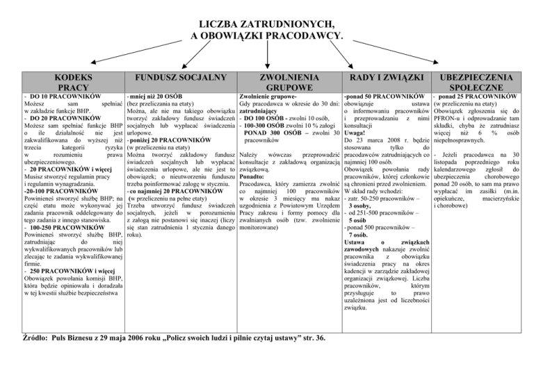 LICZBA ZATRUDNIONYCH, A OBOWIĄZKI PRACODAWCY. KODEKS PRACY FUNDUSZ SOCJALNY ZWOLNIENIA GRUPOWE RADY I ZWIĄZKI UBEZPIECZENIA SPOŁECZNE - DO 10 PRACOWNIKÓW Możesz sam spełniać w zakładzie funkcje BHP. - DO 20 PRACOWNIKÓW Możesz sam spełniać funkcje BHP o ile działalność nie jest zakwalifikowana do wyższej niż trzecia kategorii ryzyka w rozumieniu prawa ubezpieczeniowego. - 20 PRACOWNIKÓW i więcej Musisz stworzyć regulamin pracy i regulamin wynagradzania. -20-100 PRACOWNIKÓW Powinieneś stworzyć służbę BHP; na część etatu może wykonywać jej zadania pracownik oddelegowany do tego zadania z innego stanowiska. - 100-250 PRACOWNIKÓW Powinieneś stworzyć służbę BHP, zatrudniając do niej wykwalifikowanych pracowników lub zlecając te zadania wykwalifikowanej firmie. - 250 PRACOWNIKÓW i więcej Obowiązek powołania komisji BHP, która będzie opiniowała i doradzała w tej kwestii służbie bezpieczeństwa - mniej niż 20 OSÓB (bez przeliczania na etaty) Można, ale nie ma takiego obowiązku tworzyć zakładowy fundusz świadczeń socjalnych lub wypłacać świadczenia urlopowe. - poniżej 20 PRACOWNIKÓW (w przeliczeniu na etaty) Można tworzyć zakładowy fundusz świadczeń socjalnych lub wypłacać świadczenia urlopowe, ale nie jest to obowiązek; o nieutworzeniu funduszu trzeba poinformować załogę w styczniu. - co najmniej 20 PRACOWNIKÓW (w przeliczeniu na pełne etaty) Trzeba utworzyć fundusz świadczeń socjalnych, jeżeli w porozumieniu z załogą nie postanowi się inaczej (liczy się stan zatrudnienia 1 stycznia danego roku). Zwolnienie grupoweGdy pracodawca w okresie do 30 dni: zatrudniający - DO 100 OSÓB - zwolni 10 osób, - 100-300 OSÓB zwolni 10 % załogi PONAD 300 OSÓB – zwolni 30 pracowników -ponad 50 PRACOWNIKÓW obowiązuje ustawa o informowaniu pracowników i przeprowadzaniu z nimi konsultacji Uwaga! Do 23 marca 2008 r. będzie stosowana tylko do pracodawców zatrudniających co najmniej 100 osób. Obowiązek powołania rady pracowników, której członkowie są chronieni przed zwolnieniem. W skład rady wchodzi: - zatr. 50-250 pracowników – 3 osoby, - od 251-500 pracowników – 5 osób - ponad 500 pracowników – 7 osób. Ustawa o związkach zawodowych nakazuje zwolnić pracownika z obowiązku świadczenia pracy na okres kadencji w zarządzie zakładowej organizacji związkowej. Liczba pracowników, którym przysługuje to prawo uzależniona jest od liczebności związku. - ponad 25 PRACOWNIKÓW (w przeliczeniu na etaty) Obowiązek zgłoszenia się do PFRON-u i odprowadzanie tam składki, chyba że zatrudniasz więcej niż 6 % osób niepełnosprawnych. Należy wówczas przeprowadzić konsultacje z zakładową organizacją związkową. Ponadto: Pracodawca, który zamierza zwolnić co najmniej 100 pracowników w okresie 3 miesięcy ma nakaz uzgodnienia z Powiatowym Urzędem Pracy zakresu i formy pomocy dla zwalnianych osób (tzw. zwolnienie monitorowane) Źródło: Puls Biznesu z 29 maja 2006 roku „Policz swoich ludzi i pilnie czytaj ustawy” str. 36. - Jeżeli pracodawca na 30 listopada poprzedniego roku kalendarzowego zgłosił do ubezpieczenia chorobowego ponad 20 osób, to sam ma prawo wypłacać im zasiłki (m.in. opiekuńcze, macierzyńskie i chorobowe)