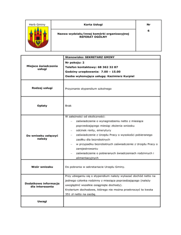 Herb Gminy Karta Usługi Nr 6 Nazwa wydziału/innej komórki organizacyjnej REFERAT OGÓLNY Stanowisko: SEKRETARZ GMINY Nr pokoju: 2 Miejsce świadczenia usługi Telefon kontaktowy: 68 362 32 87 Godziny urzędowania: 7.00 – 15.00 Osoba wykonująca usługę: Kazimierz Kurpiel Rodzaj usługi Opłaty Przyznanie stypendium szkolnego Brak W zależności od okoliczności: − zaświadczenie o wynagrodzeniu netto z miesiące poprzedzającego miesiąc złożenia wniosku Do wniosku załączyć należy − odcinek renty, emerytury − zaświadczenie z Urzędu Pracy o wysokości pobieranego zasiłku dla bezrobotnych − w przypadku bezrobotnych zaświadczenie z Urzędu Pracy o zarejestrowaniu − zaświadczenie o pobieranych świadczeniach rodzinnych i alimentacyjnych Wzór wniosku Do pobrania w sekretariacie Urzędu Gminy. Przy ubieganiu się o stypendium należy wykazać dochód netto na Dodatkowe informacje dla interesanta jednego członka rodzinny z miesiąca poprzedzającego (należy uwzględnić wszelkie osiągnięte dochody). Kryterium dochodowe, którego nie można przekroczyć to kwota 351 zł netto na osobę. Uwagi