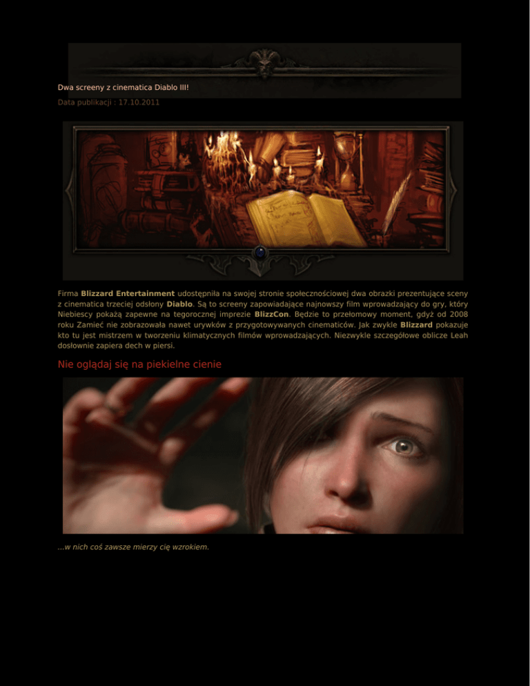 Dwa screeny z cinematica Diablo III! Data publikacji : 17.10.2011 Firma Blizzard Entertainment udostępniła na swojej stronie społecznościowej dwa obrazki prezentujące sceny z cinematica trzeciej odsłony Diablo. Są to screeny zapowiadające najnowszy film wprowadzający do gry, który Niebiescy pokażą zapewne na tegorocznej imprezie BlizzCon. Będzie to przełomowy moment, gdyż od 2008 roku Zamieć nie zobrazowała nawet urywków z przygotowywanych cinematiców. Jak zwykle Blizzard pokazuje kto tu jest mistrzem w tworzeniu klimatycznych filmów wprowadzających. Niezwykle szczegółowe oblicze Leah dosłownie zapiera dech w piersi. Nie oglądaj się na piekielne cienie ...w nich coś zawsze mierzy cię wzrokiem. „Ból zalewa rozkosze człowiecze. Kłamstw całun skrywa prawdy jego. Nadszedł czas, by Piekło nastało na świecie. A śmierć zabrała każdego żywego." - z napisów, pisanych krwią przez nieznanego autora w jaskini Guhawj, w Kehjistanie. Źródło: battle.net Autor: Dominik "BeLial" Misiak Data publikacji : 17.10.2011 Data modyfikacji : 17.10.2011 Liczba wyświetleń tekstu: 9914 Tagi: Blizzard Entertainment, cinematic trailer, trailer POWRÓT DRUKUJ PDF POLEĆ ZNAJOMEMU Komentarz (79) dodaj komentarz co do loterii gorące info :P "The heroes of the week have been chosen! We've sent out emails to 200 sweepstakes winners who may now take the fight to the Skeleton King in the Diablo III beta. If you weren't among the first and fortunate few, there will be plenty of opportunities to come! Don't forget to enter the sweepstakes now if you've not done so already. The next round winners will be randomly selected next week."~Szysiek 2011/10/18 22:04 Heh i jak zwykle tak jak w lotto...nul~Kaminiu 2011/10/18 22:10 wygrana klucza chyba nie jest do końca przesądzona skoro pisali że mejle mogą parę dni schodzić~ Nefahrin 2011/10/18 22:49 No maila z loterii nie dostałem. A tak przy okazji znowu zmienili skile dla DH ... niby uznali, że nie da rady na inferno a osłabili mu w % dmg skili ;/~RedVirus 2011/10/18 23:02 Ja nie zauważyłem zmian, o które skille chodzi?~piega 2011/10/18 23:08 Myśle, że na blizzconie dużo dowiemy się o DH, runach i cinematicu~Gieszu 2011/10/18 23:09 Jak ktoś dostanie zaproszenie + ten dodatkowy klucz to chętnie odkupię ten dodatkowy. :)~Edi-WM2011/10/18 23:11 Edi kup se na ebayu :) http://www.ebay.pl/sch/i.html?_from=R40&_trksid=m570&_nkw=Diablo+3+Beta&_sacat=See-All-Categories ~Blade 2011/10/18 23:14 Niemal wszystkie zostały osłabione poza tym teraz impale z runą alabaster nie daje 500% DMG tylko w razie krytyka dodaje 350%. Jednym słowem z dobrego skila na bosa robi się mało użyteczny skill chyba, że ma sie 100% krytyka.~RedVirus 2011/10/18 23:19 @Blade jakim cudem to znalazłeś :P ? przeszukuję ebay i allegro od dłuższego czasu i nigdy nic nie znajduje. Co wpisałeś przy wyszukiwaniu ? A już wiem dlaczego, gdy przeszukuję ebay.com to wyświetla też aukcje z UK i innych krajów ale nie wyświetla tych z Niemiec nie wiem dlaczego :P trzeba było od razu szukać na ebay.pl ;) No nic troszkę za drogo jak dla mnie 600+ zł zdesperowany nie jestem. Poczekam jak się pojawi więcej zaproszeń tym samym aukcji i zrobi się konkurencja :P~Edi-WM2011/10/18 23:57 Według mnie wydać 600 zł za coś co nie jest nawet demem, nieważne jak zajebistej gry jest objawem kretyństwa i powinno takiego człowieka się hospitalizować.~Sok 2011/10/19 00:02 @RedVirus Ze skillami nic się nie stało, tylko od jakiegoś czasu kalkulator pokazuje runy 4-poziomu, a nie 7. Dotyczy to nie tylko DH~piega 2011/10/19 00:17 No 600 stow to ostre przegiecie.~Edi-WM2011/10/19 00:18 Nom. W koncu 600 stow daje nam dokladnie 60000. Osobiscie nie dalbym na bete 1 stowy mimo, ze jestem fanboyem i czekam jak kretyn na klucz.~Dixell 2011/10/19 00:30 Co do tłumaczenia - cóż, kiedyś tam był wierszyk przetłumaczony - ciary przechodziły za każdym razem jak go czytałem... Teraz ten zapisek krwią - czytam po ang. - no ledwo co mnie rusza... Czytam po polsku - mimo iż czytałem to już chyba ze 20 razy i tak ciary przechodzą... Więc - kto co lubi ;) Jeśli cała gra będzie tak przetłumaczona - no to coś czuję, że studia pójdą w cholerę :P Btw, nie wiem czy była o tym jakaś mowa... Ktoś tam wspominał o Czarnym kamieniu dusz... A zapisek mówi o kimś, kogo skrywa całun kłamstw... Z tego by mogło wychodzić, że na obrazku widzimy Pana Kłamstwa - Belial'a... A Czarny kamień duszy jest jego kamieniem.~Grabasz 2011/10/19 00:43 Co to jest "screen"? Co to jest "cinematica"? Ktoś to może na polski przetłumaczyć?~panVonTrobian 2011/10/19 01:07 @ panVonTrobian Już spieszę z tłumaczeniem- "screen" to tzw. screenshot a "cinematic" to dokładnie to co jest napisane Cieszę się, że mogłem pomóc na przyszłość polecam korzystanie z tego okrągło-kształtnego obiektu znajdującego się na szyi ale w razie czego zawsze dam pomocną odpowiedź!~GoSexySoo 2011/10/19 08:02 Ja rowniez tak zdesperowany nie jestem zeby wydawac 600zl :) moze ktos kupi wolna wola :) ja mam aktualnie inne wydatki na glowie . Sok kij ci do tego kto i na co wydaje swoja kase , jeden lubi to drugi tamto proste :)~Blade 2011/10/19 08:16 Uwazajcia na ta aukcje za 600zl. TO jest klucz z blizzconu 2007 a ten klucz BYŁ TYLKO DO BETY SC2. Jak juz chcecie kupowac to tylko zamarkowane konto ;/~ZealotAttack 2011/10/19 09:16 Sądziłem, że będą właśnie takie ceny. Czekam na pierwsze polskie i aukcje, ale się chyba nie doczekam :)~ midzi 2011/10/19 09:50 klucz za 600 patoli, co za ludzie...~Pipen7 2011/10/19 09:58 600 zł to cena pakiety Batman Arkham City, Skyrim i Diablo 3 (jeśli cena będzie zblizona do sc2) więc ludzie którzy to wezmą powinni rozwarzyć fakt, że za tą cenę bedą mieli Diablo 3 i dwie inne gry:) No chyba, że ktoś naprawdę ma kabzy jak lodu i nie ma co z nią robić to może sobie kupić~Gieszu 2011/10/19 10:28 @Gieszu no wlasnie do taki