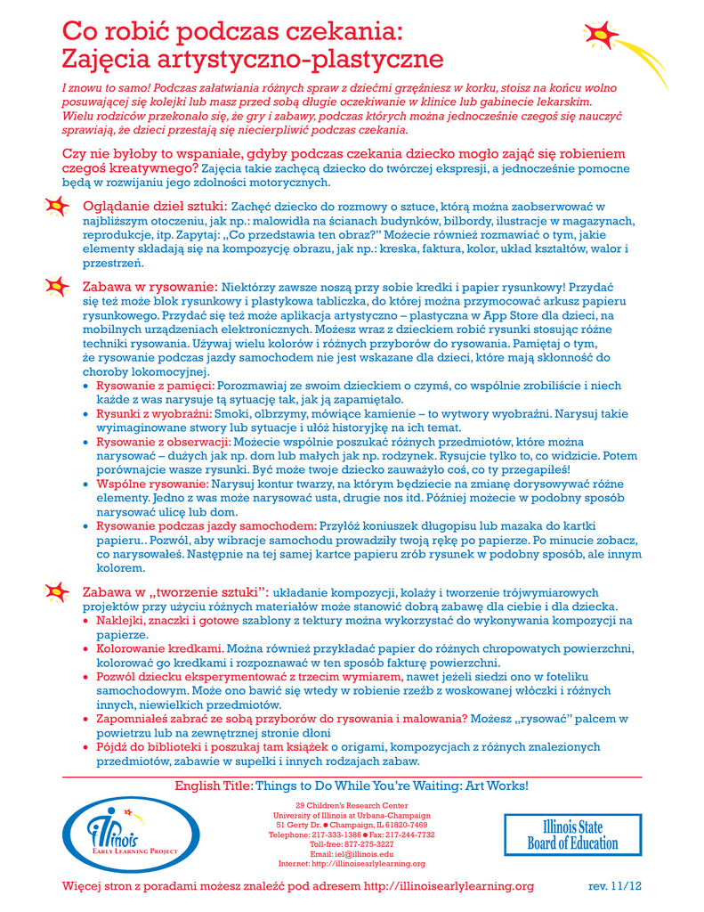 Co robić podczas czekania: Zajęcia artystyczno-plastyczne I znowu to samo! Podczas załatwiania różnych spraw z dziećmi grzęźniesz w korku, stoisz na końcu wolno posuwającej się kolejki lub masz przed sobą długie oczekiwanie w klinice lub gabinecie lekarskim. Wielu rodziców przekonało się, że gry i zabawy, podczas których można jednocześnie czegoś się nauczyć sprawiają, że dzieci przestają się niecierpliwić podczas czekania. Czy nie byłoby to wspaniałe, gdyby podczas czekania dziecko mogło zająć się robieniem czegoś kreatywnego? Zajęcia takie zachęcą dziecko do twórczej ekspresji, a jednocześnie pomocne będą w rozwijaniu jego zdolności motorycznych. Oglądanie dzieł sztuki: Zachęć dziecko do rozmowy o sztuce, którą można zaobserwować w najbliższym otoczeniu, jak np.: malowidła na ścianach budynków, bilbordy, ilustracje w magazynach, reprodukcje, itp. Zapytaj: „Co przedstawia ten obraz?” Możecie również rozmawiać o tym, jakie elementy składają się na kompozycję obrazu, jak np.: kreska, faktura, kolor, układ kształtów, walor i przestrzeń. Zabawa w rysowanie: Niektórzy zawsze noszą przy sobie kredki i papier rysunkowy! Przydać się też może blok rysunkowy i plastykowa tabliczka, do której można przymocować arkusz papieru rysunkowego. Przydać się też może aplikacja artystyczno – plastyczna w App Store dla dzieci, na mobilnych urządzeniach elektronicznych. Możesz wraz z dzieckiem robić rysunki stosując różne techniki rysowania. Używaj wielu kolorów i różnych przyborów do rysowania. Pamiętaj o tym, że rysowanie podczas jazdy samochodem nie jest wskazane dla dzieci, które mają skłonność do choroby lokomocyjnej. Rysowanie z pamięci: Porozmawiaj ze swoim dzieckiem o czymś, co wspólnie zrobiliście i niech każde z was narysuje tą sytuację tak, jak ją zapamiętało. Rysunki z wyobraźni: Smoki, olbrzymy, mówiące kamienie – to wytwory wyobraźni. Narysuj takie wyimaginowane stwory lub sytuacje i ułóż historyjkę na ich temat. Rysowanie z obserwacji: Możecie wspólnie poszukać różnych przedmiotów, które można narysować – dużych jak np. dom lub małych jak np. rodzynek. Rysujcie tylko to, co widzicie. Potem porównajcie wasze rysunki. Być może twoje dziecko zauważyło coś, co ty przegapiłeś! Wspólne rysowanie: Narysuj kontur twarzy, na którym będziecie na zmianę dorysowywać różne elementy. Jedno z was może narysować usta, drugie nos itd. Później możecie w podobny sposób narysować ulicę lub dom. Rysowanie podczas jazdy samochodem: Przyłóż koniuszek długopisu lub mazaka do kartki papieru.. Pozwól, aby wibracje samochodu prowadziły twoją rękę po papierze. Po minucie zobacz, co narysowałeś. Następnie na tej samej kartce papieru zrób rysunek w podobny sposób, ale innym kolorem. Zabawa w „tworzenie sztuki”: układanie kompozycji, kolaży i tworzenie trójwymiarowych projektów przy użyciu różnych materiałów może stanowić dobrą zabawę dla ciebie i dla dziecka. Naklejki, znaczki i gotowe szablony z tektury można wykorzystać do wykonywania kompozycji na papierze. Kolorowanie kredkami. Można również przykładać papier do różnych chropowatych powierzchni, kolorować go kredkami i rozpoznawać w ten sposób fakturę powierzchni. Pozwól dziecku eksperymentować z trzecim wymiarem, nawet jeżeli siedzi ono w foteliku samochodowym. Może ono bawić się wtedy w robienie rzeźb z woskowanej włóczki i różnych innych, niewielkich przedmiotów. Zapomniałeś zabrać ze sobą przyborów do rysowania i malowania? Możesz „rysować” palcem w powietrzu lub na zewnętrznej stronie dłoni Pójdź do biblioteki i poszukaj tam książek o origami, kompozycjach z różnych znalezionych przedmiotów, zabawie w supełki i innych rodzajach zabaw. English Title: Things to Do While You’re Waiting: Art Works! Early Learning Project 29 Children’s Research Center University of Illinois at Urbana-Champaign 51 Gerty Dr.Champaign, IL 61820-7469 Telephone: 217-333-1386Fax: 217-244-7732 Toll-free: 877-275-3227 Email: [email protected] Internet: http://illinoisearlylearning.org Illinois State Board of Education Więcej stron z poradami możesz znaleźć pod adresem http://illinoisearlylearning.org rev. 11/12