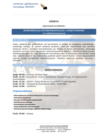 Centrum Szkoleniowo Doradcze ERUDIO OFERTA Zapraszamy na szkolenie: KOMUNIKACJA INTERPERSONALNA i ASERTYWNOŚĆ w codziennej pracy CEL SZKOLENIA: Celem szkolenia jest podkreślenie roli komunikacji na drodze do osiągnięcia zawodowego i osobistego sukcesu. W ramach szkolenia powiemy, czym jest komunikacja oraz poznamy skuteczne formy i narzędzia komunikowania się. Wiedza na temat asertywności, aktywnego słuchania czy barier komunikacyjnych z pewnością pomoże wybrnąć z niejednej trudnej sytuacji. Szkolenie kierujemy do osób, dla których komunikacja pełni w codziennej pracy bardzo ważną rolę i pomoże również tym, którzy chcą podnieść jakość swoich działań i relacji międzyludzkich poprzez rozwój umiejętności komunikacyjnych. Szkolenie obejmuje wykłady, warsztaty, i ćwiczenia. RAMOWY PROGRAM SZKOLENIA: DZIEŃ PIERWSZY: Godz. 08.00 – wyjazd z Zielonej Góry Godz. 12.30 – przyjazd do Kowar i zwiedzanie Kopalni Uranu w towarzystwie przewodnika Godz. 13.30 – obiad w Pubie Markowy Gwarek (na terenie kopalni) Godz. 15.30 – przyjazd do Świeradowa Zdrój – hotel ERA Godz. 16.00 – szkolenie Program szkolenia: - Wprowadzenie do komunikowania się perswazyjnego. - Interakcja społeczna. - Zasady kształtowania wypowiedzi. - Kształtowanie dialogu. - Komunikacja perswazyjna. - Typy osobowości biznesowych. - Zasady bezpośredniego wpływu społecznego. Godz. 20:00 – kolacja Centrum Szkoleniowo Doradcze ERUDIO 65-140 Zielona Góra, Wyczółkowskiego 29, www.facebook.com/erudio.zg e-mail : [email protected] , tel/fax. 068 3267498, 507 48 48 03 Centrum Szkoleniowo Doradcze ERUDIO DZIEŃ DRUGI: Godz. 8:00 – śniadanie Godz. 8:30 – szkolenie Program szkolenia: - Asertywność w sytuacjach stresowych. - Rozwijanie postawy asertywnej. - Rozwijanie umiejętności asertywnego zachowania się w różnych sytuacjach społecznych. Godz. 15:00 – obiad TERMIN SZKOLENIA: 16 – 17 października 2014 r. MIEJSCE SZKOLENIA: Hotel ERA ul. Zakopiańska 20 Świeradów Zdrój Wielkim atutem hotelu jest ciekawa lokalizacja. 3-gwiazdkowy hotel Era znajduje się w odległości wynoszącej jedynie 100 m od wyciągu narciarskiego Ski & Sun i w odległości Centrum Szkoleniowo Doradcze ERUDIO 65-140 Zielona Góra, Wyczółkowskiego 29, www.facebook.com/erudio.zg e-mail : [email protected] , tel/fax. 068 3267498, 507 48 48 03 Centrum Szkoleniowo Doradcze ERUDIO 400 m od serca Świeradowa-Zdroju. Tradycyjnie zaprojektowane komfortowe oraz przytulne pokoje wykończone zostały w stonowanych barwach. W każdym pokoju jest minibar, telewizor LCD i łazienka z kabiną prysznicową oraz suszarką do suszenia włosów. Hotel oferuje darmową wodę w butelkach. Turyści mogą korzystać z ogrodu oraz sprzętu do grillowania. Klimatyzowana restauracja w obiekcie Era podaje wyrafinowane potrawy kuchni polskiej i europejskiej (poziom hotelu można sprawdzić na booking.com - ocena 9,0/10 - najwyższa wśród hoteli w Świeradowie, na tripadvisor.pl 6/6 - najwyższa w Świeradowie ), bowiem szefem kuchni jest najlepszy w Świeradowie kucharz. Restauracja może pochwalić się balkonem, z którego można oglądać widok na Góry Izerskie. Śniadania podawane są w postaci obfitego szwedzkiego stołu. Turyści mogą swobodnie korzystać z komputera, który jest zlokalizowany w recepcji. W całym hotelu zainstalowane zostało darmowe WiFi, z którego mogą korzystać mogą wszyscy Goście obiektu. Hotel jest również wyposażony w Centrum regeneracji biologicznej oraz Centrum wellness, w którym można skorzystać z bogatej oferty zabiegów upiększających oraz relaksujących - zawiera saunę i wannę z funkcją masażu wodnego . Do najważniejszych atrakcji Świeradowa-Zdroju należą: Dom Zdrojowy Hala Spacerowa 46 metrowa wieża zegarowa z galerią widokową Pomnik żaby w Parku Zdrojowym Izerski Punkt antygrawitacyjny Czarci Młyn CENA SZKOLENIA: 550,00 zł od osoby Podana cena zawiera: pobyt w hotelu, wyżywienie, uczestnictwo w zajęciach szkoleniowych, materiały szkoleniowe, materiały piśmiennicze, zwiedzanie kopalni uranu, certyfikat uczestnictwa. Warunkiem udziału w szkoleniu jest przesłanie pisemnego zlecenia z określeniem liczby uczestników do dnia 30.09.2014 r. oraz dokonanie nie później niż na 7 dni przed terminem szkolenia pełnej wpłaty na konto organizatora – Centrum Szkoleniowo Doradcze ERUDIO – 56 1950 0001 2006 0776 9874 0002 IDEA Bank S.A Zielona Góra. W przypadku odwołania zgłoszenia później niż na 7 dni przed rozpoczęciem szkolenia uczestnik ponosi jego pełne koszty. Nieodwołanie zgłoszenia i niewzięcie udziału w szkoleniu spowoduje obciążenie pełnymi kosztami uczestnictwa. Oświadczenie dotyczące odwołania zgłoszenia wymaga formy pisemnej. Odwołanie zgłoszenia w terminie krótszym niż 7 dni przed rozpoczęciem szkolenie nie zwalnia uczestnika z obowiązku zapłaty za szkolenie. W każdym czasie możliwe jest wyznaczenie innego uczestnika na szkolenie. Centrum Szkoleniowo Doradcze ERUDIO 65-140 Zielona Góra, Wyczółkowskiego 29, www.facebook.com/erudio.zg e-mail : [email protected] , tel/fax. 068 3267498, 507 48 48 03
