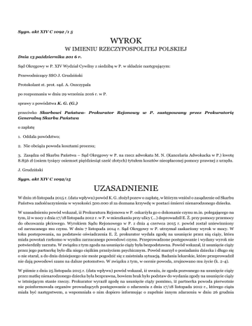 Sygn. akt XIV C 1092 /1 5 WYROK W IMIENIU RZECZYPOSPOLITEJ POLSKIEJ Dnia 13 października 201 6 r. Sąd Okręgowy w P. XIV Wydział Cywilny z siedzibą w P. w składzie następującym: Przewodniczący SSO J. Grudziński Protokolant st. prot. sąd. A. Oszczypała po rozpoznaniu w dniu 29 września 2016 r. w P. sprawy z powództwa K. G. (G.) przeciwko Skarbowi Państwa- Prokurator Rejonowy w P. zastępowany przez Prokuratorię Generalną Skarbu Państwa o zapłatę 1. Oddala powództwo; 2. Nie obciąża powoda kosztami procesu; 3. Zasądza od Skarbu Państwa – Sąd Okręgowy w P. na rzecz adwokata M. N. (Kancelaria Adwokacka w P.) kwotę 8.856 zł (osiem tysięcy osiemset pięćdziesiąt sześć złotych) tytułem kosztów nieopłaconej pomocy prawnej z urzędu. J. Grudziński Sygn. akt XIV C 1092/15 UZASADNIENIE W dniu 16 listopada 2015 r. (data wpływu) powód K. G. złożył pozew o zapłatę, w którym wniósł o zasądzenie od Skarbu Państwa zadośćuczynienia w wysokości 500.000 zł za doznana krzywdę w postaci śmierci nienarodzonego dziecka. W uzasadnieniu powód wskazał, iż Prokuratura Rejonowa w P. oskarżyła go o dokonanie czynu m.in. polegającego na tym, iż w nocy z dnia 17/18 listopada 2012 r. w P. w mieszkaniu przy ulicy (...) doprowadził E. Ż. przy pomocy przemocy do obcowania płciowego. Wyrokiem Sądu Rejonowego w P. z dnia 4 czerwca 2015 r. powód został uniewinniony od zarzucanego mu czynu. W dniu 7 listopada 2014 r. Sąd Okręgowy w P. utrzymał zaskarżony wyrok w mocy. W toku postepowania, na podstawie oświadczenia E. Ż. prokurator wydała zgodę na usunięcie przez nią ciąży, która miała powstań rzekomo w wyniku zarzucanego powodowi czynu. Przeprowadzone postępowanie i wydany wyrok nie potwierdziły zarzutu. W związku z tym zgoda na usunięcie ciąży była bezpodstawna. Powód wskazał, iż usunięcie ciąży przez jego partnerkę było dla niego ciężkim przeżyciem psychicznym. Powód marzył o posiadaniu dziecka i długo się o nie starał, a do dnia dzisiejszego nie może pogodzić się z zaistniała sytuacją. Badania lekarskie, które przeprowadził nie dają powodowi szans na dalsze potomstwo. W związku z tym, w ocenie powoda, zrujnowano mu życie (k. 2-4). W piśmie z dnia 25 listopada 2015 r. (data wpływu) powód wskazał, iż uważa, że zgoda pozwanego na usunięcie ciąży przez matkę nienarodzonego dziecka była bezprawna, bowiem brak było podstaw do wydania zgody na usunięcie ciąży w istniejącym stanie rzeczy. Prokurator wyraził zgodę na usunięcie ciąży pomimo, iż partnerka powoda pierwotnie nie poinformowała organów prowadzących postępowanie o zdarzeniu z dnia 17/18 listopada 2012 r., którego ciąża miała być następstwem, a wspomniała o nim dopiero informując o zupełnie innym zdarzeniu w dniu 26 grudnia 2012 r. Informując o zdarzeniu z listopada 2012 r. E. Ż. podała prokuratorowi, iż w listopadzie 2012 r. wielokrotnie współżyła z powodem i nie potrafiła dokładnie powiedzieć, czy ciąża była efektem rzekomego zgwałcenia, czy też nie. Powód wskazał, że w chwili wydania zgody na usunięcie ciąży nie zachodziło nawet prawdopodobieństwo, iż pochodzi ona z czynu zabronionego. Błędna decyzja prokuratora w tym zakresie doprowadziła w konsekwencji do śmierci nienarodzonego dziecka (k. 12). W odpowiedzi na pozew z dnia 15 stycznia 2016 r. (data wpływu) pozwany Skarb Państwa wniósł o oddalenie powództwa w całości. Pozwany podniósł także zarzut przedawnienia roszczenia. W uzasadnieniu pozwany wskazał, iż Prokuratura Rejonowa w P. nadzorowała śledztwo przeciwko K. G. oskarżonemu o popełnienie trzech przestępstw, dwóch z art. 197 § 1 k.k. oraz jednego z art. 191 § 1 k.k. Pozwany wskazał, iż dnia 26 grudnia 2012 r. E. Ż. zawiadomiła Komendę Powiatowa Policji o tym, że została zgwałcona przez swojego konkubenta K. G.. Do zgwałcenia miało dojść dwukrotnie tj. w nocy z 17 na 18 listopada 2012 r. oraz w nocy z 25 na 26 grudnia 2012 r. poszkodowana została niezwłocznie poddana badaniu ginekologicznemu pod kątem doznanych obrażeń i pobrania materiału genetycznego. W czasie badania lekarz stwierdził 8/9 tydzień ciąży. Poszkodowana wskazała, że w związku z pierwszym gwałtem zaszła w ciążę. Świadkowie potwierdzili, że w listopadzie widziały u pokrzywdzonej obrażenia i mówiła ona, że została pobita przez konkubenta. Postanowieniem z dnia 28 grudnia 2012 r. Sąd rejonowy w P. zastosował wobec powoda środek zapobiegawczy w postaci tymczasowego aresztowania, a postanowieniem z dnia 16 stycznia 2013 r. Sąd Okręgowy w p. utrzymał zaskarżone postanowienie o zastosowaniu środka zapobiegawczego w mocy. Dnia 3 stycznia 2013 r. E. Ż. wystąpiła do prokuratury Rejonowej w P. z zapytaniem, czy istnieje uzasadnione podejrzenie, iż do ciąży doszło w wyniku gwałtu. Dnia 3 stycznia 2013 r. Prokurator Rejonowy w P. udzielił odpowiedzi, iż zachodzi uzasadnione podejrzenie, że ciąża powstała w wyniku czynu zabronionego. Ostatecznie prowadzone postepowanie przygotowawcze doprowadziło do wniesienia przez prokuraturę Rejonową w P. przeciwko K. G. aktu oskarżenia. W wyniku przeprowadzonego postepowania sądowego, wyrokiem z dnia 11 lipca 2013 r. Sąd Rejonowy w P. w sprawie o sygn. II K 205/13 uniewinnił oskarżonego od popełnienia zarzucanego mu czynu tj. gwałtu, a w odniesieniu do zdarzenia z nocy 17/18 listopada 2012 r., a jednocześnie uznał K. G. za winnego zarzucanego mu czynu z art. 191 § 1 k.k. w odniesieniu do zdarzenia z nocy 17/18 listopada 2012 r. wymierzając mu karę 4 miesięcy pozbawienia wolności oraz czynu gwałtu w odniesieniu do zdarzenia z nocy 25/26 grudnia 2012 r. za co K. G. został skazany na okres dwóch lat pozbawienia wolności. W wyniku apelacji wniesionej przez każdą ze stron wyrok został uchylony w zakresie części uniewinniającej i w tym zakresie sprawa została przekazana do ponownego rozpoznania. W