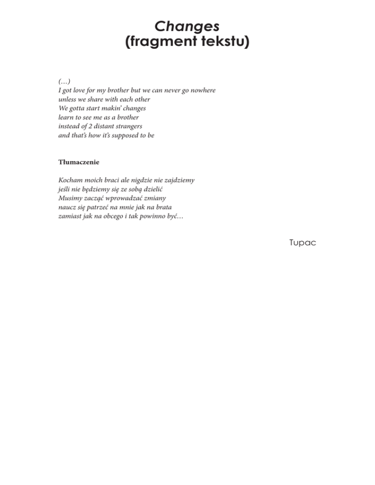 Changes (fragment tekstu) (…) I got love for my brother but we can never go nowhere unless we share with each other We gotta start makin’ changes learn to see me as a brother instead of 2 distant strangers and that’s how it’s supposed to be Tłumaczenie Kocham moich braci ale nigdzie nie zajdziemy jeśli nie będziemy się ze sobą dzielić Musimy zacząć wprowadzać zmiany naucz się patrzeć na mnie jak na brata zamiast jak na obcego i tak powinno być… Tupac