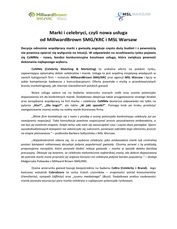 Marki i celebryci, czyli nowa usługa od MillwardBrown SMG/KRC i MSL Warsaw Decyzja odnośnie współpracy marki z gwiazdą angażuje często duży budżet i z pewnością nie powinna opierać się wyłącznie na intuicji. W odpowiedzi na oczekiwania rynku pojawia się CeMMa - nowa, bardzo konkurencyjna kosztowo usługa, która zwiększa pewność dokonania najlepszego wyboru. CeMMa (Celebrity Matching & Marketing) to unikalna oferta na polskim rynku, zapewniająca optymalny dobór celebrytów i marek. Usługa ta jest wspólną inicjatywą wiodących w swoich kategoriach firm – instytutu MillwardBrown SMG/KRC oraz agencji MSL Warsaw i łączy w sobie kompetencje badawcze z komunikacyjnymi. Oferta powstała z myślą o przedstawicielach branży marketingowej, jak również menedżerach polskich gwiazd. Nowa usługa opiera się na badaniu wizerunku znanych osób oraz ocenie potencjału dopasowania ich do konkretnych marek. Dodatkowo obejmuje także przygotowanie strategii działań oraz zarządzanie współpracą na linii marka – celebryta. CeMMa dostarcza odpowiedzi nie tylko na pytania „Kto?”, „Dla kogo?”, ale także „W jaki sposób?”. Pomaga krok po kroku przełożyć zaangażowanie znanej osoby na realny wynik biznesowy firmy. „Wiele firm kontaktuje się z nami z prośbą o ocenę potencjału konkretnego celebryty już po nawiązaniu negocjacji. Taka konsultacja powinna rozpoczynać proces poszukiwania ambasadora, a nie być jej ostatnim etapem. Dzięki temu uda nam się zaoszczędzić czas i często duże pieniądze. Sporo wysokobudżetowych kampanii nie zakończyło się sukcesem, ponieważ zabrakło tego elementu jeszcze na etapie planowania.” – podkreśla Barbara Sołtysińska z MSL Warsaw. „Niejednokrotnie zdarza się, że o wyborze celebryty, jako ambasadora marki lub centralnej postaci kampanii reklamowej decyduje jedynie popularność gwiazdy. Chcemy zerwać z tą praktyką, proponujemy narzędzie, które pozwala śledzić relacje gwiazda – marka w sposób daleko bardziej precyzyjny. Okazuje się bowiem, że celebryta niekoniecznie najbardziej znany, ale dobrze dopasowany do potrzeb marki może przynieść jej większe korzyści niż celebryta jedynie bardzo popularny.” – dodaje Małgorzata Poławska z Millward Brown SMG/KRC. Ocena wizerunku gwiazd bazuje bezpośrednio na badaniu CeBra (Celebrity + Brand). Jego końcowy wskaźnik CebraScore to suma trzech czynników – znajomości wśród konsumentów (Familiarity), sympatii (Affinity) oraz „szumu medialnego” (Buzz). Dodatkowa analiza osobowości marek pozwala wyznaczyć pary marka-celebryta o najlepszym potencjale rynkowym. Po dokonaniu wyboru opracowana zostaje rekomendacja konkretnych działań. Obejmuje ona m.in: Sprawdzenie możliwości nawiązania współpracy (zarówno celebryty, jak i marki) Rynkowa estymacja kosztów współpracy Kompleksową strategię komunikacji wraz z zestawem narzędzi Zarządzenie procesem podpisania umowy wraz z negocjacjami CeMMa to oferta kompleksowa, ale jednocześnie niezwykle korzystna kosztowo – dostępna jest już od 3000 zł netto. Cena ta obejmuje badanie wizerunkowe jednej gwiazdy wraz z rekomendacją działań komunikacyjnych. Zainicjowana usługa ma charakter modułowy. Konkretne narzędzia dobierane są indywidualnie, w zależności od oczekiwań zainteresowanych. Co więcej, powinna być postrzegana przede wszystkim jako inwestycja pozwalająca bezpiecznie alokować budżet, a nie jako dodatkowy koszt. CeMMa to efekt współpracy obu firm w ramach Creative Communication Cluster (www.creativecluster.eu). *** MillwardBrown SMG/KRC Instytut Badania Rynku i Opinii Publicznej SMG/KRC (www.smgkrc.pl) powstał w 1990 roku. W ciągu dwudziestu lat swojej działalności stał się największym ośrodkiem badań marketingowych w Polsce i na całym obszarze Europy Środkowej i Wschodniej. Firma specjalizuje się w: badaniach komunikacji masowej i kondycji marek (pre-testy, post-testy reklam, trackingi, badania strategii i kondycji marek), zaawansowanych badaniach jakościowych, badaniach mediów. Najlepiej znane projekty prowadzone przez SMG/KRC to: Target Group Index (studium konsumpcji marek i mediów), PBC (drugi co do wielkości w Europie system pomiaru czytelnictwa prasy), Radio Track (drugi co do wielkości w Europie system pomiaru słuchalności radia), CAPIBUS, Omnibus „Matki” i Omnibus „Młodzież”, Net Track - badanie użytkowników polskiego Internetu. Od 2000 roku instytut SMG/KRC Poland jest członkiem globalnej sieci Millward Brown International i funkcjonuje pod nazwą Millward Brown SMG/KRC. Millward Brown SMG/KRC posiada międzynarodowy certyfikat jakości dla instytutów badania rynku i opinii ISO 20252. MSL Warsaw Firma doradcza, opracowująca i realizująca programy public relations w pełnym zakresie (www.mslwarsaw.pl). Agencja istnieje od 1999 roku. MSL Warsaw jest częścią MSLGROUP – sieci komunikacyjnej zatrudniającej ponad 3 000 osób w 22 krajach. MSLGROUP posiada biura w ponad 80 krajach, wliczając w to agencje partnerskie. Działa na terytorium obu Ameryk, Europy Środkowo-Wschodniej i Azji. MSLGROUP jest częścią Publicis Groupe, trzeciej największej sieci komunikacyjnej na świecie działającej na terenie 104 krajów i zatrudniającej 43 tys. specjalistów. MSL Warsaw ma silne doświadczenie w realizacji projektów z zakresu Consumer Marketing, ze szczególnym uwzględnieniem Influencer Marketing. Osoby kontaktowe: Kuba Antoszewski, Tel. +48 22 54 52 000; +48 501 249 803, [email protected] Barbara Sołtysińska, Tel. +48 22 444 48 30; +48 662 110 601, [email protected]