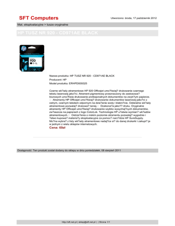 SFT Computers Utworzono: środa, 17 październik 2012 Mat. eksploatacyjne > tusze oryginalne HP TUSZ NR 920 - CD971AE BLACK Nazwa produktu: HP TUSZ NR 920 - CD971AE BLACK Producent: HP Model produktu: ERHPD009325 Czarne wk?ady atramentowe HP 920 Officejet umo?liwiaj? drukowanie czarnego tekstu laserowej jako?ci. Atrament pigmentowy przeznaczony do zastosowa? biurowych umo?liwia drukowanie profesjonalnych dokumentów na zwyk?ym papierze. Atramenty HP Officejet umo?liwiaj? drukowanie dokumentów laserowej jako?ci z ostrym, czarnym tekstem odpornym na dzia?anie wody i blakni?cie. Oddzielne wk?ady atramentowe pozwalaj? drukowa? taniej. Doskona?a jako?? druku. Oryginalne atramenty HP Officejet umo?liwiaj? drukowanie szybko wysychaj?cych dokumentów, zw?aszcza na papierach z logo ColorLok. Technologia HP u?atwia wymian? wk?adów atramentowych. Ostrze?enia o niskim poziomie atramentu pozwalaj? wygodnie i ?atwo kupowa? materia?y eksploatacyjne za pomoc? narz?dzia HP SureSupply. Mo?na wybra? z listy wk?ady atramentowe nadaj?ce si? do danej drukarki i zakupi? je w jednym z wielu sklepów internetowych. Cena: 69zł Dostępność: Ten produkt został dodany do sklepu w dniu poniedziałek, 08 sierpień 2011 http://sft.net.pl | [email protected] | | Strona 1/1