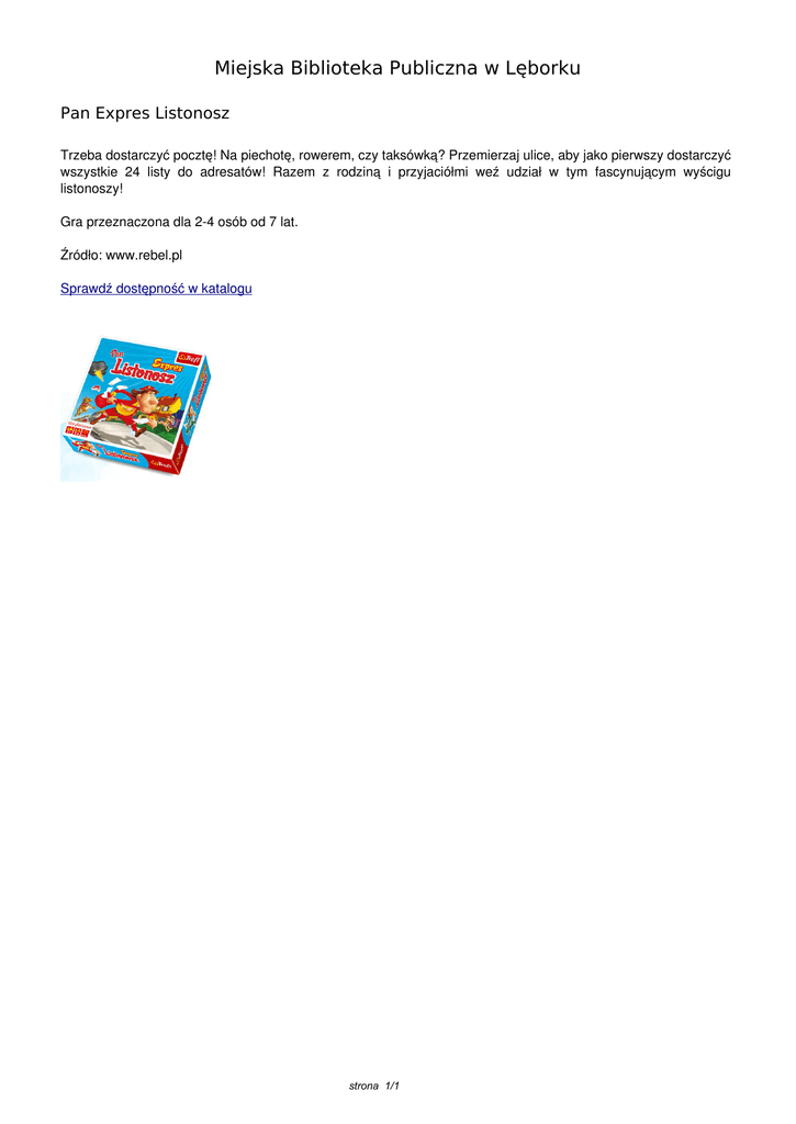 Miejska Biblioteka Publiczna w Lęborku Pan Expres Listonosz Trzeba dostarczyć pocztę! Na piechotę, rowerem, czy taksówką? Przemierzaj ulice, aby jako pierwszy dostarczyć wszystkie 24 listy do adresatów! Razem z rodziną i przyjaciółmi weź udział w tym fascynującym wyścigu listonoszy! Gra przeznaczona dla 2-4 osób od 7 lat. Źródło: www.rebel.pl Sprawdź dostępność w katalogu strona 1/1 Powered by TCPDF (www.tcpdf.org)