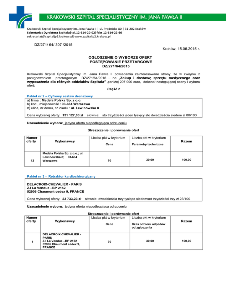 Ogłoszenie o wyborze ofert cz 2 - Krakowski Szpital Specjalistyczny