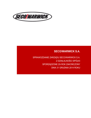 SECO/WARWICK S.A. SPRAWOZDANIE ZARZĄDU SECO/WARWICK S.A. Z DZIAŁALNOŚCI SPÓŁKI SPORZĄDZONE ZA ROK ZAKOŃCZONY DNIA 31 GRUDNIA 2014 ROKU Zarząd Spółki SECO/WARWICK S.A. przekazuje sprawozdanie z działalności Spółki (za okres 01.01.2014 - 31.12.2014 roku), sporządzone zgodnie z postanowieniami § 91 ust. 1 pkt. 4 Rozporządzenia Ministra Finansów z dnia 19 lutego 2009 roku w sprawie informacji bieżących i okresowych przekazywanych przez emitentów papierów wartościowych oraz warunków uznawanych za równoważne informacji wymaganych przepisami prawa państwa nie będącego państwem członkowskim (Dz. U. 2009 Nr 33 poz. 259 z późn. zm.). Sprawozdanie finansowe SECO/WARWICK S.A. sporządzone zostało zgodnie z Międzynarodowymi Standardami Sprawozdawczości Finansowej (MSSF) przyjętymi przez Unię Europejską oraz w zakresie wymaganym przez Rozporządzenie Ministra Finansów z dnia 19 lutego 2009 r. w sprawie informacji bieżących i okresowych przekazywanych przez emitentów papierów wartościowych (Dz. U. nr 33 poz. 259 z późn. zm.) i obejmuje okres od 01 stycznia do 31 grudnia 2014 r. i okres porównywalny od 01 stycznia do 31 grudnia 2013 r. Prezentowane sprawozdanie finansowe odpowiada wszystkim wymaganiom MSSF przyjętym przez Unię Europejską i przedstawia rzetelnie sytuację finansową i majątkową Spółki na 31 grudnia 2014 r. i 31 grudnia 2013 r., jej wyniki oraz przepływy pieniężne za rok zakończony dnia 31 grudnia 2014 r. i 31 grudnia 2013 r. 1. Wstęp SECO/WARWICK S.A. (dalej: „Spółka”, „Spółka dominująca”) została wpisana do rejestru przedsiębiorców KRS 2 stycznia 2007 r. na podstawie postanowienia Sądu Rejonowego w Zielonej Górze, VIII Wydział Gospodarczy KRS z 02 stycznia 2007 r. pod numerem KRS 0000271014. Działalność grupy SECO/WARWICK obejmuje produkcję pięciu głównych grup produktów: pieców próżniowych, linii do lutowania aluminiowych wymienników ciepła, linii do obróbki cieplnej aluminium oraz urządzeń metalurgicznych do topienia, odlewania próżniowego metali i stopów specjalnych. Oferowane grupy produktów są także kluczem do podziału działalności operacyjnej SECO/WARWICK na pięć głównych jednostek biznesowych: piece próżniowe (Vacuum), linie do lutowania aluminiowych wymienników ciepła (Controlled Atmosphere Brazing), linie do obróbki cieplnej aluminium (Aluminum Process), urządzenia do topienia, odlewania próżniowego metali i stopów specjalnych (Piece Topialne), oraz pozostałe. Informacje dotyczące poszczególnych segmentów działalności operacyjnej prezentowane są w skonsolidowanym sprawozdaniu finansowym Grupy Kapitałowej SECO/WARWICK (nota nr 2 do skonsolidowanego sprawozdania finansowego za okres 12 miesięcy zakończony 31 grudnia 2014 roku). 2. Informacje o powiązaniach organizacyjnych i kapitałowych SECO/WARWICK S.A. z innymi podmiotami z określeniem jej głównych inwestycji krajowych i zagranicznych, w tym inwestycji kapitałowych dokonanych poza jego grupą jednostek powiązanych, wraz z opisem metod ich finansowania. Tabela: Na dzień 31 grudnia 2014 roku w skład Grupy SECO/WARWICK wchodziły następujące podmioty: Przedmiot działalności Metoda konsolidacji/ wycena udziałów Procentowy udział Grupy w kapitale podstawowym Wytwarzanie pieców próżniowych, linii do lutowania aluminiowych wymienników ciepła oraz linii do obróbki cieplnej aluminium. Nie dotyczy Nie dotyczy SECO/WARWICK EUROPE Świebodzin Sp. z o.o. Produkcja urządzeń do obróbki cieplnej metali. Pełna 100% SECO/WARWICK Corp. Produkcja urządzeń do obróbki cieplnej metali. Pełna 100% Nazwa podmiotu Siedziba Podmiot dominujący SECO/WARWICK S.A. Świebodzin Spółki zależne bezpośrednio i pośrednio Meadville (USA) SECO/WARWICK Delaware, Inc of Wilmington (USA) Moskwa SECO/WARWICK Rus (Rosja) Ukiah Retech Systems LLC (USA) Działalność holdingowa i rejestracja znaków towarowych i patentów oraz udzielanie licencji na ich używanie przez SECO/WARWICK Corp. Pełna 100% Pośrednictwo w sprzedaży Grupy SECO/WARWICK. Pełna 100% Pełna 100% Pełna 90% produktów Działalność handlowo-usługowa oraz produkcja urządzeń metalurgicznych do topienia, odlewania próżniowego metali i stopów specjalnych. SECO/WARWICK Retech Thermal Equipment Manufacturing Tianjin Co., Ltd. Tianjin (Chiny) Produkcja urządzeń do obróbki cieplnej metali. Retech Tianjin Holdings LLC (USA) Działalność holdingowa. Pełna 80% Produkcja urządzeń do obróbki cieplnej metali. Pełna 75% Pośrednictwo w sprzedaży pieców SECO/WARWICK S.A. i SECO/WARWICK EUROPE Sp. z o.o. oraz usługi doradztwa technicznego dla klientów w Niemczech, Austrii, Holandii, Szwajcarii, Liechtensteinie i Słowenii. Pełna 100% Praw własności 50% Świadczenie usług w dziedzinie termicznej obróbki metali na terenie Niemiec. Pełna 100% Produkcja urządzeń do obróbki cieplnej metali. Pełna 100% SECO/WARWICK Allied Pvt. Mumbai Ltd. (Indie) SECO/WARWICK GmbH Bedburg-Hau (Niemcy) OOO SCT Sołniecznogorsk Świadczenie usług w dziedzinie termicznej obróbki metali na terenie Rosji. (Rosja) SECO/WARWICK GmbH Service Bedburg-Hau (Niemcy) SECO/WARWICK do Brasil Ltda. (Engefor Engenharia Indústria e Comércio Ltda) Jundiai (Brazylia) Zmiany w składzie Grupy SECO/WARWICK w analizowanym okresie Z dniem 04 czerwca 2014 roku zostały spełnione warunki zawieszające nabycia 9.122 udziałów SECO/WARWICK Allied Pvt. Ltd. (Mumbai) Indie SECO/WARWICK Allied oraz dokonanie zapłaty trzeciej części ceny nabycia. W wyniku nabycia 9.122 udziałów, Emitent posiada 82.014 udziałów stanowiących 75,0% kapitału zakładowego spółki oraz uprawniających do 75,0% głosów na Zgromadzeniu Wspólników. Schemat Grupy SECO/WARWICK na dzień 31 grudnia 2014 roku: Skład Grupy SECO/WARWICK na dzień publikacji niniejszego sprawozdania Po dniu 31 grudnia 2014 roku, do dnia publikacji niniejszego sprawozdania skład Grupy Kapitałowej SECO/WARWIC
