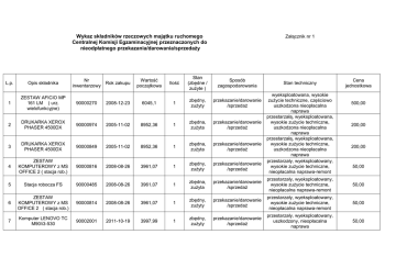 Wykaz składników rzeczowych majątku ruchomego Centralnej Komisji Egzaminacyjnej przeznaczonych do nieodpłatnego przekazania/darowania/sprzedaży Załącznik nr 1 Ilość Stan (zbędne / zużyte ) Sposób zagospodarowania 6045,1 1 zbędny, zużyty przekazanie/darowanie /sprzedaż 2005-11-02 8952,36 1 zbędna, zużyta przekazanie/darowanie /sprzedaż 90000849 2005-11-02 8952,36 1 zbędna, zużyta przekazanie/darowanie /sprzedaż ZESTAW KOMPUTEROWY z MS OFFICE 2 ( stacja rob.) 90000816 2008-08-26 3961,07 1 zbędny, zużyty przekazanie/darowanie /sprzedaż 5 Stacja robocza FS 90000485 2008-08-26 3961,07 1 zbędna, zużyta przekazanie/darowanie /sprzedaż przestarzały, wyeksploatowany, wysokie zużycie techniczne, nieopłacalna naprawa-remont 50,00 6 ZESTAW KOMPUTEROWY z MS OFFICE 2 ( stacja rob.) 90000814 2008-08-26 3961,07 1 zbędny, zużyty przekazanie/darowanie /sprzedaż przestarzały, wyeksploatowany, wysokie zużycie techniczne, nieopłacalna naprawa-remont 50,00 7 Komputer LENOVO TC M90/i3-530 90002001 2011-10-19 3997,99 1 zbędny, zużyty przekazanie/darowanie /sprzedaż przestarzały, wyeksploatowany, uszkodzony, nieopłacalna naprawa 50,00 Nr Rok zakupu inwentarzowy L.p. Opis składnika 1 ZESTAW AFICIO MP 161 LM ( urz. wielofunkcyjne) 90000270 2008-12-23 2 DRUKARKA XEROX PHASER 4500DX 90000974 3 DRUKARKA XEROX PHASER 4500DX 4 Wartość początkowa Stan techniczny wyeksploatowana, wysokie zużycie techniczne, częściowo uszkodzona nieopłacalna naprawa przestarzałą, wyeksploatowana, wysokie zużycie techniczne, uszkodzona nieopłacalna naprawa przestarzałą, wyeksploatowana, wysokie zużycie techniczne, uszkodzona nieopłacalna naprawa przestarzały, wyeksploatowany, wysokie zużycie techniczne, nieopłacalna naprawa-remont Cena jednostkowa 500,00 200,00 200,00 50,00 8 Monitor dell 90001049 b/d 50 1 zbędny, zużyty przekazanie/darowanie /sprzedaż przestarzały, wyeksploatowany 30,00 9 URZĄDZENIE WIELOFUNKCYJNE XEROX 90001635 b/d 2318 1 zbędne, zużyte przekazanie/darowanie /sprzedaż przestarzałe, wyeksploatowane, uszkodzone, nieopłacalna naprawa 30,00 10 Monitor fujitsu siemens 90000941 b/d 50 1 zbędny, zużyty przekazanie/darowanie /sprzedaż przestarzały, wyeksploatowany 30,00 11 DRUKARKA SAMSUNG ML-2851NDR 90001175 2009-12-17 1151,68 1 zbędna, zużyta przekazanie/darowanie /sprzedaż 12 Telefon bezprzewodowy 90000132 2012-12-19 229 1 zbędny, zużyty 13 Lampa biurkowa 90001104 b/d 59,9 1 zbędna, zużyta przekazanie/darowanie /sprzedaż przekazanie/darowanie /sprzedaż przestarzała, wyeksploatowana, wysokie zużycie techniczne, uszkodzona nieopłacalna naprawa i remont wyeksploatowany, wysokie przekazanie/darowanie zużycie techniczne, uszkodzony/sprzedaż nieopłacalna naprawa 14 Drukarka PHASER 3435 90000812 2011-12-18 3 430,00 zł 1 zbędny, zużyty 15 Drukarka PHASER 3435 90001281 2011-12-18 3 430,00 zł 1 zbędna, zużyta przekazanie/darowanie /sprzedaż 16 DRUKARKA XEROX PHASER 4500DX 90000950 2005-11-02 8 952,36 zł 1 zbędna, zużyta przekazanie/darowanie /sprzedaż 17 DRUKARKA XEROX PHASER 4500DX 90000484 2005-11-02 8 952,36 zł 1 zbędna, zużyta przekazanie/darowanie /sprzedaż zniszczona wyeksploatowana, wysokie zużycie techniczne, częściowo uszkodzona nieopłacalna naprawa przestarzałą, wyeksploatowana, wysokie zużycie techniczne, uszkodzona nieopłacalna naprawa przestarzałą, wyeksploatowana, wysokie zużycie techniczne, uszkodzona nieopłacalna naprawa przestarzały, wyeksploatowany, wysokie zużycie techniczne, nieopłacalna naprawa-remont 20,00 20,00 5,00 50,00 50,00 80,00 80,00 18 Skaner IPlus - SOPL1500 Plustek SmartOffice PL1500 90001234 2012-05-10 1 229,00 zł 1 zbędny, zużyty przekazanie/darowanie /sprzedaż przestarzały, wyeksploatowany, wysokie zużycie techniczne, nieopłacalna naprawa-remont 120,00 19 Drukarka Phaser 90001217 b/d 200,00 zł 1 zbędny, zużyty przekazanie/darowanie /sprzedaż przestarzały, wyeksploatowany, uszkodzony, nieopłacalna naprawa 20,00 20 Drukarka PHASER 3435 90000044 2011-12-18 3 430,00 zł 1 zbędna, zużyta przekazanie/darowanie /sprzedaż przestarzały, wyeksploatowany, wysokie zużycie techniczne, nieopłacalna naprawa-remont 50,00 Uwagi: Wszystkie komputery, stacje robocze posiadają wymontowany dysk HDD (brak systemu operacyjnego), w niektórych brakuje pamięci RAM oraz napędu CD
