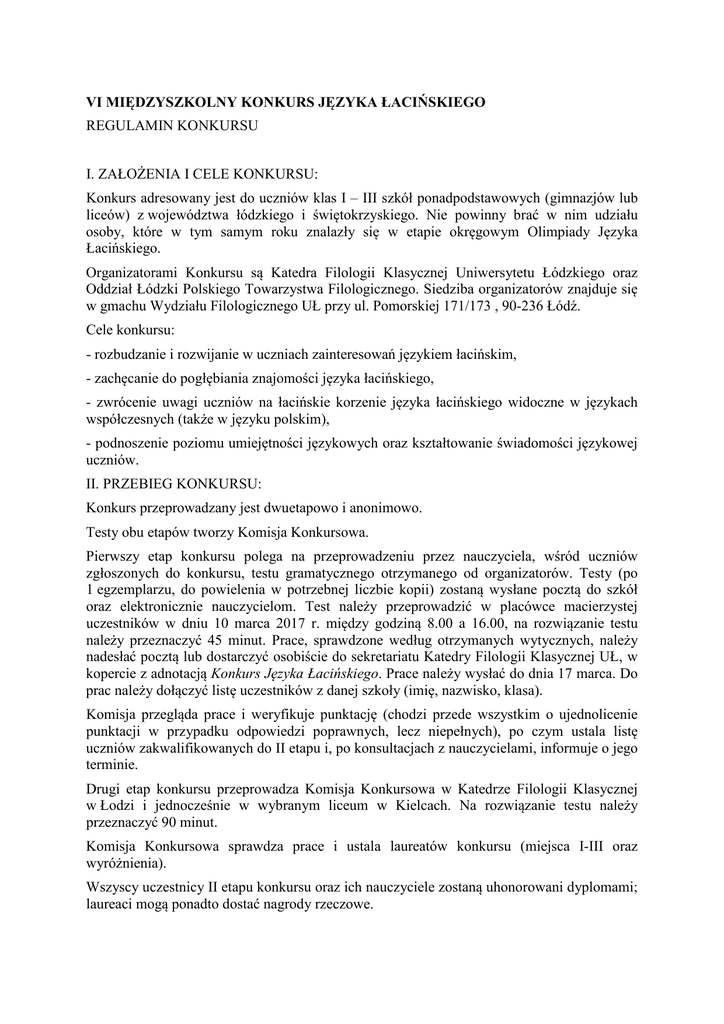 VI MIĘDZYSZKOLNY KONKURS JĘZYKA ŁACIŃSKIEGO REGULAMIN KONKURSU I. ZAŁOŻENIA I CELE KONKURSU: Konkurs adresowany jest do uczniów klas I – III szkół ponadpodstawowych (gimnazjów lub liceów) z województwa łódzkiego i świętokrzyskiego. Nie powinny brać w nim udziału osoby, które w tym samym roku znalazły się w etapie okręgowym Olimpiady Języka Łacińskiego. Organizatorami Konkursu są Katedra Filologii Klasycznej Uniwersytetu Łódzkiego oraz Oddział Łódzki Polskiego Towarzystwa Filologicznego. Siedziba organizatorów znajduje się w gmachu Wydziału Filologicznego UŁ przy ul. Pomorskiej 171/173 , 90-236 Łódź. Cele konkursu: - rozbudzanie i rozwijanie w uczniach zainteresowań językiem łacińskim, - zachęcanie do pogłębiania znajomości języka łacińskiego, - zwrócenie uwagi uczniów na łacińskie korzenie języka łacińskiego widoczne w językach współczesnych (także w języku polskim), - podnoszenie poziomu umiejętności językowych oraz kształtowanie świadomości językowej uczniów. II. PRZEBIEG KONKURSU: Konkurs przeprowadzany jest dwuetapowo i anonimowo. Testy obu etapów tworzy Komisja Konkursowa. Pierwszy etap konkursu polega na przeprowadzeniu przez nauczyciela, wśród uczniów zgłoszonych do konkursu, testu gramatycznego otrzymanego od organizatorów. Testy (po 1 egzemplarzu, do powielenia w potrzebnej liczbie kopii) zostaną wysłane pocztą do szkół oraz elektronicznie nauczycielom. Test należy przeprowadzić w placówce macierzystej uczestników w dniu 10 marca 2017 r. między godziną 8.00 a 16.00, na rozwiązanie testu należy przeznaczyć 45 minut. Prace, sprawdzone według otrzymanych wytycznych, należy nadesłać pocztą lub dostarczyć osobiście do sekretariatu Katedry Filologii Klasycznej UŁ, w kopercie z adnotacją Konkurs Języka Łacińskiego. Prace należy wysłać do dnia 17 marca. Do prac należy dołączyć listę uczestników z danej szkoły (imię, nazwisko, klasa). Komisja przegląda prace i weryfikuje punktację (chodzi przede wszystkim o ujednolicenie punktacji w przypadku odpowiedzi poprawnych, lecz niepełnych), po czym ustala listę uczniów zakwalifikowanych do II etapu i, po konsultacjach z nauczycielami, informuje o jego terminie. Drugi etap konkursu przeprowadza Komisja Konkursowa w Katedrze Filologii Klasycznej w Łodzi i jednocześnie w wybranym liceum w Kielcach. Na rozwiązanie testu należy przeznaczyć 90 minut. Komisja Konkursowa sprawdza prace i ustala laureatów konkursu (miejsca I-III oraz wyróżnienia). Wszyscy uczestnicy II etapu konkursu oraz ich nauczyciele zostaną uhonorowani dyplomami; laureaci mogą ponadto dostać nagrody rzeczowe. III. ZAKRES MATERIAŁU: I etap fleksja: • rzeczowniki i przymiotniki deklinacji I i II, • zaimki osobowe i dzierżawcze • czasowniki koniugacji I – IV (bez deponentiów) oraz esse, w następujących formach: > indicativus et infinitivus praesentis activi et passivi > imperativus praesentis activi > indicativus imperfecti activi et passivi, > indicativus futuri I activi et passivi II etap fleksja: j.w. składnia: • orzeczenie imienne, • dativus possessivus, • nominativus duplex, • accusativus duplex, • accusativus cum infinitivo, • nominativus cum infinitivo, • zamiana strony czynnej na bierną i na odwrót. Podczas obu etapów konkursu uczestnicy powinni posługiwać się małym Słownikiem łacińsko-polskim PWN pod red. Kazimierza Kumanieckiego lub Józefa Korpantego. Zainteresowanych prosimy o zgłoszenia elektroniczne na adres: [email protected]