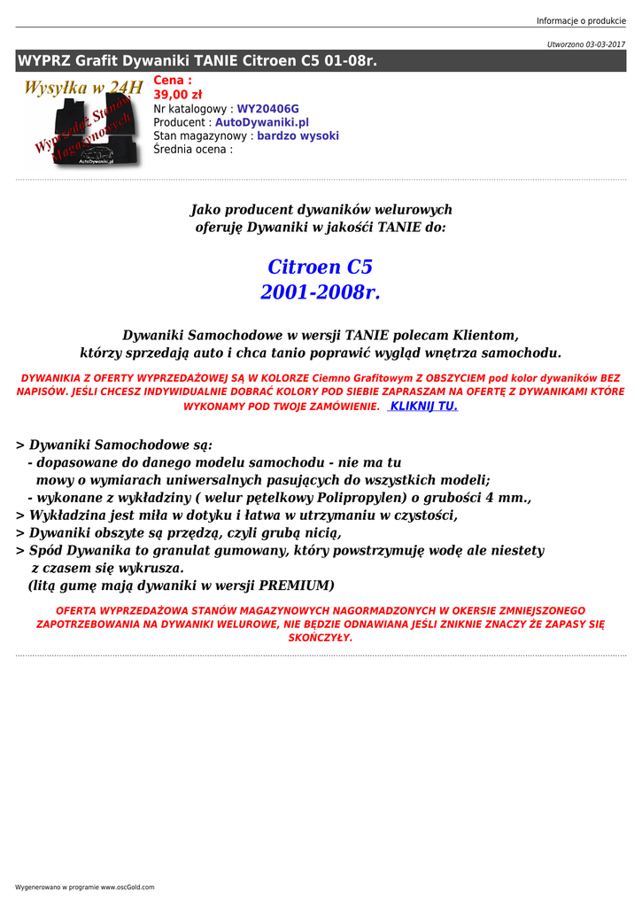 Informacje o produkcie Utworzono 03-03-2017 WYPRZ Grafit Dywaniki TANIE Citroen C5 01-08r. Cena : 39,00 zł Nr katalogowy : WY20406G Producent : AutoDywaniki.pl Stan magazynowy : bardzo wysoki Średnia ocena : Jako producent dywaników welurowych oferuję Dywaniki w jakośći TANIE do: Citroen C5 2001-2008r. Dywaniki Samochodowe w wersji TANIE polecam Klientom, którzy sprzedają auto i chca tanio poprawić wygląd wnętrza samochodu. DYWANIKIA Z OFERTY WYPRZEDAŻOWEJ SĄ W KOLORZE Ciemno Grafitowym Z OBSZYCIEM pod kolor dywaników BEZ NAPISÓW. JEŚLI CHCESZ INDYWIDUALNIE DOBRAĆ KOLORY POD SIEBIE ZAPRASZAM NA OFERTĘ Z DYWANIKAMI KTÓRE WYKONAMY POD TWOJE ZAMÓWIENIE. KLIKNIJ TU. > Dywaniki Samochodowe są: - dopasowane do danego modelu samochodu - nie ma tu mowy o wymiarach uniwersalnych pasujących do wszystkich modeli; - wykonane z wykładziny ( welur pętelkowy Polipropylen) o grubości 4 mm., > Wykładzina jest miła w dotyku i łatwa w utrzymaniu w czystości, > Dywaniki obszyte są przędzą, czyli grubą nicią, > Spód Dywanika to granulat gumowany, który powstrzymuję wodę ale niestety z czasem się wykrusza. (litą gumę mają dywaniki w wersji PREMIUM) OFERTA WYPRZEDAŻOWA STANÓW MAGAZYNOWYCH NAGORMADZONYCH W OKERSIE ZMNIEJSZONEGO ZAPOTRZEBOWANIA NA DYWANIKI WELUROWE, NIE BĘDZIE ODNAWIANA JEŚLI ZNIKNIE ZNACZY ŻE ZAPASY SIĘ SKOŃCZYŁY. Wygenerowano w programie www.oscGold.com