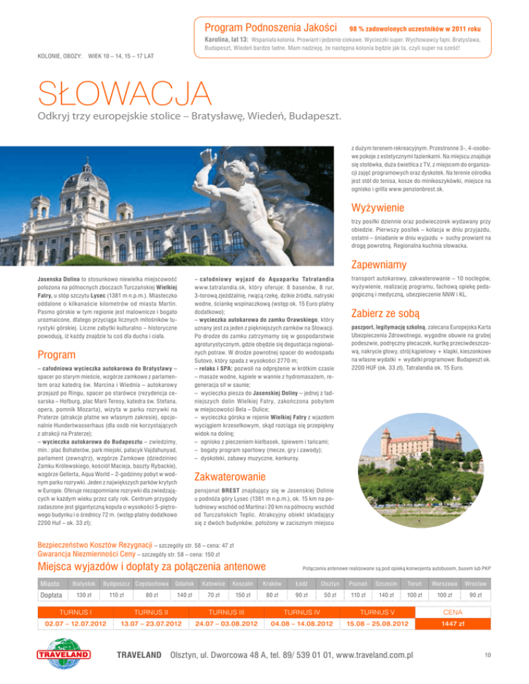 Program Podnoszenia Jakości 98 % zadowolonych uczestników w 2011 roku Karolina, lat 13: Wspaniała kolonia. Prowiant i jedzenie ciekawe. Wycieczki super. Wychowawcy fajni. Bratysława, Budapeszt, Wiedeń bardzo ładne. Mam nadzieję, że następna kolonia będzie jak ta, czyli super na sześć! KOLONIE, OBOZY: WIEK 10 – 14, 15 – 17 LAT SŁOWACJA Odkryj trzy europejskie stolice – Bratysławę, Wiedeń, Budapeszt. z dużym terenem rekreacyjnym. Przestronne 3-, 4-osobowe pokoje z estetycznymi łazienkami. Na miejscu znajduje się stołówka, duża świetlica z TV, z miejscem do organizacji zajęć programowych oraz dyskotek. Na terenie ośrodka jest stół do tenisa, kosze do minikoszykówki, miejsce na ognisko i grilla www.penzionbrest.sk. Wyżywienie trzy posiłki dziennie oraz podwieczorek wydawany przy obiedzie. Pierwszy posiłek – kolacja w dniu przyjazdu, ostatni – śniadanie w dniu wyjazdu + suchy prowiant na drogę powrotną. Regionalna kuchnia słowacka. Zapewniamy Jasenska Dolina to stosunkowo niewielka miejscowość położona na północnych zboczach Turczańskiej Wielkiej Fatry, u stóp szczytu Lysec (1381 m n.p.m.). Miasteczko oddalone o kilkanaście kilometrów od miasta Martin. Pasmo górskie w tym regionie jest malownicze i bogato urozmaicone, dlatego przyciąga licznych miłośników turystyki górskiej. Liczne zabytki kulturalno – historyczne powodują, iż każdy znajdzie tu coś dla ducha i ciała. – całodniowy wyjazd do Aquaparku Tatralandia www.tatralandia.sk, który oferuje: 8 basenów, 8 rur, 3-torową zjeżdżalnię, rwącą rzekę, dzikie źródła, natryski wodne, ściankę wspinaczkową (wstęp ok. 15 Euro płatny dodatkowo); – wycieczka autokarowa do zamku Orawskiego, który uznany jest za jeden z piękniejszych zamków na Słowacji. Po drodze do zamku zatrzymamy się w gospodarstwie agroturystycznym, gdzie obędzie się degustacja regionalnych potraw. W drodze powrotnej spacer do wodospadu Sutovo, który spada z wysokości 2770 m; – relaks i SPA: pozwoli na odprężenie w krótkim czasie – masaże wodne, kąpiele w wannie z hydromasażem, regeneracja sił w saunie; – wycieczka piesza do Jasenskiej Doliny – jednej z ładniejszych dolin Wielkiej Fatry, zakończona pobytem w miejscowości Bela – Dulice; – wycieczka górska w rejonie Wielkiej Fatry z wjazdem wyciągiem krzesełkowym, skąd rozciąga się przepiękny widok na dolinę; – ognisko z pieczeniem kiełbasek, śpiewem i tańcami; – bogaty program sportowy (mecze, gry i zawody); – dyskoteki, zabawy muzyczne, konkursy. Program – całodniowa wycieczka autokarowa do Bratysławy – spacer po starym mieście, wzgórze zamkowe z parlamentem oraz katedrą św. Marcina i Wiednia – autokarowy przejazd po Ringu, spacer po starówce (rezydencja cesarska – Hofburg, plac Marii Teresy, katedra św. Stefana, opera, pomnik Mozarta), wizyta w parku rozrywki na Praterze (atrakcje płatne we własnym zakresie), opcjonalnie Hundertwasserhaus (dla osób nie korzystających z atrakcji na Praterze); – wycieczka autokarowa do Budapesztu – zwiedzimy, min.: plac Bohaterów, park miejski, pałacyk Vajdahunyad, parlament (zewnątrz), wzgórze Zamkowe (dziedziniec Zamku Królewskiego, kościół Macieja, baszty Rybackie), wzgórze Gellerta, Aqua World – 2-godzinny pobyt w wodnym parku rozrywki. Jeden z największych parków krytych w Europie. Oferuje niezapomniane rozrywki dla zwiedzających w każdym wieku przez cały rok. Centrum przygody zadaszone jest gigantyczną kopuła o wysokości 5-piętrowego budynku i o średnicy 72 m. (wstęp płatny dodatkowo 2200 Huf – ok. 33 zł); transport autokarowy, zakwaterowanie – 10 noclegów, wyżywienie, realizację programu, fachową opiekę pedagogiczną i medyczną, ubezpieczenie NNW i KL. Zabierz ze sobą paszport, legitymację szkolną, zalecana Europejska Karta Ubezpieczenia Zdrowotnego, wygodne obuwie na grubej podeszwie, podręczny plecaczek, kurtkę przeciwdeszczową, nakrycie głowy, strój kąpielowy + klapki, kieszonkowe na własne wydatki + wydatki programowe: Budapeszt ok. 2200 HUF (ok. 33 zł), Tatralandia ok. 15 Euro. Zakwaterowanie pensjonat BREST znajdujący się w Jasenskiej Dolinie u podnóża góry Lysec (1381 m n.p.m.), ok. 15 km na południowy wschód od Martina i 20 km na północny wschód od Turczańskich Teplic. Atrakcyjny obiekt składający się z dwóch budynków, położony w zacisznym miejscu Bezpieczeństwo Kosztów Rezygnacji – szczegóły str. 58 – cena: 47 zł Gwarancja Niezmienności Ceny – szczegóły str. 58 – cena: 150 zł Miejsca wyjazdów i dopłaty za połączenia antenowe Miasto Białystok Dopłata 130 zł Bydgoszcz Częstochowa 110 zł 80 zł Połączenia antenowe realizowane są pod opieką konwojenta autobusem, busem lub PKP Gdańsk Katowice Koszalin Kraków Łódź Olsztyn Poznań Szczecin Toruń Warszawa Wrocław 140 zł 70 zł 150 zł 80 zł 90 zł 50 zł 110 zł 140 zł 100 zł 100 zł 90 zł TURNUS I TURNUS II TURNUS III TURNUS IV TURNUS V CENA 02.07 – 12.07.2012 13.07 – 23.07.2012 24.07 – 03.08.2012 04.08 – 14.08.2012 15.08 – 25.08.2012 1447 zł TRAVELAND Olsztyn, ul. Dworcowa 48 A, tel. 89/ 539 01 01, www.traveland.com.pl 10