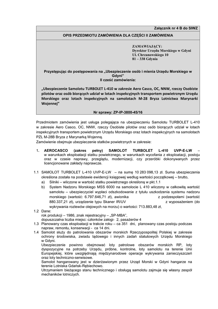 Załącznik nr 4 B do SIWZ OPIS PRZEDMIOTU ZAMÓWIENIA DLA CZĘŚCI II ZAMÓWIENIA ZAMAWIAJĄCY: Dyrektor Urzędu Morskiego w Gdyni Ul. Chrzanowskiego 10 81 – 338 Gdynia Przystępując do postępowania na „Ubezpieczenie osób i mienia Urzędu Morskiego w Gdyni” II cześć zamówienia: „Ubezpieczenie Samolotu TURBOLET L-410 w zakresie Aero Casco, OC, NNW, rzeczy Osobiste pilotów oraz osób biorących udział w lotach inspekcyjnych transportem powietrznym Urzędu Morskiego oraz lotach inspekcyjnych na samolotach M-28 Bryza Lotnictwa Marynarki Wojennej” Nr sprawy: ZP-IP-3800-45/16 Przedmiotem zamówienia jest usługa polegająca na ubezpieczeniu Samolotu TURBOLET L-410 w zakresie Aero Casco, OC, NNW, rzeczy Osobiste pilotów oraz osób biorących udział w lotach inspekcyjnych transportem powietrznym Urzędu Morskiego oraz lotach inspekcyjnych na samolotach PZL M-28B Bryza z Marynarką Wojenną. Zamówienie obejmuje ubezpieczenie statków powietrznych w zakresie: 1. AEROCASCO (zakres pełny) SAMOLOT TURBOLET L-410 UVP-E-LW – w warunkach eksploatacji statku powietrznego, w warunkach wycofania z eksploatacji, postoju oraz w czasie naprawy, przeglądu, modernizacji, czy przeróbki dokonywanych przez licencjonowane zakłady naprawcze. 1.1 SAMOLOT TURBOLET L-410 UVP-E-LW – na sumę 10 283 098,13 zł. Suma ubezpieczenia określona została na podstawie ewidencji księgowej według wartości początkowej – brutto, a) Silniki – wliczone w wartość statku powietrznego określoną w pkt.1.1 b) System Nadzoru Morskiego MSS 6000 na samolocie L 410 wliczony w całkowitą wartość samolotu – ubezpieczyciel wypłaci odszkodowanie z tytułu uszkodzenia systemu nadzoru morskiego (wartość: 6.797.646,71 zł), awionika z podzespołami (wartość 880.337,21 zł), urządzenie typu Skaner IR/UV z wyposażeniem (do wykrywania rozlewów olejowych na morzu) o wartości: 713.883,48 zł, 1.2 Dane: rok produkcji – 1986, znak rejestracyjny – „SP-MBA”, dopuszczalna liczba miejsc: członków załogi- 2, pasażerów 4 1.3 Planowany czas eksploatacji w trakcie roku – ca 351 dni, planowany czas postoju podczas napraw, remontu, konserwacji - ca 14 dni. 1.4 Samolot służy do patrolowania obszarów morskich Rzeczypospolitej Polskiej w zakresie ochrony środowiska, zwiadu lądowego i innych zadań statutowych Urzędu Morskiego w Gdyni. Ubezpieczenie powinno obejmować loty patrolowe obszarów morskich RP, loty dyspozycyjne na potrzeby Urzędu, próbne, kontrolne, loty samolotu na terenie Unii Europejskiej, które uwzględniają międzynarodowe operacje wykrywania zanieczyszczeń oraz loty techniczno-serwisowe. Samolot hangarowany jest w dzierżawionym przez Urząd Morski w Gdyni hangarze na terenie Lotniska Gdańsk-Rębiechowo. Utrzymaniem bieżącego stanu technicznego i obsługą samolotu zajmuje się własny zespół mechaników lotniczych. Samolot służy do działalności statutowej Urzędu Morskiego w Gdyni, który nie prowadzi działalności przewozowej, a wszyscy ludzie odbywający loty to członkowie załogi. 1.5 Wykonawca potwierdzi na polisie ubezpieczeniowej, że obejmuje ona swoim zakresem okres eksploatacji oraz okres podczas wycofania z eksploatacji oraz postoju, w tym kradzież z miejsca postoju, a także podczas prowadzonych remontów, w czasie naprawy, przeglądu, modernizacji, czy przeróbki dokonywanej przez licencjonowane zakłady naprawcze. 1.6 W ubezpieczeniu nie mają zastosowania udziały własne, oprócz określonych w pkt.1.7 1.7 Franszyza redukcyjna podstawowa w ubezpieczeniu aerocasco dla samolotu: 1.7.1 Dla szkód w każdej szkodzie 15% wartości szkody, nie mniej niż 5.000 USD 1.8 Piloci odbywają okresowe kontrole wiadomości teoretycznych i praktycznych oraz coroczną kontrolę techniki pilotażu. Wszyscy odbyli kurs współpracy w załodze wieloosobowej. Piloci nie uczestniczyli w żadnych wypadkach lotniczych w okresie ostatnich 36 m-cy. INFORMACJE DOTYCZĄCE PILOTÓW Imię i nazwisko Wie k Nalot ogólny Nalot na samolotach wielosilniko wych Pilot nr 1 Pilot nr 2 Pilot nr 3 Pilot nr 4 70 72 70 52 7 853 11 155 10 315 3 720 3 140 5 035 9 115 260 Nalot na Nalot Nalot na samolotac na typie h odrzutowcac turbosmigł h owych 2885 4805 5070 665 60 - 2955 4890 4705 150 Nalot w ciągu ostatnich 12 miesięcy 70 85 45 180 1.9.1. Miejsce postoju statku powietrznego (lokalizacja, w hangarze, czy na otwartej przestrzeni itd.) - Lotnisko Gdańsk-Rębiechowo, ul. Szybowcowa 31B, Gdańsk. 1.9.2 Miejsce bazowania statku powietrznego - Lotnisko Gdańsk-Rębiechowo, ul. Szybowcowa 31B, Gdańsk 1.9.3 Konserwacja i przeglądy: miejsce, nazwa zakładu zajmującego się konserwacją płatowca i silników - Aeroservis s.r.o. Brono, Turany 62000 1.9.4 Zamawiający nie zrzekł się prawa regresu w stosunku do podmiotów świadczących usługi hangarowania, konserwacji itp. 1.10. Szkody: Okres od 2007 do 10-11-2016r. - W lutym 2012 roku miał miejsce incydent lotniczy z udziałem samolotu Turbolet L410 (Pilot nr 3) polegający na rozdarciu zbiornika paliwowego znajdującego się na końcu skrzydła. Nastąpiło to w wyniku zahaczenia o daszek stacji paliw podczas kołowania samolotu po odbytym locie. W wyniku incydentu konieczna była wymiana zbiornika. Wartość szkody 68 664,25 zł, wypłacono 52 741,25 zł. 2. UBEZPIECZENIE ODPOWIEDZIALNOŚCI CYWILNEJ: a. SAMOLOT TURBOLET L-410 UVP-E-LW - OC ubezpieczającego wobec osób trzecich innych niż pasażerowie (OC użytkownika) – na sumę 7 000 000 SDR przy maksymalnej masie startowej samolotu 5700 kg, zgodnie z rozporządzeniem (WE) NR 785/2004 Parlamentu Europejskiego i Rady z dnia 21 kwietnia 2004 r. z późn. zm. w sprawie wymogów w zakresie ubezpieczenia w odniesieniu do przewoźników lotniczych i operatorów statków powietrznych. b. Zakres ubezpieczenia odpowiedzialności cywilnej powinien również obejmować szkody w środowisku związane z eksploatacją statku powietrznego, pod warunkiem jednak, że wyrządzenie szkody w śr