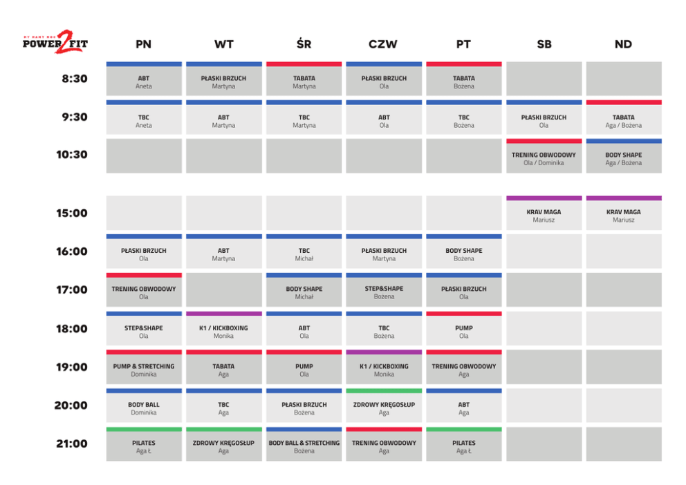 8:30 9:30 PN WT ŚR CZW PT ABT Aneta PŁASKI BRZUCH Martyna TABATA Martyna PŁASKI BRZUCH Ola TABATA Bożena TBC Aneta ABT Martyna TBC Martyna ABT Ola TBC Bożena 10:30 15:00 16:00 17:00 18:00 19:00 20:00 21:00 PŁASKI BRZUCH Ola ABT Martyna TRENING OBWODOWY Ola TBC Michał PŁASKI BRZUCH Martyna BODY SHAPE Bożena BODY SHAPE Michał STEP&SHAPE Bożena PŁASKI BRZUCH Ola STEP&SHAPE Ola K1 / KICKBOXING Monika ABT Ola TBC Bożena PUMP Ola PUMP & STRETCHING Dominika TABATA Aga PUMP Ola K1 / KICKBOXING Monika TRENING OBWODOWY Aga BODY BALL Dominika TBC Aga PŁASKI BRZUCH Bożena ZDROWY KRĘGOSŁUP Aga ABT Aga PILATES Aga Ł ZDROWY KRĘGOSŁUP Aga BODY BALL & STRETCHING Bożena TRENING OBWODOWY Aga PILATES Aga Ł SB ND PŁASKI BRZUCH Ola TABATA Aga / Bożena TRENING OBWODOWY Ola / Dominika BODY SHAPE Aga / Bożena KRAV MAGA Mariusz KRAV MAGA Mariusz