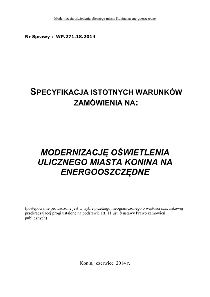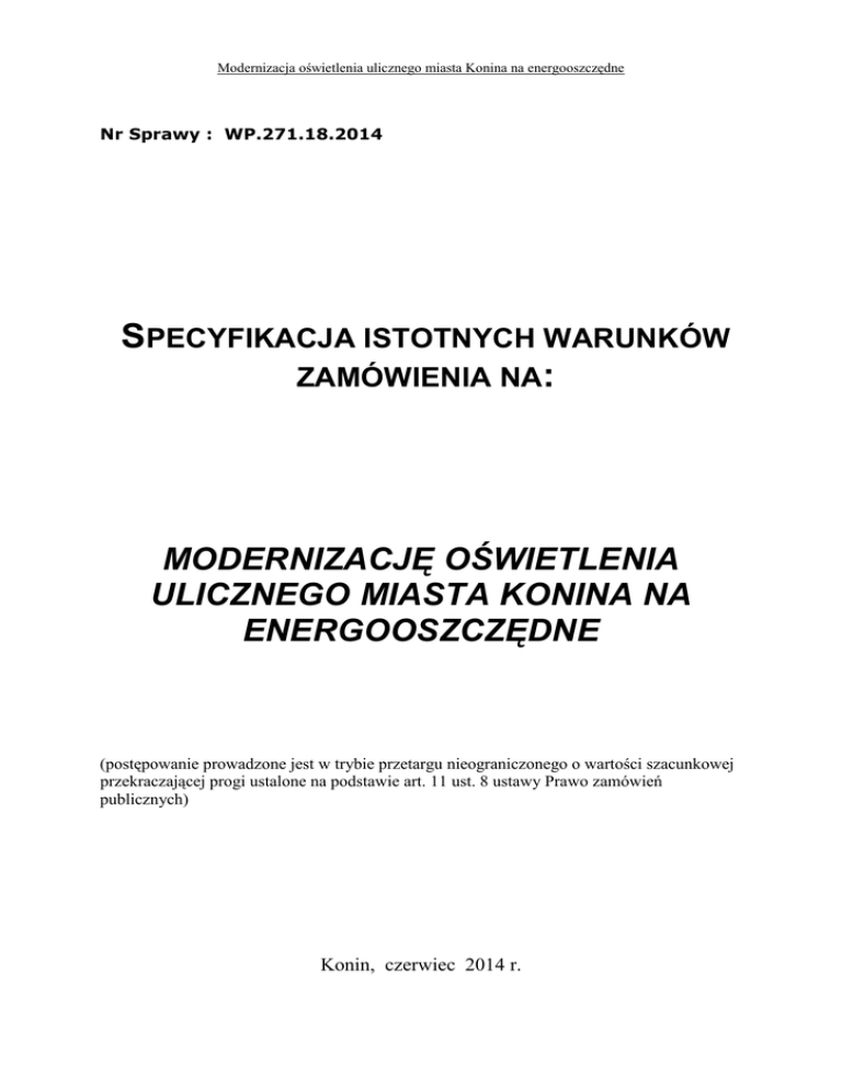 Modernizacja oświetlenia ulicznego miasta Konina na energooszczędne Nr Sprawy : WP.271.18.2014 SPECYFIKACJA ISTOTNYCH WARUNKÓW ZAMÓWIENIA NA: MODERNIZACJĘ OŚWIETLENIA ULICZNEGO MIASTA KONINA NA ENERGOOSZCZĘDNE (postępowanie prowadzone jest w trybie przetargu nieograniczonego o wartości szacunkowej przekraczającej progi ustalone na podstawie art. 11 ust. 8 ustawy Prawo zamówień publicznych) Konin, czerwiec 2014 r. Modernizacja oświetlenia ulicznego miasta Konina na energooszczędne Część I Informacje ogólne 1.1.Informacje o Zamawiającym Zamawiający: Urząd Miejski w Koninie Plac Wolności 1 tel./0-63/ 240-11-11 fax./0-63/ 240-11-35 www.konin.pl 1.2.Tryb udzielenia zamówienia : przetarg nieograniczony zgodnie z ustawą z dnia 29.I.2004 r. Prawo zamówień publicznych (Dz. U. z 2013 roku, poz. 907 ze zm.) zwana dalej ustawą. 1.3. Miejsce i termin ogłoszenia o zamówieniu: ogłoszenie o zamówieniu opublikowane zostało w Dzienniku Urzędowym Unii Europejskiej oraz zamieszczone na stronie internetowej zamawiającego www.konin.pl i w siedzibie zamawiającego w miejscu publicznie dostępnym. 1.4. Specyfikacja Istotnych Warunków Zamówienia zamieszczona została na stronie internetowej zamawiającego – www.konin.pl 2.Określenie przedmiotu zamówienia: Modernizacja oświetlenia ulicznego miasta Konina na energooszczędne. 2.1.Przedmiot zamówienia jest opisany następującymi kodami Wspólnego Słownika Zamówień (CPV): 31.52.00.00-7, 31.50.00.00-1, 45.31.61.00-6. 3.Materiały przetargowe zawierają poniŜej wymienione dokumenty: 3.1.Specyfikację Istotnych Warunków Zamówienia . 3.2.Formularz oferty wraz z załącznikami. 3.3.Projekt umowy. 4.Formularz oferty wraz ze stanowiącymi jego integralną część załącznikami oraz zestawienie kosztów, formularz cenowy i kosztorys ofertowy zostaną wypełnione przez wykonawcę ściśle wg postanowień niniejszej SIWZ, bez dokonywania w nich zmian przez wykonawcę. 2 Podpis......................................... Modernizacja oświetlenia ulicznego miasta Konina na energooszczędne Część II Warunki udziału w postępowaniu oraz opis sposobu dokonywania oceny spełnienia tych warunków 5. O zamówienie mogą ubiegać się Wykonawcy, którzy spełniają warunki zawarte w art. 22 ust. 1 ustawy: 5.1. Posiadają uprawnienia do wykonywania określonej działalności lub czynności, jeŜeli przepisy prawa nakładają obowiązek ich posiadania. • Zamawiający nie opisuje sposobu dokonywania oceny spełniania warunku udziału w postępowaniu. 5.2. Posiadają wiedzę i doświadczenie. • Warunek ten zostanie spełniony, jeśli wykonawca wykaŜe, Ŝe w okresie ostatnich 3 lat przed upływem terminu składania ofert, a jeŜeli okres prowadzenia działalności jest krótszy w tym okresie wykonali, a w przypadku świadczeń okresowych lub ciągłych wykonują co najmniej trzy dostawy wraz z montaŜem opraw ulicznych, o wartości łącznej nie mniejszej niŜ 600 000,00 zł /brutto/, z czego jedna co najmniej 250 000,00 zł /brutto/. Wykonawcy wspólnie ubiegający się o udzielenie zamówienia muszą łącznie spełniać w/w warunek. 5.3. Dysponują osobami zdolnymi do wykonania zamówienia. • Warunek ten zostanie spełniony, jeśli wykonawca będzie dysponował co najmniej następującymi osobami zdolnymi do wykonania przedmiotu zamówienia tj.: a) min. 2 osobami mającymi waŜne świadectwo kwalifikacyjne typu D w specjalności elektrycznej – uprawnienia SEP, b) min. 6 osobami mającymi waŜne świadectwo kwalifikacyjne typu E w specjalności elektrycznej – uprawnienia SEP, c) min. 2 osobami z ukończonym szkoleniem w zakresie dawania poleceń i sygnałów uczestnikom ruchu drogowego – zgodnie z wymogami art. 6 ust. 3a Ustawy z dnia 20 czerwca 1997 r. Prawo o ruchu drogowym (t.j. Dz.U. z 2012 r., poz. 1137), Wykonawcy wspólnie ubiegający się o udzielenie zamówienia muszą łącznie spełniać w/w warunek. 5.4. Dysponują odpowiednim potencjałem technicznym • Warunek ten zostanie spełniony, jeśli wykonawca będzie dysponował następującym potencjałem technicznym tj.: − min. 1 samochodem z podnośnikiem koszowym umoŜliwiającym wykonanie zadania, Wykonawcy wspólnie ubiegający się o udzielenie zamówienia muszą łącznie spełniać w/w warunek. 3 Podpis......................................... Modernizacja oświetlenia ulicznego miasta Konina na energooszczędne 5.5. Spełniają warunek dot. sytuacji ekonomicznej i finansowej. • Warunek ten zostanie spełniony jeŜeli wykonawca wykaŜe, Ŝe dysponuje środkami finansowymi lub zdolnością kredytową w wysokości nie mniejszej niŜ 3 000 000,00 zł. Wykonawcy wspólnie ubiegający się o udzielenie zamówienia muszą łącznie spełniać w/w warunek. 6. Wykonawca moŜe polegać na wiedzy i doświadczeniu, potencjale technicznym, osobach zdolnych do wykonania zamówienia lub zdolnościach finansowych innych podmiotów, niezaleŜnie od charakteru prawnego łączących go z nimi stosunków. Wykonawca w takiej sytuacji zobowiązany jest udowodnić zamawiającemu, iŜ będzie dysponował zasobami niezbędnymi do realizacji zamówienia, w szczególności przedstawiając w tym celu pisemne zobowiązanie tych podmiotów /oryginał zobowiązania/ do oddania mu do dyspozycji niezbędnych zasobów na okres korzystania z nich przy wykonywaniu zamówienia. 7. O udzielenie zamówienia publicznego mogą ubiegać się Wykonawcy, którzy nie podlegają wykluczeniu z postępowania o udzielenie zamówienia na podstawie art. 24 ust. 1 i ust. 2 pkt 5 ustawy. 8. Ocena spełniania w/w warunków dokonana zostanie zgodnie z formułą „spełnia – nie spełnia” w oparciu o informacje zawarte w dokumentach i oświadczeniach wyszczególnionych w pkt 9, 10 i 11 niniejszej SIWZ. Z treści załączonych dokumentów musi wynikać jednoznacznie, iŜ w/w warunki wykonawca spełnił. Część III Wykaz oświadczeń i dokumentów, jakie mają dostarczyć wykonawcy w celu potwierdzenia