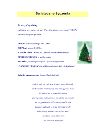 Świateczne życzenia Drodzy Czytelnicy, na Święta przyjmijcie od nas- Wszystkich tegorocznych AUTORÓW najserdeczniejsze życzenia: DOBRA doświadczanego od LUDZI CIEPŁA i pokoju DUCHA RADOŚCI i OPTYMIZMU, którym warto zarażać innych MĄDROŚCI BOŻEJ w każdym dniu MIŁOŚCI, która daje szczęście i poczucie spełnienia i NASZEGO "BYCIA" dla najbliższych, tych, których kochamy! Sielanka przydomowa ( Andrzej Poniedzielski) Ludzie, gdy poczuli strach zaraz wymyślili dach Kiedy wyszło, że nie każdy o tej samej porze może być pijany no to wymyślili ściany gdy się nagle stało jasne że na człeka, na kolację nie przypada cały wół zaraz wymyślili stół Kiedyś biegli, jak to zimą, dla rozgrzewki Jeden stanął, mówi – ileż można biec? - chodźmy, wymyślimy piec I tak ludzkość wytężając Internetowy magazyn CODN nr 6/2008 a to rozum, a to serce, a to ręce doszła żmudnie i powoli do kafelków w łazience Tak więc ludzkość jeśli nie policzyć bomb głównie wymyślała DOM Nawet koło wymyślono nie z powodu „ciężka praca” Koło wymyślono po to By do domu szybciej wracać A proch?- dziś już tak znienawidzony wymyślono przecież po to by móc zwiedzać inne domy Ale w domu choćby róże rosły w murze telewizor był w glazurze i w doniczce każdej kran Jeśli serce nie zamieszka To to będzie PUSTOSTAN Wyd. Pracownia Informacji Pedagogicznej CODN str.2 Internetowy magazyn CODN 1. dr Julian Sawiński 2. Katarzyna K. - mama Klaudii 3. Katarzyna Kuhnke 4. Agata Baj 5. Maciej Maciołek 6. Teresa Kosiarek 7. Teresa Kosiarek nr 6/2008 str. 4 Jak motywować korzystając z uczniowskich pragnień? str. 19 Partnerstwo w szkole? - list rodzica w sprawie... str. 22 Reforma oświaty a przedszkolaki... str. 24 Doświadczać to dużo więcej niż wiedzieć str. 31 Niepewny grunt edukacji str. 34 Świątecznik klasy czwartej - numer jedyny, grudzień 2008 str. 36 Mimo wszystko Magazyn wydawany przez Pracownię Informacji Pedagogicznej Centralny Ośrodek Doskonalenia Nauczycieli 00-478 Warszawa, Aleje Ujazdowskie 28 Redaktor prowadzący: Teresa Kosiarek tel. (22) 345 37 29 Zamieszczone w magazynie teksty prezentują poglądy ich autorów i nie są równoznaczne ze stanowiskiem CODN jako instytucji. Prawa autorskie zastrzeżone. Korzystanie z materiałów dozwolone do użytku własnego i pracy z uczniami; przedruki i inne formy używania materiałów są możliwe po uzgodnieniu z redakcją. Wyd. Pracownia Informacji Pedagogicznej CODN str.3 Internetowy magazyn CODN nr 6/2008 dr Julian Sawiński Jak motywować korzystając z uczniowskich pragnień? Uczniowie często marzą o wielkich sukcesach artystycznych, sportowych lub ciekawych podróżach. Niektórzy marzą o samych piątkach i celujących ocenach na świadectwie. Inspiruje ich do tego rozmawianie o ich marzeniach, pragnieniach, aspiracjach i dążeniach oraz uczenie się ciekawych treści. Dlaczego edukacja szkolna kojarzy się im przede wszystkim z „wkuwaniem”, czyli czytaniem, zapamiętywaniem i rozumieniem oraz powtarzaniem określonego zasobu treści, które trzeba odtworzyć na sprawdzianie - a potem często szybko zapomnieć? Wielu nauczycieli, powołując się na wymagania egzaminacyjne, wymaga przyswojenia przez uczniów sporej wiedzy. Sprawdza ją przez odpytywanie i pisemne kartkówki, ocenia, wierząc, że jeżeli uczeń coś wie i rozumie, to i umie. A gdzie jest w tym logika i sam uczeń - człowiek, podmiot edukacji i jego indywidualny rozwój i styl uczenia się? Czy naprawdę posiadanie dużego zasobu wiedzy przedmiotowej, np. biologicznej czy geograficznej, pomaga rozwojowi człowieka? Jaka jest faktyczna zależność między uczeniem się a indywidualnym rozwojem człowieka? Przecież uczenie się nie jest czymś, co się podejmuje tylko dla szkolnej oceny lub zadowolenia rodziców, czy też robi się za karę. Uczenie się jest przede wszystkim nabywaniem osobistych doświadczeń. Powinno być dla uczniów przyjemnością i wywoływać u nich radość z posiadania wiedzy, umiejętności, kompetencji itp. Celem tego artykułu nie jest wyczerpujące przedstawienie tematu wpływu uczniowskich pragnień i dążeń na motywację do uczenia się, ale sygnalizowanie problemu i uczulenie osób organizujących uczenie się i doskonalenie, na to, jak Wyd. Pracownia Informacji Pedagogicznej CODN str.4 Internetowy magazyn CODN nr 6/2008 wielkie znaczenie w motywowaniu do uczenia się ma umiejętne wykorzystanie uczniowskich pragnień, marzeń oraz dążeń. Zainteresuje on tych, którzy pragną lepiej motywować uczniów do uczenia się i pracy nad sobą oraz tych, którym leży na sercu indywidualny rozwój uczniów, skuteczne motywowanie do uczenia się i pracy nad sobą. Może pomoże zmienić system szkolnego motywowania uczniów do uczenia się i pracy nad sobą (doskonalenia się). Chodzi przecież o wspieranie działań inspirujących, doradczych i innowacyjnych nauczycieli, bo żeby innym doradzać, pomagać i podpowiadać, trzeba samemu to znać i ćwiczyć, a przede wszystkim trzeba być kimś. Trzeba też nauczyć się śmiało sięgać do naturalnych, wewnętrznych zasobów uczniów. Ryc. 1: Trzy podstawowe składniki ludzkich bogactw naturalnych (wg Taraszkiewicz 2006) 1. Nauczycielskie marzenia i pragnienia Warto się zastanowić i przemyśleć - O czym tak naprawdę marzę jako nauczyciel biologii i o czym marzą polscy nauczyciele? - Jak nauczyć młodzież dostrzegania, ujawniania i rozszerzania swoich marzeń oraz pragnień? Na początku zawodowej kariery jako nauczyciel biologii i geografii w małej wiejskiej szkole podstawowej, w woj. poznańskim, marzyłem m.in. o tym, aby mieć dostęp do ciekawych filmów przyrodniczych, które „leciały” w telewizji i nagrywać je oraz odtwarzać na lekcjach. Po latach pragnienie to się spełniło. Wyd. Pracownia Informacji Pedagogicznej CODN str.5 Internetowy magazyn CODN nr 6/2008 Nagrywałem filmy z telewizji i wyświetlałem 