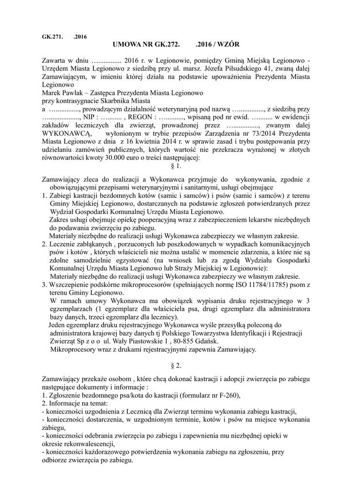 GK.271. .2016 UMOWA NR GK.272. .2016 / WZÓR Zawarta w dniu …............. 2016 r. w Legionowie, pomiędzy Gminą Miejską Legionowo Urzędem Miasta Legionowo z siedzibą przy ul. marsz. Józefa Piłsudskiego 41, zwaną dalej Zamawiającym, w imieniu której działa na podstawie upoważnienia Prezydenta Miasta Legionowo Marek Pawlak – Zastępca Prezydenta Miasta Legionowo przy kontrasygnacie Skarbnika Miasta a …............., prowadzącym działalność weterynaryjną pod nazwą ….............., z siedzibą przy …................., NIP : …........ , REGON : ….........., wpisaną pod nr ewid. …........ w ewidencji zakładów leczniczych dla zwierząt, prowadzonej przez ….............., zwanym dalej WYKONAWCĄ, wyłonionym w trybie przepisów Zarządzenia nr 73/2014 Prezydenta Miasta Legionowo z dnia z 16 kwietnia 2014 r. w sprawie zasad i trybu postępowania przy udzielaniu zamówień publicznych, których wartość nie przekracza wyrażonej w złotych równowartości kwoty 30.000 euro o treści następującej: § 1. Zamawiający zleca do realizacji a Wykonawca przyjmuje do wykonywania, zgodnie z obowiązującymi przepisami weterynaryjnymi i sanitarnymi, usługi obejmujące 1. Zabiegi kastracji bezdomnych kotów (samic i samców) i psów (samic i samców) z terenu Gminy Miejskiej Legionowo, dostarczanych na podstawie zgłoszeń potwierdzanych przez Wydział Gospodarki Komunalnej Urzędu Miasta Legionowo. Zakres usługi obejmuje opiekę pooperacyjną wraz z zabezpieczeniem lekarstw niezbędnych do podawania zwierzęciu po zabiegu. Materiały niezbędne do realizacji usługi Wykonawca zabezpieczy we własnym zakresie. 2. Leczenie zabłąkanych , porzuconych lub poszkodowanych w wypadkach komunikacyjnych psów i kotów , których właścicieli nie można ustalić w momencie zdarzenia, a które nie są zdolne samodzielnie egzystować (na wniosek lub za zgodą Wydziału Gospodarki Komunalnej Urzędu Miasta Legionowo lub Straży Miejskiej w Legionowie): Materiały niezbędne do realizacji usługi Wykonawca zabezpieczy we własnym zakresie. 3. Wszczepienie podskórne mikroprocesorów (spełniających normę ISO 11784/11785) psom z terenu Gminy Legionowo. W ramach umowy Wykonawca ma obowiązek wypisania druku rejestracyjnego w 3 egzemplarzach (1 egzemplarz dla właściciela psa, drugi egzemplarz dla administratora bazy danych, trzeci egzemplarz dla lecznicy). Jeden egzemplarz druku rejestracyjnego Wykonawca wyśle przesyłką poleconą do administratora krajowej bazy danych tj Polskiego Towarzystwa Identyfikacji i Rejestracji Zwierząt Sp z o o ul. Wały Piastowskie 1 , 80-855 Gdańsk. Mikroprocesory wraz z drukami rejestracyjnymi zapewnia Zamawiający. § 2. Zamawiający przekaże osobom , które chcą dokonać kastracji i adopcji zwierzęcia po zabiegu następujące dokumenty i informacje : 1. Zgłoszenie bezdomnego psa/kota do kastracji (formularz nr F-260), 2. Informacje na temat: - konieczności uzgodnienia z Lecznicą dla Zwierząt terminu wykonania zabiegu kastracji, - konieczności dostarczenia, w uzgodnionym terminie, kotów i psów na miejsce wykonania zabiegu, - konieczności odebrania zwierzęcia po zabiegu i zapewnienia mu niezbędnej opieki w okresie rekonwalescencji, - konieczności każdorazowego potwierdzenia wykonania zabiegu na zgłoszeniu, przy odbiorze zwierzęcia po zabiegu. § 3. 1.Łączną wartość brutto wynagrodzenia Wykonawcy za wykonanie całości usługi w zakresie określonym w §1 ust.1, 2 i 3 umowy, nie przekroczy kwoty ….......... zł (słownie złotych: …............ 00/100), w tym należny 8 % podatek VAT. 2. Szacunkowe wynagrodzenie, o którym mowa w ust 1, ust 2 i ust3 określone zostało na podstawie ryczałtowych cen jednostkowych, zgodnych z ofertą Wykonawcy. 3. Ryczałtowe ceny jednostkowe za poszczególne zabiegi wynoszą: Lp. Rodzaj zabiegu Cena brutto za jeden zabieg [zł] 1. Kastracja kotki wraz z kosztem lekarstw (do podawania zwierzęciu po odebraniu go z lecznicy) oraz tatuażu …........... 2. Kastracja kocura wraz z kosztem lekarstw (do podawania zwierzęciu po odebraniu go z lecznicy) oraz tatuażu …........... 3. Kastracja suki wraz z kosztem lekarstw (do podawania zwierzęciu po odebraniu go z lecznicy) oraz tatuażu …........... 4. Kastracja psa wraz z kosztem lekarstw (do podawania zwierzęciu po odebraniu go z lecznicy) oraz tatuażu …............ 5. Podstawowe szczepienia kotów ,,tricat” …........... 6. Podstawowe szczepienia psów ,,DHP” …........... 7. Profilaktyka przeciw pasożytnicza kotów …........... 8. Profilaktyka przeciw pasożytnicza psów …........... 9. Oznakowanie psów (mikroprocesor) …........... 4.Rozliczanie następować będzie w okresach miesięcznych na podstawie faktur wystawianych przez Wykonawcę, w których określona będzie ilość faktycznie wykonanych w danym miesiącu usług oraz jednostkowa cena ryczałtowa usługi. Dokumentem rozliczeniowym do faktury będą zgłoszenia potwierdzone przez Wykonawcę i osoby odbierające zwierzęta po zabiegu . 5. Zamawiający dokona zapłaty za wykonaną usługę w terminie 30 dni od dnia otrzymania prawidłowo wystawionej faktury VAT na rachunek bankowy wskazany przez Wykonawcę. § 4. Niniejsza umowa obowiązuje od dnia podpisania umowy do dnia 15.12.2017 r. § 5. Strony ustanawiają następujące formy odpowiedzialności z tytułu nienależytego wykonania umowy: 1.Zamawiający zapłaci Wykonawcy ustawowe odsetki za zwłokę w przypadku zwłoki w wypłacie wynagrodzenia. 2.Wykonawca zapłaci Zamawiającemu karę umowną w wysokości 0,1 % kwoty określonej w § 3 ust 1 za każdy dzień zwłoki w wykonaniu zabiegów weterynaryjnych objętych umową. § 6. Wszelkie zmiany postanowień niniejszej umowy mogą być dokonywane jedynie w formie pisemnej, pod rygorem nieważności. § 7. W sprawach nieuregulowanych niniejszą umową mają zastosowanie przepisy Kodeksu Cywilnego. § 8. Umowę niniejszą sporządzono w czterech jednobrz