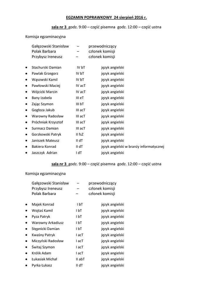 EGZAMIN POPRAWKOWY 24 sierpień 2016 r. sala nr 3 godz. 9:00 – część pisemna godz. 12:00 – część ustna Komisja egzaminacyjna Gałęzowski Stanisław Polak Barbara Przybysz Ireneusz – – – przewodniczący członek komisji członek komisji Stachurski Damian IV bT język angielski Pawlak Grzegorz IV bT język angielski Wąsowski Kamil IV bT język angielski Pawłowski Maciej IV acT język angielski Wójcicki Marcin IV acT język angielski Bany Izabela III eT język angielski Zając Szymon III bT język angielski Gogłoza Jakub III acT język angielski Warowny Radosław III acT język angielski Próchniak Krzysztof III acT język angielski Surmacz Damian III acT język angielski Gorzkowski Patryk II fsZ język angielski Janiszek Mateusz II dT język angielski Bakiera Konrad II dT język angielski w branży informatycznej Jaszczyk Adrian I dT język angielski sala nr 3 godz. 9:00 – część pisemna godz. 12:00 – część ustna Komisja egzaminacyjna Gałęzowski Stanisław Przybysz Ireneusz Polak Barbara – – – przewodniczący członek komisji członek komisji Majek Konrad I bT język angielski Wojtaś Kamil I bT język angielski Pyza Patryk I bT język angielski Warowny Arkadiusz I bT język angielski Stępnicki Damian I bT język angielski Kwaśny Patryk I acT język angielski Miczyński Radosław I acT język angielski Świtaj Szymon I acT język angielski Królik Adam I acT język angielski Łukasiak Michał II abT język angielski Pyrka Łukasz II dT język angielski sala nr 4 godz. 9:00 – część pisemna godz. 12:00 – część ustna Komisja egzaminacyjna Ochap Marek Kłosowska Ewa Mościcka-Wróbel Jadwiga – – – przewodniczący członek komisji członek komisji Dębek Mateusz IV dT matematyka Kierzkowski Mateusz IV dT matematyka Wnuk Adrian IV dT matematyka Soból Mateusz III acT matematyka Jędrych Rafał III acT matematyka Pyra Jakub III acT matematyka Kwas Marcin III acT matematyka Kot Ernest II cT matematyka Kępka Tomasz I acT matematyka sala nr 4 godz. 9:00 – część pisemna godz. 12:00 – część ustna Komisja egzaminacyjna Ochap Marek Mościcka-Wróbel Jadwiga Kłosowska Ewa – – – przewodniczący członek komisji członek komisji Urbanowicz Mariusz III bT matematyka Gordat Bartosz III bT matematyka sala nr 4 godz. 9:00 – część pisemna godz. 12:00 – część ustna Komisja egzaminacyjna Ochap Marek Bilicz Agnieszka Kłosowska Ewa – – – przewodniczący członek komisji członek komisji Kasperski Adam IV bT matematyka Lipka Michał III eT matematyka Lament Damian II abT matematyka Mikos Kacper I bT matematyka Tomaszek Paweł I bT matematyka Kozdrój Łukasz I bT matematyka Drózd Kamil I bT matematyka sala nr 5 godz. 9:00 – część pisemna godz. 12:00 – część ustna Komisja egzaminacyjna Kamiński Grzegorz Marciniak Anna Lipski Jarosław Majsterek Marcin – – – III eT przewodniczący członek komisji członek komisji historia i społeczeństwo sala nr 5 godz. 9:00 – część pisemna godz. 12:00 – część ustna Komisja egzaminacyjna Kamiński Grzegorz Jaroń Agnieszka Wesołowska Anna Gontarz Paweł – – – IV acT przewodniczący członek komisji członek komisji język polski