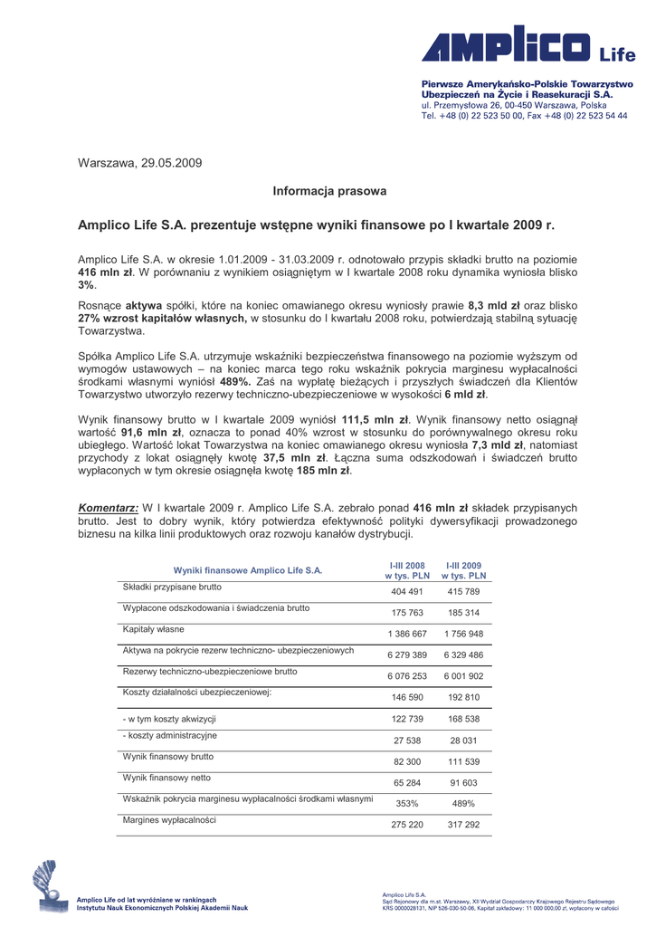 Warszawa, 29.05.2009 Informacja prasowa Amplico Life S.A. prezentuje wstępne wyniki finansowe po I kwartale 2009 r. Amplico Life S.A. w okresie 1.01.2009 - 31.03.2009 r. odnotowało przypis składki brutto na poziomie 416 mln zł. W porównaniu z wynikiem osiągniętym w I kwartale 2008 roku dynamika wyniosła blisko 3%. Rosnące aktywa spółki, które na koniec omawianego okresu wyniosły prawie 8,3 mld zł oraz blisko 27% wzrost kapitałów własnych, w stosunku do I kwartału 2008 roku, potwierdzają stabilną sytuację Towarzystwa. Spółka Amplico Life S.A. utrzymuje wskaźniki bezpieczeństwa finansowego na poziomie wyŜszym od wymogów ustawowych – na koniec marca tego roku wskaźnik pokrycia marginesu wypłacalności środkami własnymi wyniósł 489%. Zaś na wypłatę bieŜących i przyszłych świadczeń dla Klientów Towarzystwo utworzyło rezerwy techniczno-ubezpieczeniowe w wysokości 6 mld zł. Wynik finansowy brutto w I kwartale 2009 wyniósł 111,5 mln zł. Wynik finansowy netto osiągnął wartość 91,6 mln zł, oznacza to ponad 40% wzrost w stosunku do porównywalnego okresu roku ubiegłego. Wartość lokat Towarzystwa na koniec omawianego okresu wyniosła 7,3 mld zł, natomiast przychody z lokat osiągnęły kwotę 37,5 mln zł. Łączna suma odszkodowań i świadczeń brutto wypłaconych w tym okresie osiągnęła kwotę 185 mln zł. Komentarz: W I kwartale 2009 r. Amplico Life S.A. zebrało ponad 416 mln zł składek przypisanych brutto. Jest to dobry wynik, który potwierdza efektywność polityki dywersyfikacji prowadzonego biznesu na kilka linii produktowych oraz rozwoju kanałów dystrybucji. Wyniki finansowe Amplico Life S.A. Składki przypisane brutto Wypłacone odszkodowania i świadczenia brutto Kapitały własne Aktywa na pokrycie rezerw techniczno- ubezpieczeniowych Rezerwy techniczno-ubezpieczeniowe brutto Koszty działalności ubezpieczeniowej: - w tym koszty akwizycji - koszty administracyjne Wynik finansowy brutto Wynik finansowy netto Wskaźnik pokrycia marginesu wypłacalności środkami własnymi Margines wypłacalności I-III 2008 w tys. PLN I-III 2009 w tys. PLN 404 491 415 789 175 763 185 314 1 386 667 1 756 948 6 279 389 6 329 486 6 076 253 6 001 902 146 590 192 810 122 739 168 538 27 538 28 031 82 300 111 539 65 284 91 603 353% 489% 275 220 317 292 ****************** Amplico Life S.A. z licencją numer 1 powstało w 1990 roku jako pierwsze towarzystwo na rynku polskim z udziałem kapitału zagranicznego. Działalność Towarzystwa koncentruje się na ubezpieczeniach na Ŝycie, na Ŝycie z ubezpieczeniowym funduszem kapitałowym, wypadkowych, chorobowych (jako uzupełnienie ubezpieczeń na Ŝycie). Zarządza blisko 8,3 miliarda zł aktywów. Prowadzi i rozwija działalność na Litwie i Łotwie. Akcjonariuszem Amplico Life S.A. jest w 100% ALICO. American Life Insurance Company (ALICO) jest jedną z największych na świecie i najbardziej zdywersyfikowanych międzynarodowych firm ubezpieczeń na Ŝycie. ALICO powstało w 1921 roku i działa w ponad pięćdziesięciu krajach i regionach, w tym w: Japonii, Europie, na Bliskim Wschodzie, w Azji Południowej, Ameryce Południowej i na Karaibach. Oddziały i spółki zaleŜne ALICO, poprzez róŜne kanały dystrybucji, oferują szeroki wachlarz ubezpieczeń na Ŝycie i zdrowotnych, w tym: tradycyjne ubezpieczenia na Ŝycie, ubezpieczenia na Ŝycie z funduszem kapitałowym, ubezpieczenia spłaty zadłuŜenia, jak równieŜ dodatkowe ubezpieczenia wypadkowe, zdrowotne oraz na wypadek hospitalizacji, grupowe ubezpieczenia na Ŝycie, rentowe oraz emerytalne.