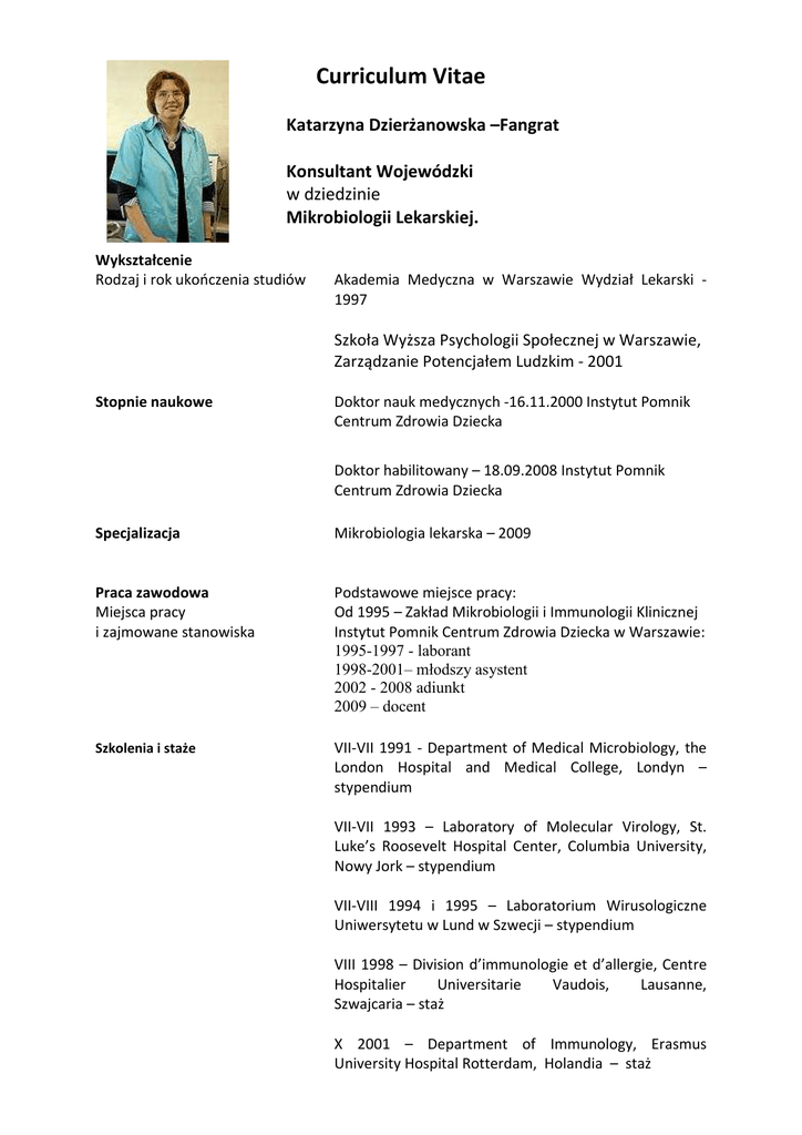Curriculum Vitae Katarzyna Dzierżanowska –Fangrat Konsultant Wojewódzki w dziedzinie Mikrobiologii Lekarskiej. Wykształcenie Rodzaj i rok ukończenia studiów Akademia Medyczna w Warszawie Wydział Lekarski 1997 Szkoła Wyższa Psychologii Społecznej w Warszawie, Zarządzanie Potencjałem Ludzkim - 2001 Stopnie naukowe Doktor nauk medycznych -16.11.2000 Instytut Pomnik Centrum Zdrowia Dziecka Doktor habilitowany – 18.09.2008 Instytut Pomnik Centrum Zdrowia Dziecka Specjalizacja Mikrobiologia lekarska – 2009 Praca zawodowa Miejsca pracy i zajmowane stanowiska Podstawowe miejsce pracy: Od 1995 – Zakład Mikrobiologii i Immunologii Klinicznej Instytut Pomnik Centrum Zdrowia Dziecka w Warszawie: 1995-1997 - laborant 1998-2001– młodszy asystent 2002 - 2008 adiunkt 2009 – docent Szkolenia i staże VII-VII 1991 - Department of Medical Microbiology, the London Hospital and Medical College, Londyn – stypendium VII-VII 1993 – Laboratory of Molecular Virology, St. Luke’s Roosevelt Hospital Center, Columbia University, Nowy Jork – stypendium VII-VIII 1994 i 1995 – Laboratorium Wirusologiczne Uniwersytetu w Lund w Szwecji – stypendium VIII 1998 – Division d’immunologie et d’allergie, Centre Hospitalier Universitarie Vaudois, Lausanne, Szwajcaria – staż X 2001 – Department of Immunology, Erasmus University Hospital Rotterdam, Holandia – staż VI 2003 – ESCMID Summer School of Clinical Microbiology, Utrecht, Holandia – kurs III 2004 – Department of Immunology, Erasmus University Hospital Rotterdam, Holandia – staż XI 2003 – Kurs “Kluczowe ogniwa jakości w diagnostyce Mikrobiologicznej” zorganizowany przez Fundację Centrum Mikrobiologii klinicznej XI 2008 – Kurs „ Zakażenia szpitalne – nadzór epidemiologiczny i mikrobiologiczny dla przewodniczących zespołów kontroli zakażeń” zorganizowany przez Polskie Towarzystwo Zakażeń Szpitalnych, Krajowego Konsultanta ds. mikrobiologii lekarskiej i Krajowego Konsultanta ds. epidemiologii. Członkostwo Polskie Towarzystwo Mikrobiologów European Society of Clinical Microbiology and Infectious Diseases Publikacje naukowe 34 prace oryginalne 20 prac poglądowych, w tym monografie i rozdziały w monografiach