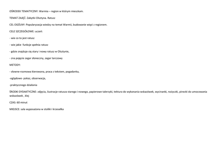 OŚRODEK TEMATYCZNY: Warmia – region w którym mieszkam. TEMAT ZAJĘĆ: Zabytki Olsztyna. Ratusz CEL OGÓLNY: Popularyzacja wiedzy na temat Warmii, budowanie więzi z regionem. CELE SZCZEGÓŁOWE: uczeń: ‐ wie co to jest ratusz ‐ wie jakie funkcje spełnia ratusz ‐ gdzie znajduje się stary i nowy ratusz w Olsztynie, ‐ zna pojęcie zegar słoneczny, zegar tarczowy METODY: ‐ słowne‐rozmowa kierowana, praca z tekstem, pogadanka, ‐oglądowe‐ pokaz, obserwacja, ‐praktycznego działania ŚRODKI DYDAKTYCZNE: zdjęcia, ilustracje ratusza starego i nowego, papierowe talerzyki, tektura do wykonania wskazówek, wycinanki, nożyczki, pinezki do umocowania wskazówek , klej CZAS: 60 minut MIEJSCE: sala wyposażona w stoliki i krzesełka PRZEBIEG ZAJĘĆ CZĘŚĆ KOŃCOWA , ok. 15 CZĘŚĆ GŁÓWNA, ok. 30 min CZĘŚĆ WSTĘPNA, ok. 15 min CZĘŚĆ ZAJĘC, CZAS CZYNNOŚCI NAUCZYCIELA UWAGI 1. Czynności wstępne: przywitanie, rozdanie materiałów, zapoznanie z tematem zajęć. Dzieci siedzą w kręgu. 1. Krótkie opowiadanie na temat ratusza, pojęcia kluczowe: Stary ratusz: ‐ budynek w części nieotynkowanej – gotycki, część otynkowana pochodzi z XIX wieku ‐ wybudowany po roku 1500 ( większość źródeł twierdzi, że w wieku XIV, przeczy temu obecność oślego łuku – charakterystycznego dla późnego gotyku), ‐ ozdobne łuki – łuki ośle ( zał.8.1) ‐ duże okna z szybkami gomółkowymi ( małe, okrągłe szybki w oprawie ołowianej – jak witraż ) ‐ zegary słoneczne, ‐ funkcje: siedziba burmistrza, sala posiedzeń rady miasta –I piętro, na parterze hala targowa ‐ w chwili obecnej – siedziba Wojewódzkiej Biblioteki Publicznej Nowy ratusz: ‐ wybudowany na początku XX wieku, ‐ siedziba Urzędu Miasta Olsztyn i Prezydenta Miasta Olsztyn, ‐ trzy skrzydła, wieża ratuszowa – 3 zegary, ‐ od strony ul. 1 maja, pomiędzy oknami Sali posiedzeń, rzeźby cnót obywatelskich :Sprawiedliwości, Mądrości, Piękna, Siły i Pilności. 2. Zegary ‐ praca plastyczna 1. Czynności porządkowe 2. Prezentacja pracy 3. Podsumowanie zajęć Dzieci zapoznają się z prezentowanymi materiałami, swobodna rozmowa z prowadzącym. Wykonanie zegarów: papierowe talerzyki – dekorowanie tarcz wycinankami, Wspólne uprzątnięcie miejsca pracy. Zał. 8.1, Zał. 8.2 ‐ zdjęcia PYTANIA KONKURSOWE: Co to jest ośli grzbiet ? Odp.: dekoracyjny łuk w architekturze. CZYNNOŚCI UCZNIÓW Ile ratuszy jest w Olsztynie? Odp.: 2 – stary i nowy.
