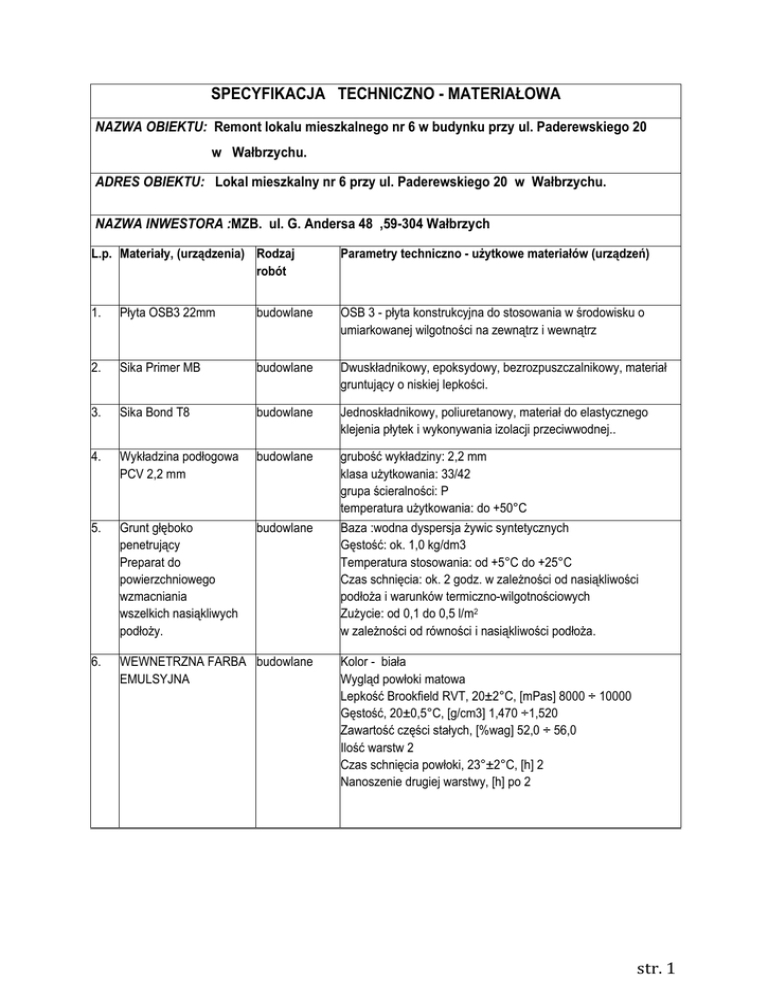 SPECYFIKACJA TECHNICZNO - MATERIAŁOWA NAZWA OBIEKTU: Remont lokalu mieszkalnego nr 6 w budynku przy ul. Paderewskiego 20 w Wałbrzychu. ADRES OBIEKTU: Lokal mieszkalny nr 6 przy ul. Paderewskiego 20 w Wałbrzychu. NAZWA INWESTORA :MZB. ul. G. Andersa 48 ,59-304 Wałbrzych L.p. Materiały, (urządzenia) Rodzaj robót Parametry techniczno - użytkowe materiałów (urządzeń) 1. Płyta OSB3 22mm budowlane OSB 3 - płyta konstrukcyjna do stosowania w środowisku o umiarkowanej wilgotności na zewnątrz i wewnątrz 2. Sika Primer MB budowlane Dwuskładnikowy, epoksydowy, bezrozpuszczalnikowy, materiał gruntujący o niskiej lepkości. 3. Sika Bond T8 budowlane Jednoskładnikowy, poliuretanowy, materiał do elastycznego klejenia płytek i wykonywania izolacji przeciwwodnej.. 4. Wykładzina podłogowa PCV 2,2 mm budowlane grubość wykładziny: 2,2 mm klasa użytkowania: 33/42 grupa ścieralności: P temperatura użytkowania: do +50°C 5. Grunt głęboko penetrujący Preparat do powierzchniowego wzmacniania wszelkich nasiąkliwych podłoży. budowlane Baza :wodna dyspersja żywic syntetycznych Gęstość: ok. 1,0 kg/dm3 Temperatura stosowania: od +5°C do +25°C Czas schnięcia: ok. 2 godz. w zależności od nasiąkliwości podłoża i warunków termiczno-wilgotnościowych Zużycie: od 0,1 do 0,5 l/m2 w zależności od równości i nasiąkliwości podłoża. 6. WEWNETRZNA FARBA budowlane EMULSYJNA Kolor - biała Wygląd powłoki matowa Lepkość Brookfield RVT, 20±2°C, [mPas] 8000 ÷ 10000 Gęstość, 20±0,5°C, [g/cm3] 1,470 ÷1,520 Zawartość części stałych, [%wag] 52,0 ÷ 56,0 Ilość warstw 2 Czas schnięcia powłoki, 23°±2°C, [h] 2 Nanoszenie drugiej warstwy, [h] po 2 str. 1 7. Płyta gipsowo-kartonowa budowlane typ A 12,5mm HRAK Typ płyty: A EN 520 Reakcja na ogień zgodnie z EN 13501-1: A2-s1,d0 EN 13501-1 Współczynnik przewodzenia ciepła λ: W/(m∙K) 0,25 EN 12524 Gęstość objętościowa ■ przy grubości płyty 9,5 mm: ≥ ≥ 568 kg/m³ ■ przy grubości płyty 12,5 mm: 663 kg/m³ EN 520 Ciężar ■ przy grubości płyty 9,5 mm: ≥ 6,3 kg/m² ■ przy grubości płyty 12,5 mm: ≥ 7,1 kg/m² EN 520 Maksymalna temperatura stosowania °C ≤ 50 8. Płyta gipsowo-kartonowa budowlane 12,5mm HRAK wodoodporna. wymiary (gr./dł./szer.) [mm] 12,5/2600/1200 przepuszczalność pary wodnej μ 11 (pr EN 15283-1) odporność na uderzenia Typ I płyta o zwiększonej odporności na uderzenia wgniot <15 mm (pr EN 15283-1) wchłanianie wody GM – H1 całkowite wchłanianie wody <3% po 2 godzinach, powierzchniowe wchłanianie wody <100 g/m2 <(pr EN 15283-1). współczynnik przewodzenia ciepła λ [W/(mK)] 0,25 (pr EN 15283-1) reakcja na ogień A2-s1.d0 (EN 13501-1) wytrzymałość na zginanie obciążenie niszczące 12,5 m, kierunek wzdłużny >540 N, kierunek poprzeczny >210 N, (pr EN 15283-1). ciężar płyty [kg/m2] 10,8 normy, atesty EN 15283-1, atest PZH 9. Drzwi wejściowe do lokalu budowlane mieszkalnego 10 Drzwi wejściowe do pokoju budowlane skrzydło wykonane jest z ramiaków MDF i drewnianych z wypełnieniem plaster miodu, obłożone obustronnie płytą HDF wymagania akustyczne: >Rw 27 dB współczynnik przenikania ciepła: U<2,6 W/m2K klasa odporności ogniowej: El 30/S 60 (Sa, Sm) wyposażone w okucia i zamki. skrzydło wykonane jest z ramiaków MDF i drewnianych z wypełnieniem plaster miodu, obłożone obustronnie płytą HDF wymagania akustyczne: >Rw 27 dB współczynnik przenikania ciepła: U<2,6 W/m2K oszklone szkło chinchila . wyposażone w okucia i zamki. str. 2 11 Drzwi wejściowe do łazienki budowlane skrzydło wykonane jest z ramiaków MDF i drewnianych z wypełnieniem plaster miodu, obłożone obustronnie płytą HDF wymagania akustyczne: >Rw 27 dB współczynnik przenikania ciepła: U<2,6 W/m2K oszklone szkło chinchila wyposażone w okucia i zamki. 12. Cement portlandzki budowlane zmiany objętości (Le Chatelier): < 10 mm początek czasu wiązania: > 75 minut wytrzymałość na ściskanie po 2 dniach: > 10 MPa wytrzymałość na ściskanie po 28 dniach: > 32,5 MPa < 52,5 MPa 13. Wapno hydratyzowane budowlane - 14. Klej do płytek uelastyczniona budowlane Gęstość nasypowa (suchej mieszanki)ok. 1,6 kg/dm3 Gęstość objętościowa masy (po wymieszaniu) ok. 1,45 kg/dm3 Gęstość w stanie suchym (po związaniu)ok. 1,65 kg/dm3 Proporcje mieszania (woda/sucha mieszanka) 0,21 – 0,24 l / 1 kg;1,05 – 1,2 l / 5 kg; 2,1 – 2,4 l / 10 kg 5,25 ÷ 6,00 l / 25 kg Min/max. grubość kleju: 2 mm / 10 mm Temperatura przygotowania kleju oraz podłoża i otoczenia w trakcie prac od +5 °C do +25 °C wapno czynne: > 80% wilgotność: < 2% pozostałość na sicie 0,2 mm: < 2% pozostałość na sicie 0,09 mm: < 7% głębokość wnikania: > 10 i < 50 mm 15. Klej do płytek (normalny) budowlane PN-EN 12004+A1:2012(EN 12004:2007+A1:2012) Klej do płytek, cementowy, normalnie wiążący, o zmniejszonym spływie Typ C1T do zastosowań wewnętrznych, na ściany i podłogi ,Klasa reakcji na ogień A1 WT A1fl WT Wytrzymałość złącza - przyczepność początkowa ≥ 0,5 N/mm² 16. Cegła ceramiczna pełna budowlane zamurowania otworów - cegłą pełną klasy 15 Mpa na zaprawie cementowo - wapiennej klasy M5 Grubość 7mm nasiąkliwość wodna: E < 0,5% wytrzymałość na zginanie: min. 35 MPa odporność na ścieranie wgłębne: max 175 mm3 skuteczność antypoślizgowa: grupa NPD, R9-R12 17. Płytki podłogowe ceramiczne budowlane 18. Okno PCV białe budowlane okno z PVC o współczynniku U całego okna 1,6 W/m2K i U szyby 1,1 W/m2K z nawiewnikiem -- system pięciokomorowy o szerokości 73 mm (z zachowaniem kształtu, podziału i wymiarów), białe szorowanie: kl. III str. 3 19. Rura kanalizacyjna PCV sanitarne Rura HT PCV łączona na uszczelkę Ø110x2,6, Ø 50 x2,5, Ø 32x1,8 Kocioł stalowy o mocy 5kW z układem zabezpieczającym i pompowy zgodnie z rysunkiem nr 6 20 Kocioł na paliwo stałe o mocy 5kW Centralne ogrzewanie 21 Rury miedziane Centralne ogrzewania S