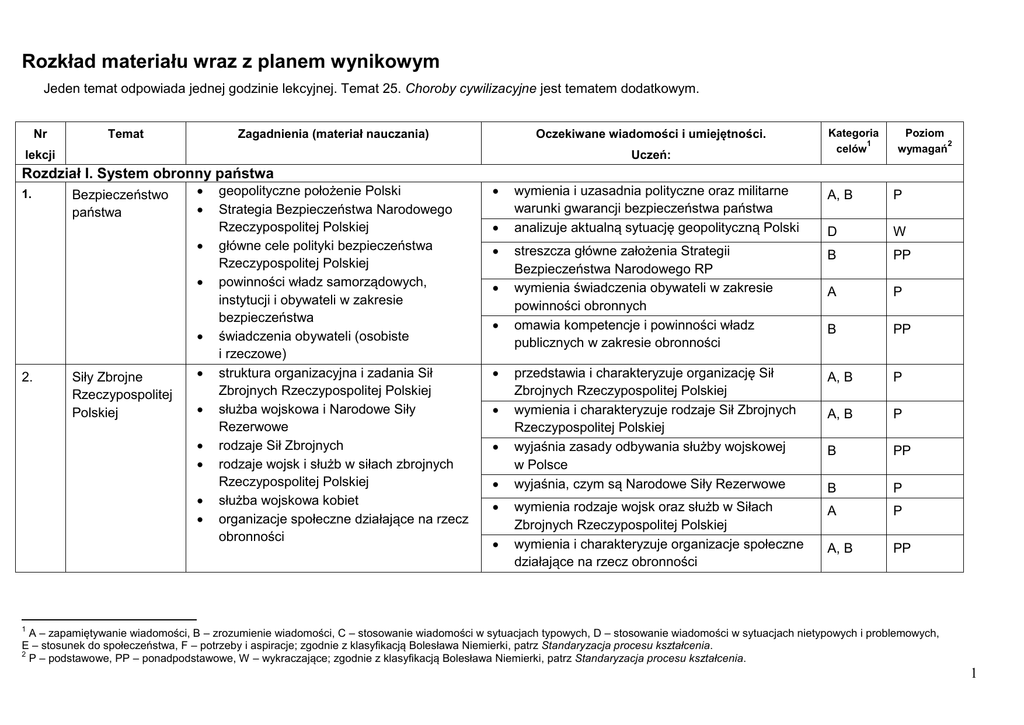 Rozkład materiału wraz z planem wynikowym Jeden temat odpowiada jednej godzinie lekcyjnej. Temat 25. Choroby cywilizacyjne jest tematem dodatkowym. Nr Zagadnienia (materiał nauczania) Temat Oczekiwane wiadomości i umiejętności. Uczeń: lekcji Kategoria 1 celów Poziom 2 wymagań Rozdział I. System obronny państwa 1. Bezpieczeństwo państwa 2. Siły Zbrojne Rzeczypospolitej Polskiej geopolityczne położenie Polski Strategia Bezpieczeństwa Narodowego Rzeczypospolitej Polskiej główne cele polityki bezpieczeństwa Rzeczypospolitej Polskiej powinności władz samorządowych, instytucji i obywateli w zakresie bezpieczeństwa świadczenia obywateli (osobiste i rzeczowe) struktura organizacyjna i zadania Sił Zbrojnych Rzeczypospolitej Polskiej służba wojskowa i Narodowe Siły Rezerwowe rodzaje Sił Zbrojnych rodzaje wojsk i służb w siłach zbrojnych Rzeczypospolitej Polskiej służba wojskowa kobiet organizacje społeczne działające na rzecz obronności wymienia i uzasadnia polityczne oraz militarne warunki gwarancji bezpieczeństwa państwa analizuje aktualną sytuację geopolityczną Polski A, B P D W streszcza główne założenia Strategii Bezpieczeństwa Narodowego RP wymienia świadczenia obywateli w zakresie powinności obronnych omawia kompetencje i powinności władz publicznych w zakresie obronności B PP A P B PP przedstawia i charakteryzuje organizację Sił Zbrojnych Rzeczypospolitej Polskiej wymienia i charakteryzuje rodzaje Sił Zbrojnych Rzeczypospolitej Polskiej wyjaśnia zasady odbywania służby wojskowej w Polsce wyjaśnia, czym są Narodowe Siły Rezerwowe A, B P A, B P B PP B P wymienia rodzaje wojsk oraz służb w Siłach Zbrojnych Rzeczypospolitej Polskiej wymienia i charakteryzuje organizacje społeczne działające na rzecz obronności A P A, B PP 1 A – zapamiętywanie wiadomości, B – zrozumienie wiadomości, C – stosowanie wiadomości w sytuacjach typowych, D – stosowanie wiadomości w sytuacjach nietypowych i problemowych, E – stosunek do społeczeństwa, F – potrzeby i aspiracje; zgodnie z klasyfikacją Bolesława Niemierki, patrz Standaryzacja procesu kształcenia. 2 P – podstawowe, PP – ponadpodstawowe, W – wykraczające; zgodnie z klasyfikacją Bolesława Niemierki, patrz Standaryzacja procesu kształcenia. 1 Rozdział II. Ochrona ludności i obrona cywilna 3. Ochrona ofiar konfliktów zbrojnych i dóbr kultury 4. Ochrona ludności, ochrona zwierząt ruch czerwonokrzyski Polski Czerwony Krzyż konwencje prawa międzynarodowego dotyczące ochrony ofiar konfliktów zbrojnych i zdarzeń kryzysowych wybrane regulacje międzynarodowego prawa humanitarnego ochrona dóbr kultury obrona cywilna (OC) indywidualne i zbiorowe środki ochrony ludności sposoby ochrony zwierząt opisuje, czym są organizacje czerwonokrzyskie i wymienia ich główne zadania charakteryzuje cele Polskiego Czerwonego Krzyża wyjaśnia podstawowe zasady międzynarodowego prawa humanitarnego na przykładzie wybranych regulacji prawnych identyfikuje obiekty opatrzone międzynarodowymi znakami ochrony zabytków B, E PP B, E P B, E PP C P wyjaśnia, jak prawidłowo zabezpieczyć dobra kultury w razie zagrożenia B, PP A, B PP omawia strukturę organizacyjną OC i sposób jej działania wymienia podstawowe środki ochrony ludności A P wymienia sposoby i środki ochrony zwierząt A P wyjaśnia znaczenie zastępczych budowli ochronnych omawia zasady ewakuacji ludności, środków materiałowych i zwierząt wyjaśnia, jak się zachować w razie ogłoszenia ewakuacji potrafi ewakuować się z budynku w trybie alarmowym omawia sposób funkcjonowania systemu wykrywania i alarmowania rozpoznaje sygnały alarmowe i wyjaśnia, jak należy się zachować po ogłoszeniu określonego alarmu B PP B PP B P C P A PP C P 5. System wykrywania i alarmowania system wykrywania i alarmowania (SWiAl) środki alarmowe systemy alarmowania alarmy i sygnały alarmowe 2 alarm i ewakuacja zachowanie ludności po ogłoszeniu alarmu oraz po jego odwołaniu C, B P rozpoznaje sygnały informujące o odwołaniu alarmu i wyjaśnia, jak zachować się w sytuacji odwołania alarmu wskazuje drogi ewakuacji w szkole C P wymienia zagrożenia czasu pokoju A P charakteryzuje zagrożenia czasu pokoju B PP omawia sposób postępowania w razie wystąpienia poszczególnych zagrożeń wyjaśnia różnicę pomiędzy sytuacją kryzysową i stanem nadzwyczajnym omawia sposoby zapobiegania panice podczas zagrożeń uzasadnia konieczność przestrzegania zasad bezpieczeństwa własnego i innych ludzi podczas różnorodnych zagrożeń wymienia źródła zanieczyszczeń, ze szczególnym uwzględnieniem najbliższego otoczenia, np. szkoły oraz domu charakteryzuje źródła zanieczyszczeń B, E P B PP B, E P B, E PP A P B PP wymienia i charakteryzuje rodzaje toksycznych środków przemysłowych wyjaśnia, jak zapobiega się skutkom zanieczyszczeń A, B P B PP wymienia źródła zagrożeń w najbliższym otoczeniu szkoły oraz domu A P charakteryzuje źródła zagrożeń w najbliższym otoczeniu szkoły oraz domu omawia zasady postępowania w razie podróżowania w niesprzyjających warunkach pogodowych zimą B PP B P Rozdział III. Zagrożenia czasu pokoju 6. Źródła zagrożeń zagrożenia naturalne zagrożenia spowodowane działalnością człowieka zagrożenia społeczne postępowanie zapobiegawcze sytuacja kryzysowa i stan nadzwyczajny 7. Zanieczyszczenia źródła i rodzaje zanieczyszczeń toksyczne środki przemysłowe (TSP) zapobieganie skutkom zanieczyszczeń 8. Ekstremalne warunki pogodowe postępowanie w razie niesprzyjających warunków pogodowych zimą i latem postępowanie w razie porywistych wiatrów zachowanie w czasie burzy 3 podaje zasady zachowania się w upalne dni A P omawia sposób postępowania w wypadku ogłoszenia zagrożenia wiatrami huraganowymi streszcza zasady zachowania się w czasie burzy wymienia źródła zagrożeń pożarem, ze szczególnym uwzględnieniem najbliższego otoczenia, np