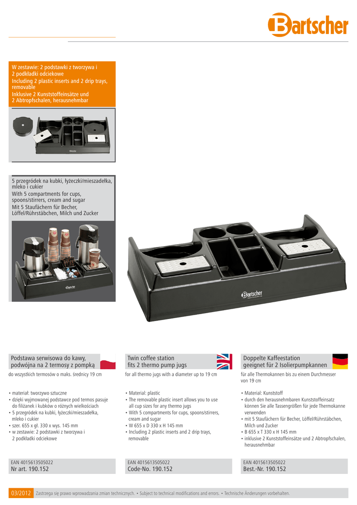 W zestawie: 2 podstawki z tworzywa i 2 podkładki odciekowe Including 2 plastic inserts and 2 drip trays, removable Inklusive 2 Kunststoffeinsätze und 2 Abtropfschalen, herausnehmbar 5 przegródek na kubki, łyżeczki/mieszadełka, mleko i cukier With 5 compartments for cups, spoons/stirrers, cream and sugar Mit 5 Staufächern für Becher, Löffel/Rührstäbchen, Milch und Zucker Podstawa serwisowa do kawy, podwójna na 2 termosy z pompką Twin coffee station fits 2 thermo pump jugs Doppelte Kaffeestation geeignet für 2 Isolierpumpkannen do wszystkich termosów o maks. średnicy 19 cm for all thermo jugs with a diameter up to 19 cm für alle Thermokannen bis zu einem Durchmesser von 19 cm • materiał: tworzywo sztuczne • dzięki wyjmowanej podstawce pod termos pasuje do filiżanek i kubków o różnych wielkościach • 5 przegródek na kubki, łyżeczki/mieszadełka, mleko i cukier • szer. 655 x gł. 330 x wys. 145 mm • w zestawie: 2 podstawki z tworzywa i 2 podkładki odciekowe • Material: plastic • The removable plastic insert allows you to use all cup sizes for any thermo jugs • With 5 compartments for cups, spoons/stirrers, cream and sugar • W 655 x D 330 x H 145 mm • Including 2 plastic inserts and 2 drip trays, removable • Material: Kunststoff • durch den herausnehmbaren Kunststoffeinsatz können Sie alle Tassengrößen für jede Thermokanne verwenden • mit 5 Staufächern für Becher, Löffel/Rührstäbchen, Milch und Zucker • B 655 x T 330 x H 145 mm • inklusive 2 Kunststoffeinsätze und 2 Abtropfschalen, herausnehmbar EAN 4015613505022 Nr art. 190.152 03/2012 EAN 4015613505022 Code-No. 190.152 EAN 4015613505022 Best.-Nr. 190.152 Zastrzega się prawo wprowadzania zmian technicznych. • Subject to technical modifications and errors. • Technische Änderungen vorbehalten.