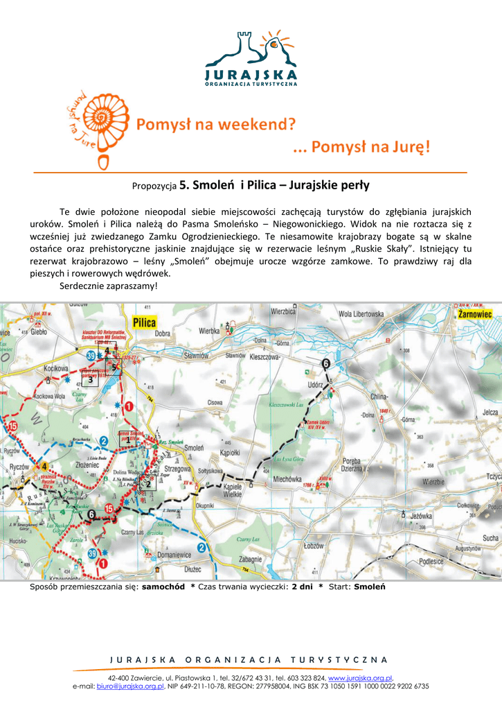 Propozycja 5. Smoleń i Pilica – Jurajskie perły Te dwie położone nieopodal siebie miejscowości zachęcają turystów do zgłębiania jurajskich uroków. Smoleń i Pilica należą do Pasma Smoleńsko – Niegowonickiego. Widok na nie roztacza się z wcześniej już zwiedzanego Zamku Ogrodzienieckiego. Te niesamowite krajobrazy bogate są w skalne ostańce oraz prehistoryczne jaskinie znajdujące się w rezerwacie leśnym „Ruskie Skały”. Istniejący tu rezerwat krajobrazowo – leśny „Smoleń” obejmuje urocze wzgórze zamkowe. To prawdziwy raj dla pieszych i rowerowych wędrówek. Serdecznie zapraszamy! Sposób przemieszczania się: samochód * Czas trwania wycieczki: 2 dni * Start: Smoleń J U R A J S K A O R G A N I Z A C J A T U R Y S T Y C Z N A 42-400 Zawiercie, ul. Piastowska 1, tel. 32/672 43 31, tel. 603 323 824, www.jurajska.org.pl, e-mail: [email protected], NIP 649-211-10-78, REGON: 277958004, ING BSK 73 1050 1591 1000 0022 9202 6735 Dzień I – Smoleń http://www.it-pjura.pl/pl/jaskinie.ph?go=bisnik http://www.polskieszlaki.pl/ http://www.ciekawe-miejsca.net/ 1. Ruiny średniowiecznego Zamku w Smoleniu http://zamki.res.pl/smolen.htm 2. Wizyta w Rezerwacie Leśnym Smoleń http://pl.wikipedia.org/wiki/Rezerwat_przyrody_Smole%C5%84 *Polecamy zielony szlak pieszy lub niebieski szlak pieszy „Jaskiniowców” Dolina Wodąca: Zegarowe Skały (jaskinia Zegarowa, Jaskinia Jasna) Skała Biśnik (jaskinia na Biśniku) Grodzisko Chłopskie Grodzisko Pańskie Propozycja na wieczór - stok narciarski SMOLEŃ-SKI. sztucznie naśnieżanie, wypożyczalnia sprzętu, instruktorzy. http://smolen-ski.pl/info/ Propozycja Gastronomiczna: Restauracja „Pod Kolumnami” http://www.podkolumnami.pl/restauracja.html Propozycja Noclegu: Ośrodek Wypoczynkowy Dworek Jurajski http://dworekjurajski.pl/kontakt.html Ośrodek rekreacyjno – wypoczynkowy „Willa u Źródeł” http://www.willauzrodel.pl/kontakt Hotel „Pod Kolumnami” http://podkolumnami.pl/index.html http://www.jura-pilica.com/?prehistoria,24 http://www.ciekawe-miejsca.net/ J U R A J S K A O R G A N I Z A C J A http://www.polskieszlaki.pl/ T U R Y S T Y C Z N A 42-400 Zawiercie, ul. Piastowska 1, tel. 32/672 43 31, tel. 603 323 824, www.jurajska.org.pl, e-mail: [email protected], NIP 649-211-10-78, REGON: 277958004, ING BSK 73 1050 1591 1000 0022 9202 6735 Dzień II – Pilica http://www.libertas.pl/palac_w_pilicy_i_tajemnicza_zjawa_w_starych_fortyfikacjach.html http://www.parafia-pilica.pl/joomla/index.php?start=28 3. Wizyta w zespole pałacowo – parkowym w Pilicy http://www.polskaniezwykla.pl/web/place/13486,pilica-zespol-palacowo-parkowy.html 4. Renesansowo – Barokowa kolegiata Jana Chrzciciela http://www.parafia-pilica.pl/joomla/ 5. Rynek w Pilicy http://www.polskaniezwykla.pl/web/place/13369,pilica-rynek-w-pilicy.html http://www.podkolumnami.pl/restauracja.html http://commons.wikimedia.org http://streemo.pl/Portal/418333,Zdjecie,hultaj47_Pilica___rynek.html J U R A J S K A O R G A N I Z A C J A http://www.jura-pilica.com/?rynek,215 T U R Y S T Y C Z N A 42-400 Zawiercie, ul. Piastowska 1, tel. 32/672 43 31, tel. 603 323 824, www.jurajska.org.pl, e-mail: [email protected], NIP 649-211-10-78, REGON: 277958004, ING BSK 73 1050 1591 1000 0022 9202 6735