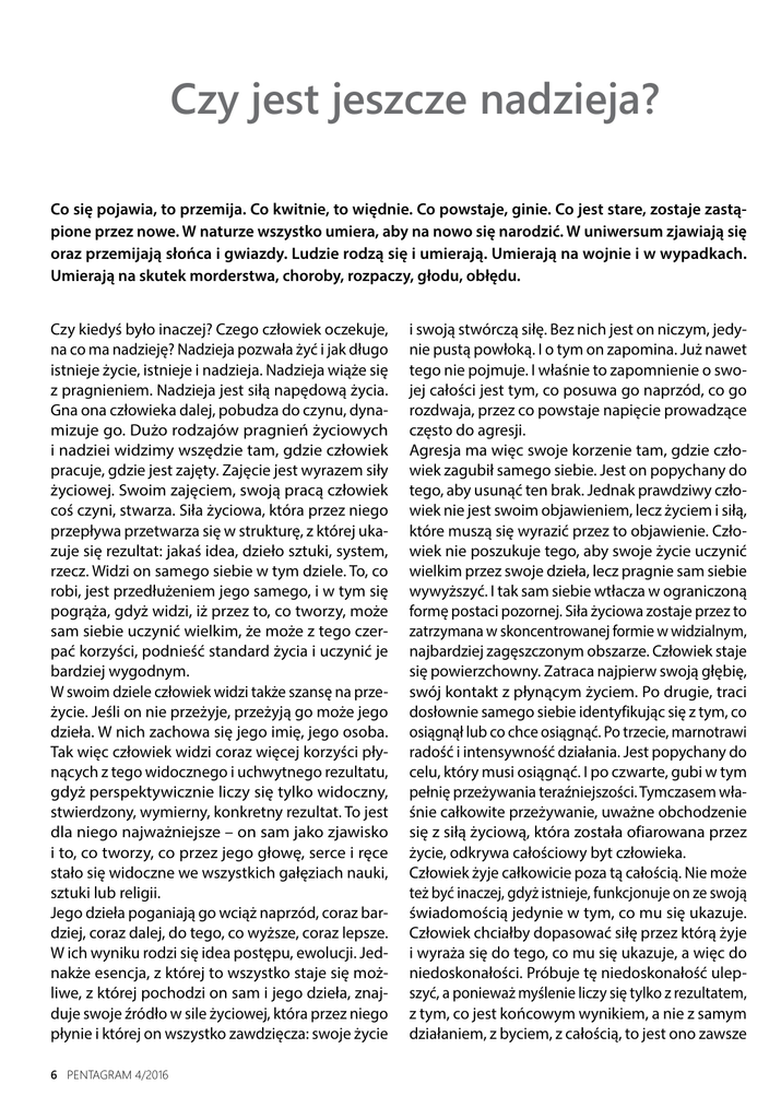 Czy jest jeszcze nadzieja? Co się pojawia, to przemija. Co kwitnie, to więdnie. Co powstaje, ginie. Co jest stare, zostaje zastąpione przez nowe. W naturze wszystko umiera, aby na nowo się narodzić. W uniwersum zjawiają się oraz przemijają słońca i gwiazdy. Ludzie rodzą się i umierają. Umierają na wojnie i w wypadkach. Umierają na skutek morderstwa, choroby, rozpaczy, głodu, obłędu. Czy kiedyś było inaczej? Czego człowiek oczekuje, na co ma nadzieję? Nadzieja pozwała żyć i jak długo istnieje życie, istnieje i nadzieja. Nadzieja wiąże się z pragnieniem. Nadzieja jest siłą napędową życia. Gna ona człowieka dalej, pobudza do czynu, dynamizuje go. Dużo rodzajów pragnień życiowych i nadziei widzimy wszędzie tam, gdzie człowiek pracuje, gdzie jest zajęty. Zajęcie jest wyrazem siły życiowej. Swoim zajęciem, swoją pracą człowiek coś czyni, stwarza. Siła życiowa, która przez niego przepływa przetwarza się w strukturę, z której ukazuje się rezultat: jakaś idea, dzieło sztuki, system, rzecz. Widzi on samego siebie w tym dziele. To, co robi, jest przedłużeniem jego samego, i w tym się pogrąża, gdyż widzi, iż przez to, co tworzy, może sam siebie uczynić wielkim, że może z tego czerpać korzyści, podnieść standard życia i uczynić je bardziej wygodnym. W swoim dziele człowiek widzi także szansę na przeżycie. Jeśli on nie przeżyje, przeżyją go może jego dzieła. W nich zachowa się jego imię, jego osoba. Tak więc człowiek widzi coraz więcej korzyści płynących z tego widocznego i uchwytnego rezultatu, gdyż perspektywicznie liczy się tylko widoczny, stwierdzony, wymierny, konkretny rezultat. To jest dla niego najważniejsze – on sam jako zjawisko i to, co tworzy, co przez jego głowę, serce i ręce stało się widoczne we wszystkich gałęziach nauki, sztuki lub religii. Jego dzieła poganiają go wciąż naprzód, coraz bardziej, coraz dalej, do tego, co wyższe, coraz lepsze. W ich wyniku rodzi się idea postępu, ewolucji. Jednakże esencja, z której to wszystko staje się możliwe, z której pochodzi on sam i jego dzieła, znajduje swoje źródło w sile życiowej, która przez niego płynie i której on wszystko zawdzięcza: swoje życie 6 PENTAGRAM 4/2016 i swoją stwórczą siłę. Bez nich jest on niczym, jedynie pustą powłoką. I o tym on zapomina. Już nawet tego nie pojmuje. I właśnie to zapomnienie o swojej całości jest tym, co posuwa go naprzód, co go rozdwaja, przez co powstaje napięcie prowadzące często do agresji. Agresja ma więc swoje korzenie tam, gdzie człowiek zagubił samego siebie. Jest on popychany do tego, aby usunąć ten brak. Jednak prawdziwy człowiek nie jest swoim objawieniem, lecz życiem i siłą, które muszą się wyrazić przez to objawienie. Człowiek nie poszukuje tego, aby swoje życie uczynić wielkim przez swoje dzieła, lecz pragnie sam siebie wywyższyć. I tak sam siebie wtłacza w ograniczoną formę postaci pozornej. Siła życiowa zostaje przez to zatrzymana w skoncentrowanej formie w widzialnym, najbardziej zagęszczonym obszarze. Człowiek staje się powierzchowny. Zatraca najpierw swoją głębię, swój kontakt z płynącym życiem. Po drugie, traci dosłownie samego siebie identyfikując się z tym, co osiągnął lub co chce osiągnąć. Po trzecie, marnotrawi radość i intensywność działania. Jest popychany do celu, który musi osiągnąć. I po czwarte, gubi w tym pełnię przeżywania teraźniejszości. Tymczasem właśnie całkowite przeżywanie, uważne obchodzenie się z siłą życiową, która została ofiarowana przez życie, odkrywa całościowy byt człowieka. Człowiek żyje całkowicie poza tą całością. Nie może też być inaczej, gdyż istnieje, funkcjonuje on ze swoją świadomością jedynie w tym, co mu się ukazuje. Człowiek chciałby dopasować siłę przez którą żyje i wyraża się do tego, co mu się ukazuje, a więc do niedoskonałości. Próbuje tę niedoskonałość ulepszyć, a ponieważ myślenie liczy się tylko z rezultatem, z tym, co jest końcowym wynikiem, a nie z samym działaniem, z byciem, z całością, to jest ono zawsze jednostronne. Nie widzi on tego, że wszystko stało się poprzez powszechną siłę życiową. Przez tę aktywność samoutwierdzania, przez którą człowiek przejmuje siłę życiową dla siebie i dopasowuje ją do swych potrzeb, powstaje oczywiście napięcie. Siła życiowa służy wszechświatu, podczas gdy człowiek chce służyć tylko pozorom, chce je utrzymać i uczynić wielkimi. Chce przywłaszczyć sobie coś, co do niego nie należy. To jest wyzysk. Dzieje się to zawsze kosztem innych. O życiu, w którym wszystko – każde stworzenie, każda rzecz – ma swoje miejsce, nie ma już mowy. Tak umierają codziennie tysiące drzew. I my chorujemy i umieramy z braku tlenu, lecz nie tylko z tego powodu. Chorujemy i umieramy przez coraz większe spustoszenie, przez zwiększającą się agresję, przez przemoc, która nie daje się powstrzymać. Jest to zastraszająca sygnatura. Odczuwamy, iż dzieje się źle, gdyż umieramy razem z drzewami. Widzimy skutki naszej działalności i poznajemy, że nie są one dobre. W tym jest teraz nasza nadzieja, w tym poznaniu, w tym zrozumieniu, pomieważ nadzieja zawsze jest powiązana ze Światłem i Życiem. Zapomnieliśmy o doskonałym Życiu, gdyż identyfikujemy siebie z naszą bardzo ograniczoną osobowością, ze zjawiskiem i z tym, co ono tworzy i czyni. Czy tak musi już pozostać? Również i rzeki umierają. A z rzekami i wodą umiera także nasza krew. W wyniku pogoni człowieka za tym, aby wciąż mieć coraz więcej i żeby wciąż było lepiej, pojawia się ciemność i zepsucie. Przez to coraz bardziej zostaje zachwiana równowaga. Wewnętrzne wartości – to, o co rzeczywiście chodzi – giną całkowicie i człowiek bardzo boleśnie odczuwa tę stratę. Podczas gdy umierają drzewa, rzeki, morza i oceany, ptaki, ryb