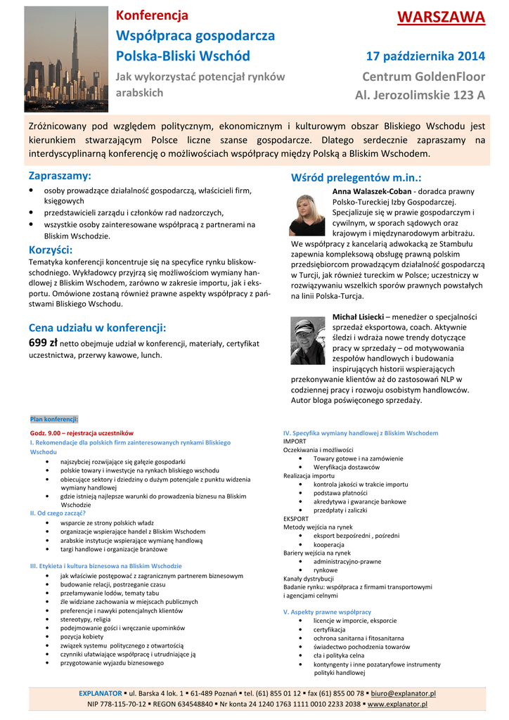 Konferencja WARSZAWA Współpraca gospodarcza Polska-Bliski Wschód 17 października 2014 Jak wykorzystać potencjał rynków arabskich Centrum GoldenFloor Al. Jerozolimskie 123 A Zróżnicowany pod względem politycznym, ekonomicznym i kulturowym obszar Bliskiego Wschodu jest kierunkiem stwarzającym Polsce liczne szanse gospodarcze. Dlatego serdecznie zapraszamy na interdyscyplinarną konferencję o możliwościach współpracy między Polską a Bliskim Wschodem. Zapraszamy: • • • osoby prowadzące działalność gospodarczą, właścicieli firm, księgowych przedstawicieli zarządu i członków rad nadzorczych, wszystkie osoby zainteresowane współpracą z partnerami na Bliskim Wschodzie. Korzyści: Tematyka konferencji koncentruje się na specyfice rynku bliskowschodniego. Wykładowcy przyjrzą się możliwościom wymiany handlowej z Bliskim Wschodem, zarówno w zakresie importu, jak i eksportu. Omówione zostaną również prawne aspekty współpracy z państwami Bliskiego Wschodu. Cena udziału w konferencji: 699 zł netto obejmuje udział w konferencji, materiały, certyfikat uczestnictwa, przerwy kawowe, lunch. Wśród prelegentów m.in.: Anna Walaszek-Coban - doradca prawny Polsko-Tureckiej Izby Gospodarczej. Specjalizuje się w prawie gospodarczym i cywilnym, w sporach sądowych oraz krajowym i międzynarodowym arbitrażu. We współpracy z kancelarią adwokacką ze Stambułu zapewnia kompleksową obsługę prawną polskim przedsiębiorcom prowadzącym działalność gospodarczą w Turcji, jak również tureckim w Polsce; uczestniczy w rozwiązywaniu wszelkich sporów prawnych powstałych na linii Polska-Turcja. Michał Lisiecki – menedżer o specjalności sprzedaż eksportowa, coach. Aktywnie śledzi i wdraża nowe trendy dotyczące pracy w sprzedaży – od motywowania zespołów handlowych i budowania inspirujących historii wspierających przekonywanie klientów aż do zastosowań NLP w codziennej pracy i rozwoju osobistym handlowców. Autor bloga poświęconego sprzedaży. Plan konferencji: Godz. 9.00 – rejestracja uczestników I. Rekomendacje dla polskich firm zainteresowanych rynkami Bliskiego Wschodu • najszybciej rozwijające się gałęzie gospodarki • polskie towary i inwestycje na rynkach bliskiego wschodu • obiecujące sektory i dziedziny o dużym potencjale z punktu widzenia wymiany handlowej • gdzie istnieją najlepsze warunki do prowadzenia biznesu na Bliskim Wschodzie II. Od czego zacząć? • wsparcie ze strony polskich władz • organizacje wspierające handel z Bliskim Wschodem • arabskie instytucje wspierające wymianę handlową • targi handlowe i organizacje branżowe III. Etykieta i kultura biznesowa na Bliskim Wschodzie • jak właściwie postępować z zagranicznym partnerem biznesowym • budowanie relacji, postrzeganie czasu • przełamywanie lodów, tematy tabu • źle widziane zachowania w miejscach publicznych • preferencje i nawyki potencjalnych klientów • stereotypy, religia • podejmowanie gości i wręczanie upominków • pozycja kobiety • związek systemu politycznego z otwartością • czynniki ułatwiające współpracę i utrudniające ją • przygotowanie wyjazdu biznesowego IV. Specyfika wymiany handlowej z Bliskim Wschodem IMPORT Oczekiwania i możliwości • Towary gotowe i na zamówienie • Weryfikacja dostawców Realizacja importu • kontrola jakości w trakcie importu • podstawa płatności • akredytywa i gwarancje bankowe • przedpłaty i zaliczki EKSPORT Metody wejścia na rynek • eksport bezpośredni , pośredni • kooperacja Bariery wejścia na rynek • administracyjno-prawne • rynkowe Kanały dystrybucji Badanie rynku: współpraca z firmami transportowymi i agencjami celnymi V. Aspekty prawne współpracy • licencje w imporcie, eksporcie • certyfikacja • ochrona sanitarna i fitosanitarna • świadectwo pochodzenia towarów • cła i polityka celna • kontyngenty i inne pozataryfowe instrumenty polityki handlowej EXPLANATOR ul. Barska 4 lok. 1 61-489 Poznań tel. (61) 855 01 12 fax (61) 855 00 78 [email protected] NIP 778-115-70-12 REGON 634548840 Nr konta 24 1240 1763 1111 0010 2233 2038 www.explanator.pl Umowa zgłoszenie uczestnictwa Niniejszym zgłaszamy udział następujących osób w konferencji: Czytelnie wypełnione zgłoszenie prosimy przesłać faksem na nr: (61) 855 00 78 Współpraca gospodarcza Polska-Bliski Wschód Jak wykorzystać potencjał rynków arabskich Warszawa, 17 października 2014 r. 1. …………………………………………………………….. e-mail ………………………..…………………………………….. 2. …………………………………………………………….. e-mail ………………………..…………………………………….. 3. …………………………………………………………..… e-mail ………………………..…………………………………….. Nazwa firmy …………………………………………………………………………………..…………………………………….. …………………………………………………………………… NIP …………………..……………………………………..…….. Kod pocztowy ……………….….………… Miejscowość ………………………………………..……………….………. Adres …………………………………………………………….……………………………………………………………………… ………………………………………………………………………………………………..……………………………………..…….. Telefon ……………………………………………….… Faks .………………………………………..………………………….. Branża ………………………………………………….. Liczba zatrudnionych: do 2