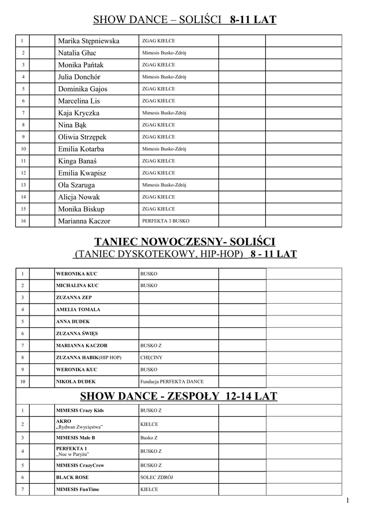 SHOW DANCE – SOLIŚCI 8-11 LAT 1 Marika Stępniewska ZGAG KIELCE 2 Natalia Głuc Mimesis Busko-Zdrój 3 Monika Pańtak ZGAG KIELCE 4 Julia Donchór Mimesis Busko-Zdrój 5 Dominika Gajos ZGAG KIELCE 6 Marcelina Lis ZGAG KIELCE 7 Kaja Kryczka Mimesis Busko-Zdrój 8 Nina Bąk ZGAG KIELCE 9 Oliwia Strzępek ZGAG KIELCE 10 Emilia Kotarba Mimesis Busko-Zdrój 11 Kinga Banaś ZGAG KIELCE 12 Emilia Kwapisz ZGAG KIELCE 13 Ola Szaruga Mimesis Busko-Zdrój 14 Alicja Nowak ZGAG KIELCE 15 Monika Biskup ZGAG KIELCE 16 Marianna Kaczor PERFEKTA 3 BUSKO TANIEC NOWOCZESNY- SOLIŚCI (TANIEC DYSKOTEKOWY, HIP-HOP) 8 - 11 LAT 1 WERONIKA KUC BUSKO 2 MICHALINA KUC BUSKO 3 ZUZANNA ZEP 4 AMELIA TOMALA 5 ANNA DUDEK 6 ZUZANNA ŚWIĘS 7 MARIANNA KACZOR BUSKO Z 8 ZUZANNA HABIK(HIP HOP) CHĘCINY 9 WERONIKA KUC BUSKO 10 NIKOLA DUDEK Fundacja PERFEKTA DANCE SHOW DANCE - ZESPOŁY 12-14 LAT 1 MIMESIS Crazy Kids BUSKO Z 2 AKRO ,,Rydwan Zwycięstwa” KIELCE 3 MIMESIS Małe B Busko Z 4 PERFEKTA 1 ,,Noc w Paryżu” BUSKO Z 5 MIMESIS CrazyCrew BUSKO Z 6 BLACK ROSE SOLEC ZDRÓJ 7 MIMESIS FunTime KIELCE 1 TANIEC NOWOCZESNY ZESPOŁY (TANIEC DYSKOTEKOWY, HIP-HOP) 12 - 14 LAT + POW.15 LAT 1 „LET`S DANCE PIERZCHNICA Społeczna Szkoła Podstawowa 2 EKSTREMUM PERFEKTA1 ,,Cheerleeaders” JĘDRZEJÓW 3 SD ONE KIELECKI TEATR TAŃCA 4 FLEX KIELCE Szkoła Tańca Dance Desing 5 EKSTREMUM PERFEKTA1 ,,Black JĘDRZEJÓW City” 6 STEP BY STEP Gimn Nr 2 Pińczów SHOW DANCE – SOLIŚCI 12 - 14 LAT 1 ŚWIĘS GABRIELA ZGAG KIELCE 2 ALEKSANDRA LALEWICZ Studio Tańca i Ruchu Scenicznego MIMESIS - BUSKO 3 OLA DUDEK Fundacja PERFEKTA DANCE 4 NATALIA PAPKA Studio Tańca i Ruchu Scenicznego MIMESIS - BUSKO 5 MILENA ZYCH CHĘCINY 6 ALEKSANDRA MORUS Studio Tańca i Ruchu Scenicznego MIMESIS - BUSKO 7 TANIEC NOWOCZESNY- SOLIŚCI (TANIEC DYSKOTEKOWY, HIP-HOP) 12 – 14 LAT 1 DOMINIKA BANACH PSCK PIŃCZÓW 2 MARIA URBAŃSKA KIELCE 3 OLA DUDEK Fundacja PERFEKTA DANCE 4 SHOW DANCE - ZESPOŁY POW. 15 LAT 1 MIMESIS HubiDance Kielce 2 PERFEKTA 1 EKSTREMUM ,,Jazz” Jędrzejów 3 ” MIMESIS Beauty BUSKO Z 2 SHOW DANCE – SOLIŚCI POW. 15 LAT 1 ALEKSANDRA PAMUŁA Studio Tańca i Ruchu Scenicznego MIMESIS - BUSKO 2 JULIA GROCHOWSKA Fundacja PERFEKTA DANCE 3 KAMILA STYRCZ Studio Tańca i Ruchu Scenicznego MIMESIS - BUSKO 4 NATALIA SOKOŁOWSKA Studio Tańca i Ruchu Scenicznego MIMESIS - BUSKO 5 DARIA KOPEĆ Fundacja PERFEKTA DANCE 6 ANNA JEWIARZ Studio Tańca i Ruchu Scenicznego MIMESIS - BUSKO 7 WIKTORIA WIECZOREK Studio Tańca i Ruchu Scenicznego MIMESIS - BUSKO TANIEC NOWOCZESNY- SOLIŚCI (TANIEC DYSKOTEKOWY, HIP-HOP) POW. 15 LAT 1 JULIA CHUDZIK Fundacja PERFEKTA DANCE 2 SYLWIA NOCKOWSKA PIŃCZÓW 3 MAŁGORZATA ŁAZOWSKA KIELCE 4 JULIA GRABOWSKA Fundacja PERFEKTA DANCE 3