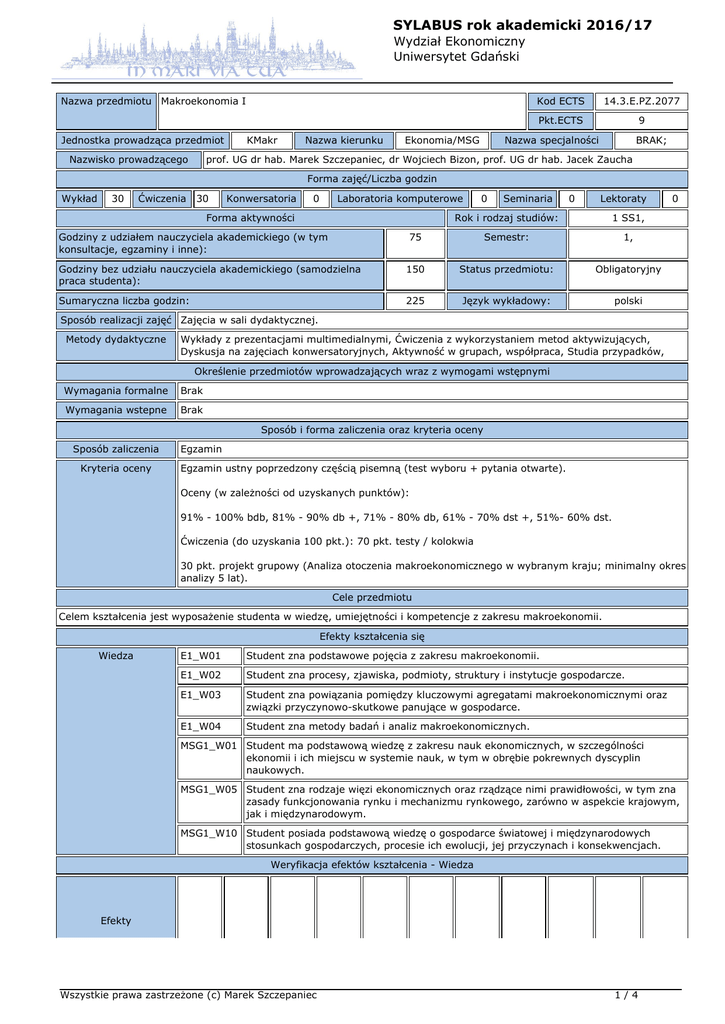 SYLABUS rok akademicki 2016/17 Wydział Ekonomiczny Uniwersytet Gdański Nazwa przedmiotu Makroekonomia I Jednostka prowadząca przedmiot Nazwisko prowadzącego KMakr Nazwa kierunku Ekonomia/MSG Kod ECTS 14.3.E.PZ.2077 Pkt.ECTS 9 Nazwa specjalności BRAK; prof. UG dr hab. Marek Szczepaniec, dr Wojciech Bizon, prof. UG dr hab. Jacek Zaucha Forma zajęć/Liczba godzin Wykład 30 Ćwiczenia 30 Konwersatoria 0 Laboratoria komputerowe Forma aktywności 0 Seminaria 0 Lektoraty Rok i rodzaj studiów: 1 SS1, 75 Semestr: 1, Godziny bez udziału nauczyciela akademickiego (samodzielna praca studenta): 150 Status przedmiotu: Obligatoryjny Sumaryczna liczba godzin: 225 Język wykładowy: polski Godziny z udziałem nauczyciela akademickiego (w tym konsultacje, egzaminy i inne): 0 Sposób realizacji zajęć Zajęcia w sali dydaktycznej. Metody dydaktyczne Wykłady z prezentacjami multimedialnymi, Ćwiczenia z wykorzystaniem metod aktywizujących, Dyskusja na zajęciach konwersatoryjnych, Aktywność w grupach, współpraca, Studia przypadków, Określenie przedmiotów wprowadzających wraz z wymogami wstępnymi Wymagania formalne Brak Wymagania wstepne Brak Sposób i forma zaliczenia oraz kryteria oceny Sposób zaliczenia Kryteria oceny Egzamin Egzamin ustny poprzedzony częścią pisemną (test wyboru + pytania otwarte). Oceny (w zależności od uzyskanych punktów): 91% - 100% bdb, 81% - 90% db +, 71% - 80% db, 61% - 70% dst +, 51%- 60% dst. Ćwiczenia (do uzyskania 100 pkt.): 70 pkt. testy / kolokwia 30 pkt. projekt grupowy (Analiza otoczenia makroekonomicznego w wybranym kraju; minimalny okres analizy 5 lat). Cele przedmiotu Celem kształcenia jest wyposażenie studenta w wiedzę, umiejętności i kompetencje z zakresu makroekonomii. Efekty kształcenia się Wiedza E1_W01 Student zna podstawowe pojęcia z zakresu makroekonomii. E1_W02 Student zna procesy, zjawiska, podmioty, struktury i instytucje gospodarcze. E1_W03 Student zna powiązania pomiędzy kluczowymi agregatami makroekonomicznymi oraz związki przyczynowo-skutkowe panujące w gospodarce. E1_W04 Student zna metody badań i analiz makroekonomicznych. MSG1_W01 Student ma podstawową wiedzę z zakresu nauk ekonomicznych, w szczególności ekonomii i ich miejscu w systemie nauk, w tym w obrębie pokrewnych dyscyplin naukowych. MSG1_W05 Student zna rodzaje więzi ekonomicznych oraz rządzące nimi prawidłowości, w tym zna zasady funkcjonowania rynku i mechanizmu rynkowego, zarówno w aspekcie krajowym, jak i międzynarodowym. MSG1_W10 Student posiada podstawową wiedzę o gospodarce światowej i międzynarodowych stosunkach gospodarczych, procesie ich ewolucji, jej przyczynach i konsekwencjach. Weryfikacja efektów kształcenia - Wiedza Efekty Wszystkie prawa zastrzeżone (c) Marek Szczepaniec 1/4 SYLABUS rok akademicki 2016/17 Wydział Ekonomiczny Uniwersytet Gdański E1_W01 X X X X X E1_W02 X X X X X E1_W03 X X X X X E1_W04 X X X MSG1_W01 X X X MSG1_W05 X X X MSG1_W10 X X X Umiejętności E1_U01 Student potrafi prawidłowo obserwować i interpretować zjawiska oraz procesy ekonomiczne. E1_U02 Student potrafi pozyskiwać dane do analizowania procesów i zjawisk gospodarczych. E1_U03 Student potrafi analizować symptomy, przyczyny i przebieg konkretnych procesów oraz zjawisk ekonomiczno-społecznych. E1_U07 Student potrafi brać udział w analizach i ocenach alternatywnych rozwiązań problemów ekonomicznych. E1_U08 Student posiada umiejętność obserwacji, rozumienia i analizowania zjawisk oraz procesów makroekonomicznych za pomocą metod naukowych. MSG1_U01 Student potrafi prawidłowo interpretować zjawiska ekonomiczne, właściwie analizować przyczyny i przebieg procesów gospodarczych, z zastosowaniem standardowych w naukach ekonomicznych narzędzi. MSG1_U03 Student potrafi interpretować podstawowe problemy i procesy współczesnej gospodarki światowej, ich przyczyny i przebieg. MSG1_U04 Student potrafi dokonywać obserwacji i analiz podstawowych procesów gospodarczych zachodzących w gospodarce otwartej, potrafi interpretować niezbędne w tym zakresie dane statystyczne oraz wskaźniki ekonomiczne, a także prognozować procesy i zjawiska gospodarcze z wykorzystaniem standardowych metod i narzędzi w naukach ekonomicznych. MSG1_U13 Student posiada umiejętność prezentowania własnego stanowiska, popierając je argumentacją opartą na wybranych teoriach, poglądach różnych autorów i/lub danych statystycznych. Weryfikacja efektów kształcenia - Umiejętności Efekty E1_U01 X X X E1_U02 X X X E1_U03 X X X E1_U07 E1_U08 X X X X X MSG1_U01 X X X X MSG1_U03 X X X X MSG1_U04 X X MSG1_U13 X X Wszystkie prawa zastrzeżone (c) Marek Szczepaniec 2/4 SYLABUS rok akademicki 2016/17 Wydział Ekonomiczny Uniwersytet Gdański Kompetencje E1_K06 Student potrafi samodzielnie uzupełniać i doskonalić nabytą wiedzę i umiejętności ekonomiczne, jest otwarty na nowe pomysły i techniki, ma skłonność do nauki każdą metodą oraz skłonność do interakcji z innymi uczestnikami procesu uczenia się. E1_K02 Student potrafi współdziałać i pracować w grupie, przyjmując w niej różne role. MSG1_K06 Student potrafi myśleć i działać w sposób przedsiębiorczy. Weryfikacja efektów kształcenia - Kompetencje Efekty E1_K06 X E1_K02 X X X X MSG1_K06 X Treści programowe 1. ISTOTA EKONOMII I NARZĘDZIA ANALIZY EKONOMICZNEJ Ekonomia jako nauka. Przedmiot zainteresowania ekonomii. Czynniki produkcji. Krzywa możliwości produkcyjnych i koszt alternatywny. Mikroekonomia i makroekonomia. Ekonomia pozytywna i ekonomia normatywna. Modele ekonomiczne. Rynek, popyt, podaż. 2. EKONOMIA W SKALI MAKRO Rynki w makrogospodarcze. Podmioty makrogospodarki. Zagregowany popyt. Zagregowana podaż. Model AD-AS. Kontrowersje wokół krzywej podaży. 3. RACHUNEK DOCHODU NARODOWEGO Pojęcie i mierniki dochodu narodowego. Obieg okrężny. System rachunków dochodu narodowego. Metody liczenia wartości produktu krajowego brutto. Wady mierników dochodu naro