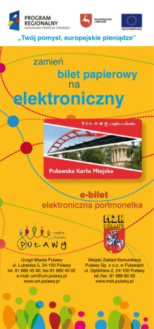 „Twój pomysł, europejskie pieniądze” zamień bilet papierowy na elektroniczny e-bilet elektroniczna portmonetka MZK Puławy Urząd Miasta Puławy ul. Lubelska 5, 24-100 Puławy tel. 81 880 45 00, fax 81 880 45 02 e-mail: [email protected] www.um.pulawy.pl Miejski Zakład Komunikacji Puławy Sp. z o.o. w Puławach ul. Dęblińska 2, 24-100 Puławy tel./fax 81 886 80 00 www.mzk.pulawy.pl Drogi użytkowniku puławskiej komunikacji miejskiej! Miasto Puławy, dbając o systematyczny rozwój oraz wizerunek miasta przyjaznego człowiekowi, realizuje w partnerstwie z Miejskim Zakładem Komunikacji – Puławy sp. z o.o. projekt zmierzający do unowocześnienia publicznej komunikacji miejskiej obejmującej teren miasta oraz 6 sąsiednich gmin, tj. Janowca, Kazimierza Dolnego, Końskowoli, Kurowa, Puław, Żyrzyna. Efekty tego przedsięwzięcia zobaczysz i odczujesz choćby podróżując jednym z 21 nowoczesnych autobusów miejskich. Nowością jest wykorzystanie teleinformatycznych rozwiązań usprawniających zarządzanie systemem komunikacji oraz pozwalających na wprowadzenie szeregu udogodnień dla pasażerów. Bilet elektroniczny to bezkontaktowa elektroniczna karta – nośnik biletów jednorazowych, okresowych oraz bezpłatnych – która docelowo zastąpi tradycyjny bilet papierowy. Kasowanie e-biletu polegać będzie na zbliżeniu karty do właściwego kasownika i dokonaniu wyboru taryfy na jego ekranie, lub tylko na zbliżeniu karty do kasownika. E-bilet będzie funkcjonować jako: •spersonalizowany (imienny ze zdjęciem, przypisany do konkretnej osoby, uprawniający do ulg), •na okaziciela (bez zdjęcia, przeznaczony dla wielu użytkowników, nie uprawniający do ulg). Posiadanie e-biletu umożliwia bezpłatne przejazdy pasażerom, którzy mają prawo do darmowych przejazdów – wystarczy za pomocą e-biletu zarejestrować każdy przejazd. Zalety e-biletu: •multifunkcjonalność: bilet okresowy oraz jednorazowy (elektroniczna portmonetka), •możliwość dokasowania przez pasażera biletów jednorazowych dla nawet 5 współpasażerów, •obniżenie kosztów podróży wynikające z dokładnego odwzorowania przebiegu wybranej trasy, • promocje cenowe dla użytkowników e-biletu, •optymalizacja rozkładów jazdy i poprawa jakości obsługi pasażerów. Uzyskanie e-biletu spersonalizowanego wiąże się z koniecznością złożenia wniosku o wydanie e-biletu (inaczej niż w przypadku biletu na okaziciela, który uzyskasz bez składania wniosku). ROZPOCZĘCIE NABORU wniosków o wydanie e-biletu przewidywane jest w połowie roku 2012. Dokładny termin zostanie ogłoszony po zakończeniu kluczowych prac inwestycyjnych. Wniosek będzie można pobrać na stronie www.mzk.pulawy.pl oraz www.um.pulawy.pl.