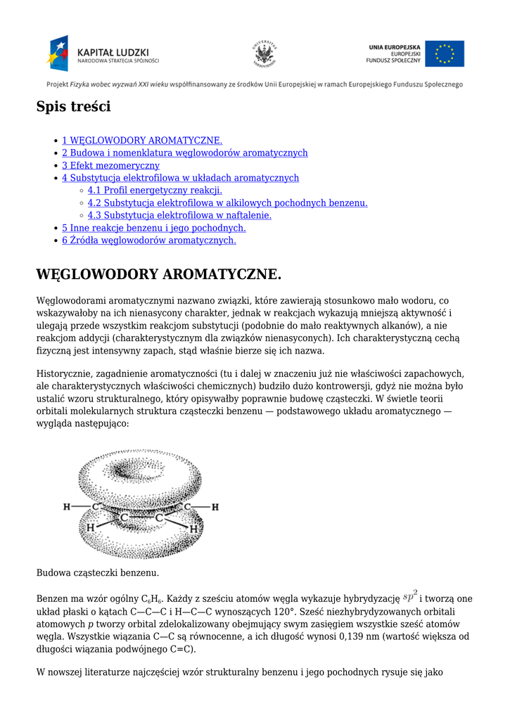 Spis treści 1 WĘGLOWODORY AROMATYCZNE. 2 Budowa i nomenklatura węglowodorów aromatycznych 3 Efekt mezomeryczny 4 Substytucja elektrofilowa w układach aromatycznych 4.1 Profil energetyczny reakcji. 4.2 Substytucja elektrofilowa w alkilowych pochodnych benzenu. 4.3 Substytucja elektrofilowa w naftalenie. 5 Inne reakcje benzenu i jego pochodnych. 6 Źródła węglowodorów aromatycznych. WĘGLOWODORY AROMATYCZNE. Węglowodorami aromatycznymi nazwano związki, które zawierają stosunkowo mało wodoru, co wskazywałoby na ich nienasycony charakter, jednak w reakcjach wykazują mniejszą aktywność i ulegają przede wszystkim reakcjom substytucji (podobnie do mało reaktywnych alkanów), a nie reakcjom addycji (charakterystycznym dla związków nienasyconych). Ich charakterystyczną cechą fizyczną jest intensywny zapach, stąd właśnie bierze się ich nazwa. Historycznie, zagadnienie aromatyczności (tu i dalej w znaczeniu już nie właściwości zapachowych, ale charakterystycznych właściwości chemicznych) budziło dużo kontrowersji, gdyż nie można było ustalić wzoru strukturalnego, który opisywałby poprawnie budowę cząsteczki. W świetle teorii orbitali molekularnych struktura cząsteczki benzenu — podstawowego układu aromatycznego — wygląda następująco: Budowa cząsteczki benzenu. Benzen ma wzór ogólny C6H6. Każdy z sześciu atomów węgla wykazuje hybrydyzację i tworzą one układ płaski o kątach C—C—C i H—C—C wynoszących 120°. Sześć niezhybrydyzowanych orbitali atomowych p tworzy orbital zdelokalizowany obejmujący swym zasięgiem wszystkie sześć atomów węgla. Wszystkie wiązania C—C są równocenne, a ich długość wynosi 0,139 nm (wartość większa od długości wiązania podwójnego C=C). W nowszej literaturze najczęściej wzór strukturalny benzenu i jego pochodnych rysuje się jako sześciokąt z okręgiem w środku. Ten okrąg symbolizuje wiązanie zdelokalizowane charakterystyczne dla układu aromatycznego i jest rysowany ciągłą bądź przerywaną linią. Można rysować wzór benzenu również jako 1,3,5-cykloheksatrien, ale należy przy tym pamiętać, że taki zapis nie odzwierciedla wyjątkowej budowy pierścienia aromatycznego. Należy dodać, że nie każdy układ cykliczny z naprzemiennym występowaniem wiązań podwójnych i pojedynczych wykazuje właściwości aromatyczne. Aby można było mówić o aromatyczności związku musi być spełnionych kilka warunków. Przede wszystkim układ cykliczny powinien być płaski. Po drugie liczba elektronów niezhybrydyzowanych p musi spełniać tzw. regułę Hückla ( elektronów, gdzie n jest liczbą naturalną). Do tego zagadnienia wrócimy jeszcze przy omawianiu związków heterocyklicznych. Na Rys. Figure 2. podane są wzory węglowodorów cyklicznych, które nie wykazują właściwości aromatycznych, gdyż nie spełniają wszystkich warunków aromatyczności. Figure 2: Przykłady pierścieniowych nienasyconych węglowodorów niearomatycznych. 1,3-cyklobutadien 1,3,5,7-cyklooktatetraen 1,3,5,7,9-cyklodekapentaen Budowa i nomenklatura węglowodorów aromatycznych Wiele zwyczajowych nazw związków aromatycznych zostało przyjętych przez nazewnictwo systematyczne. Wybrane przykłady podaje Rys. Figure 3. Nazwy węglowodorów z krótkimi łańcuchami bocznymi tworzy się dodając odpowiednie przedrostki przed nazwą benzenu, np. etylobenzen, n-propylobenzen itp. W niektórych przypadkach podyktowanych wygodą za podstawę nazwy przyjmuje się alkan (-en, -in), a pierścień benzenu traktuje się jako podstawnik i nazywa grupą fenylową. Figure 3: Wzory strukturalne i nazwy wybranych węglowodorów zawierających pierścień benzenu. benzen toluen etylobenzen izobutylobenzen o-ksylen m-ksylen p-ksylen difentylometan 1,2-difenyloetan winylobenzen (styren) allilobenzen (3fenylopropen) 2-fenylobut-2-en fenyloacetylen (fenyloetyn) Na Rys. Figure 3. dla dimetylowych pochodnych benzenu (ksylenów) pojawiła się izomeria położenia. Ogólnie dipodstawione benzeny występują w postaci trzech izomerów: orto (podstawienie 1,2, podstawniki przy sąsiednich atomach węgla), meta (podstawienie 1,3) i para (podstawienie 1,4). W samych nazwach takich izomerów wystarczy podawać tylko pierwszą literę właściwego przedrostka: o-, m-, lub p-. We wzorach skróconych resztę fenylową zaznacza się jako C6H5— bądź stosuje się skrót Ph albo . Gdy chce się zaznaczyć obecność pierścienia aromatycznego bez precyzowania jego struktury stosuje się skrót ogólny "Ar", na ogół dla odróżnienia od reszty alifatycznej, którą jak już wiemy oznaczamy jako "R". Poza układem benzenu znanych jest wiele związków wielopierścieniowych, które również wykazują właściwości aromatyczne. Ich najprostsze przykłady pokazane są na Rys. Figure 4. Należy zauważyć, że dla tych układów raczej nie stosuje się wzorów z kółkiem, ale zaznacza się umowne wiązania podwójne. Zresztą dla tych bardziej skomplikowanych pod względem rozkładu gęstości elektronowej aromatycznych orbitali zdelokalizowanych, ani jedna ani druga wersja wzoru nie oddaje poprawnie budowy związków. Figure 4: Wzory strukturalne i nazwy wybranych związków złożonych z kilku pierścieni benzenu. naftalen fenantren bifenyl antracen fluoren W przypadku bardziej rozbudowanych związków, aby łatwiej posługiwać się nazwami chemicznymi, warto zapoznać się z powszechnie używanymi nazwami grup (reszt, podstawników) wywodzących się z węglowodorów aromatycznych. Przykłady najprostszych z nich są pokazane na Rys. Figure 4. Figure 5: Nazwy podstawników zawierających pierścienie aromatyczne. fenyl benzyl fenylen (izomer orto) 1-naftyl 2-naftyl Efekt mezomeryczny W prostym ujęciu termodynamicznym mówi się, że struktura benzenu i jego analogów jest trwała, ponieważ delokalizacja elektronów obniża znacznie energię wewnętrzną. Różnica energii wewnętrznej hipotetycznego 1,3,5-cyklo