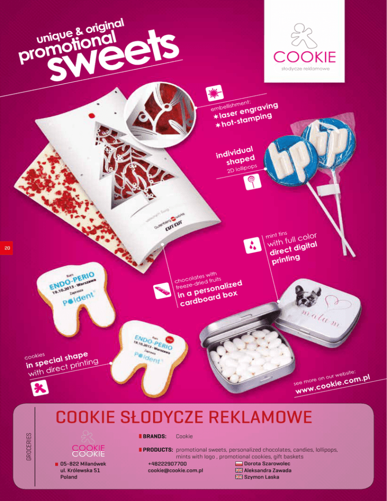 20 GROCERIES COOKIE SŁODYCZE REKLAMOWE BRANDS: Cookie PRODUCTS: promotional sweets, personalized chocolates, candies, lollipops, mints with logo , promotional cookies, gift baskets 05-822 Milanówek ul. Królewska 51 Poland +48222907700 [email protected] Dorota Szarowolec Aleksandra Zawada Szymon Laska